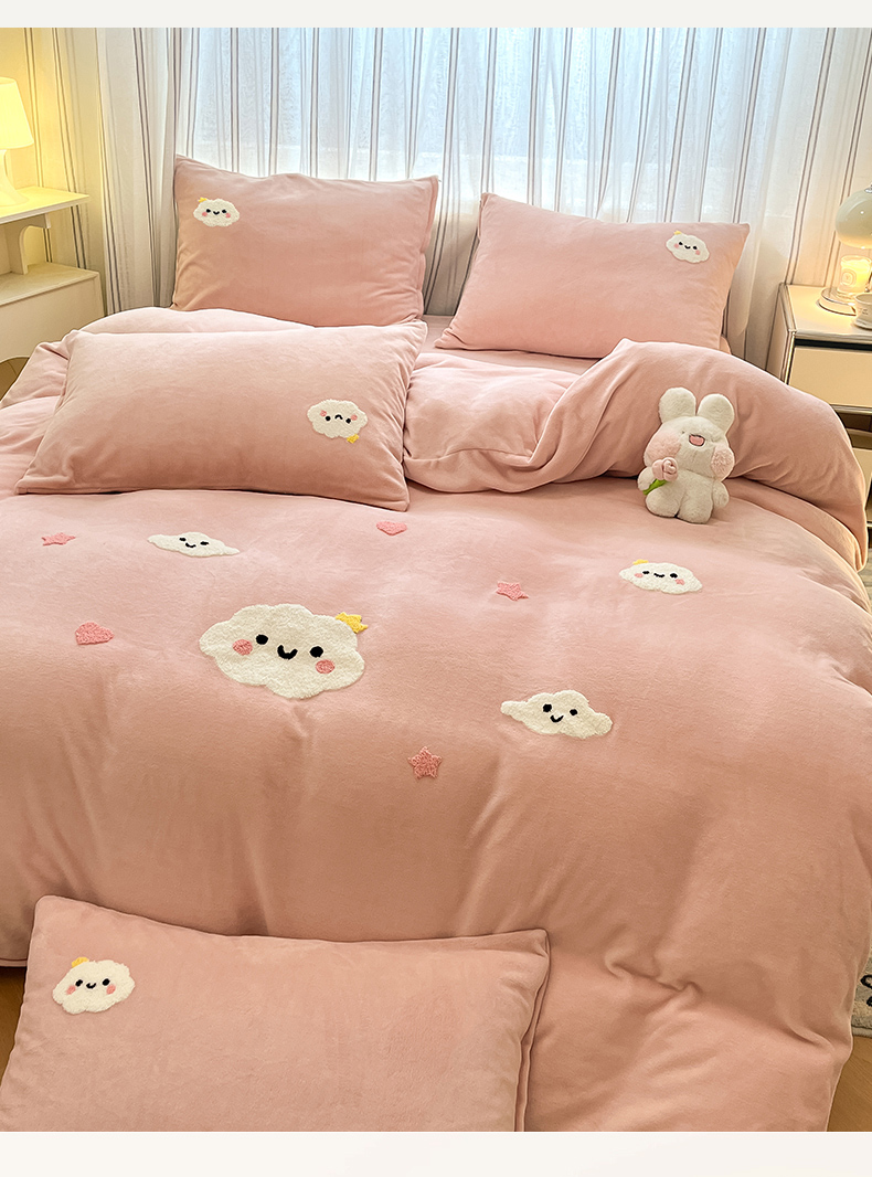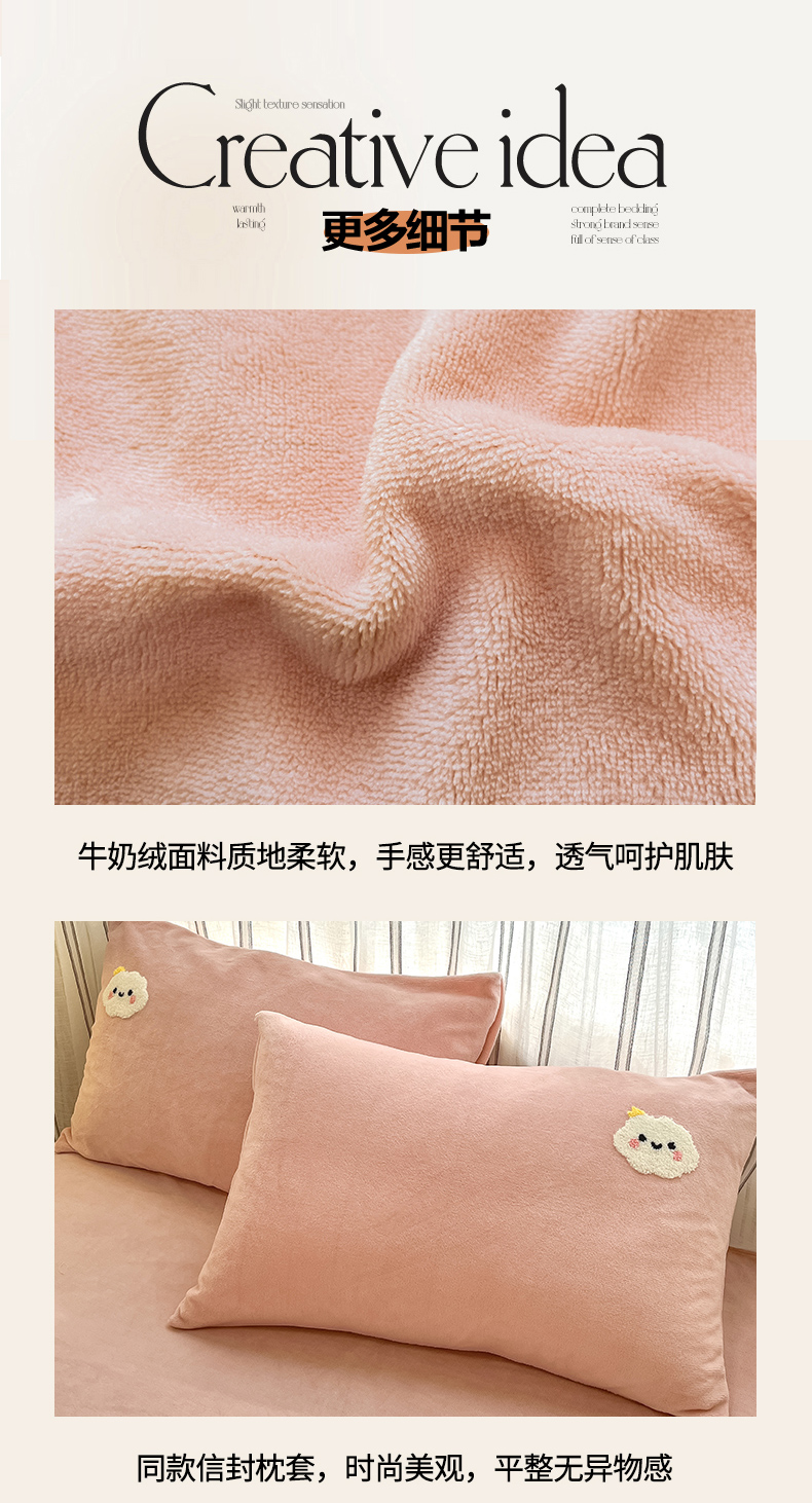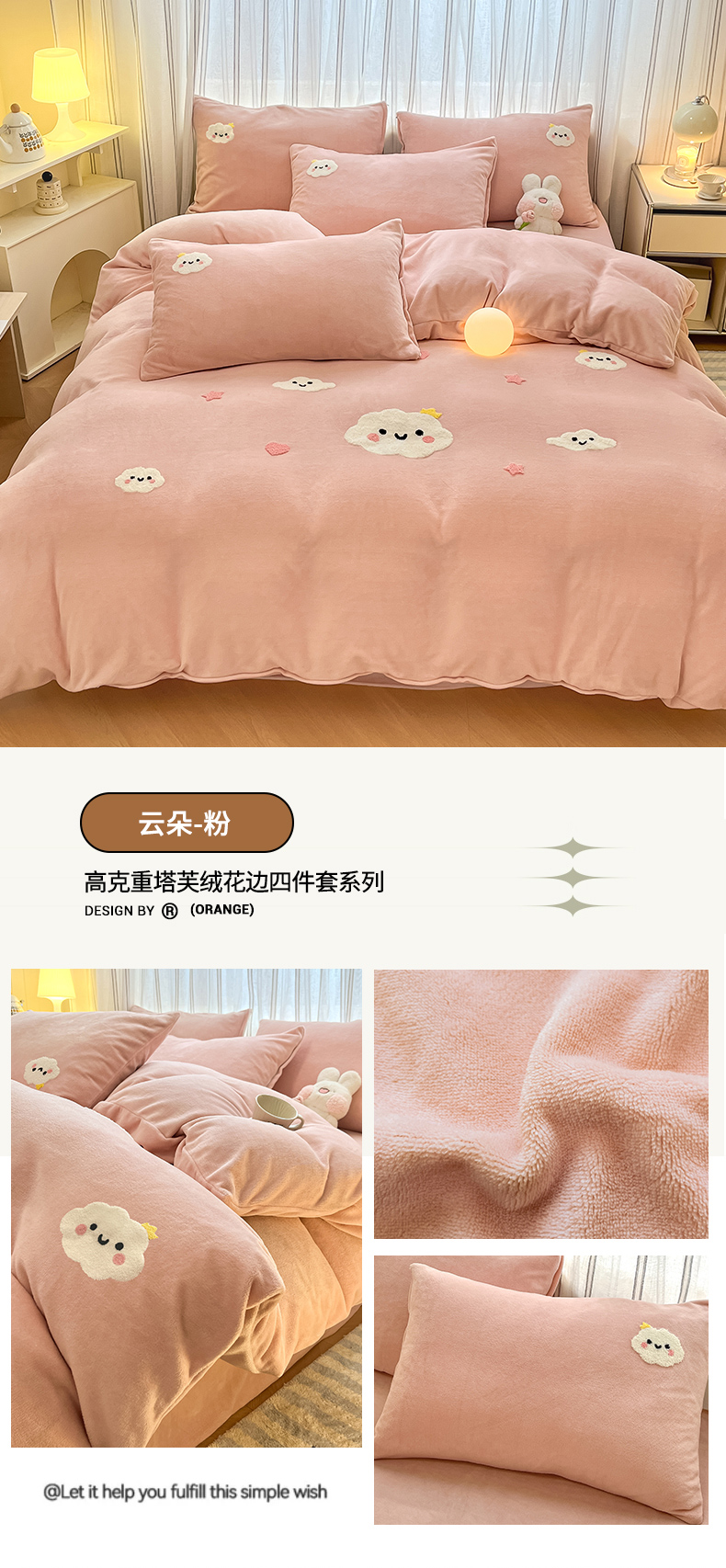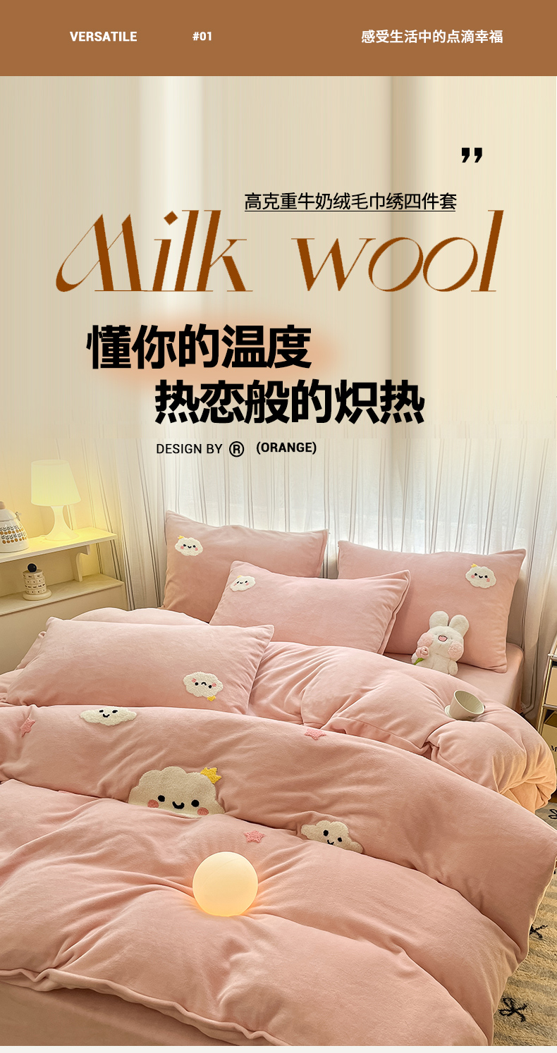 商品名称:首尔家纺 2024新款卡通牛奶绒毛巾绣四件套 云朵-粉