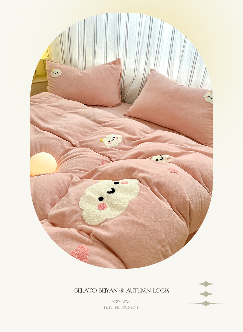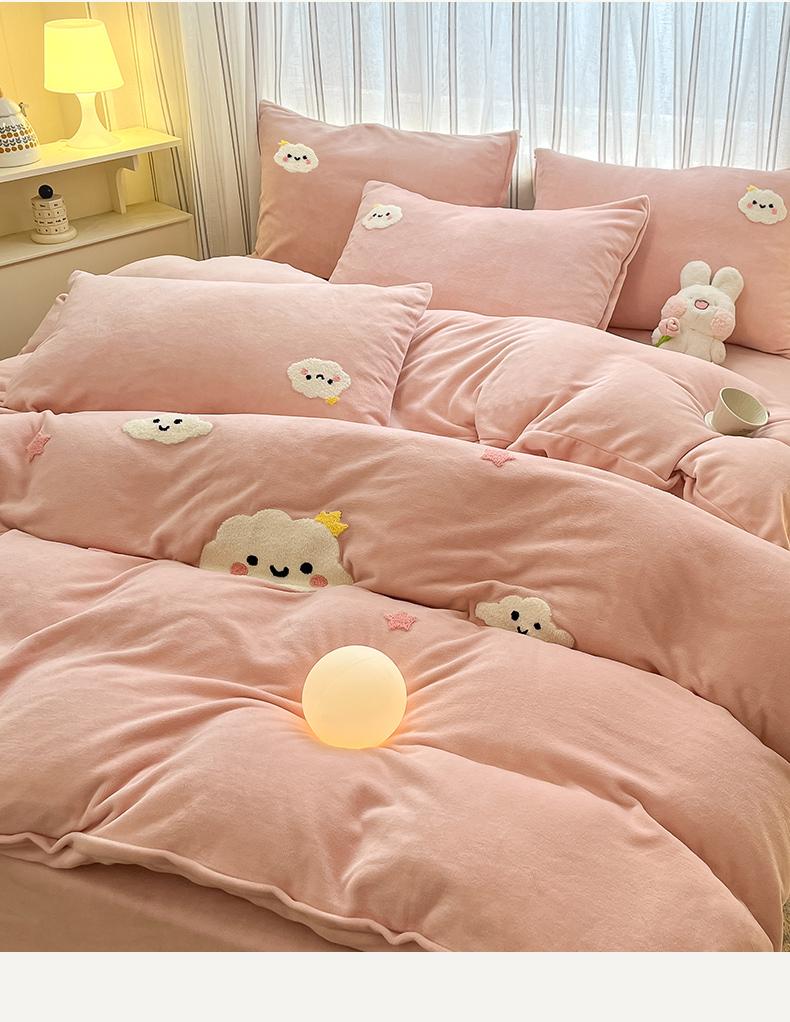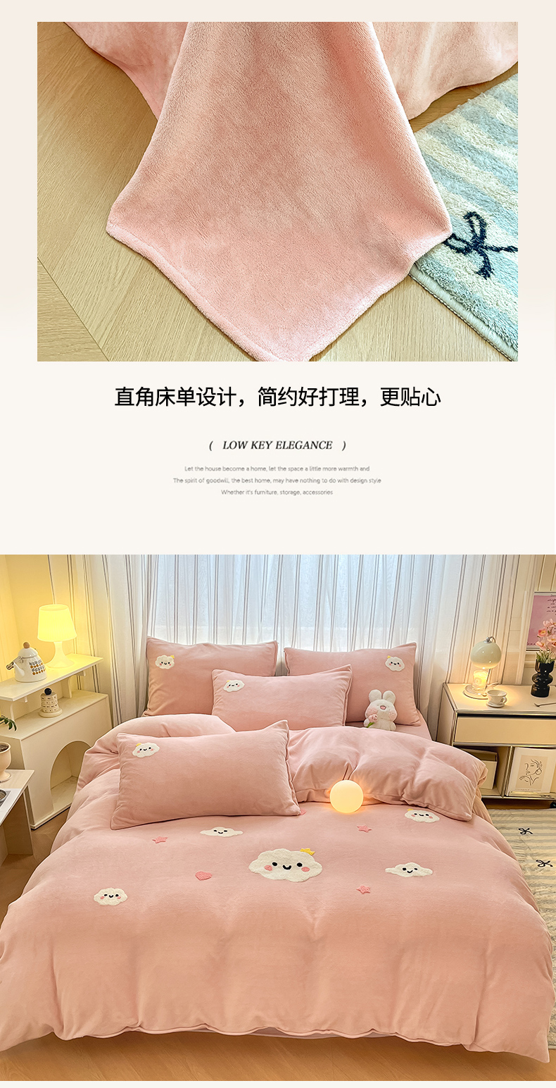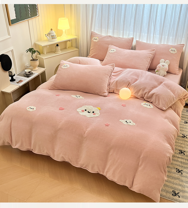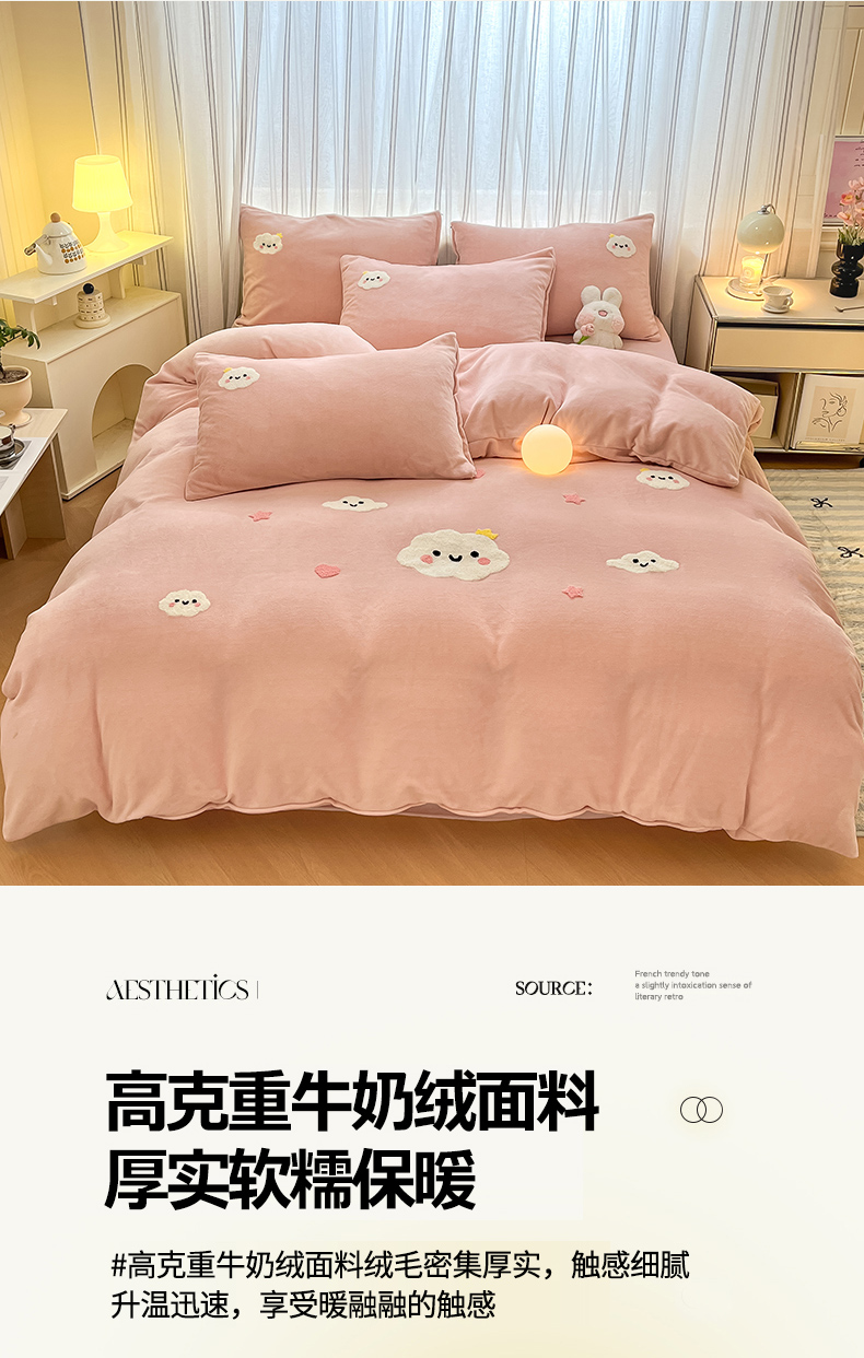 商品名称:首尔家纺 2024新款卡通牛奶绒毛巾绣四件套 云朵-粉