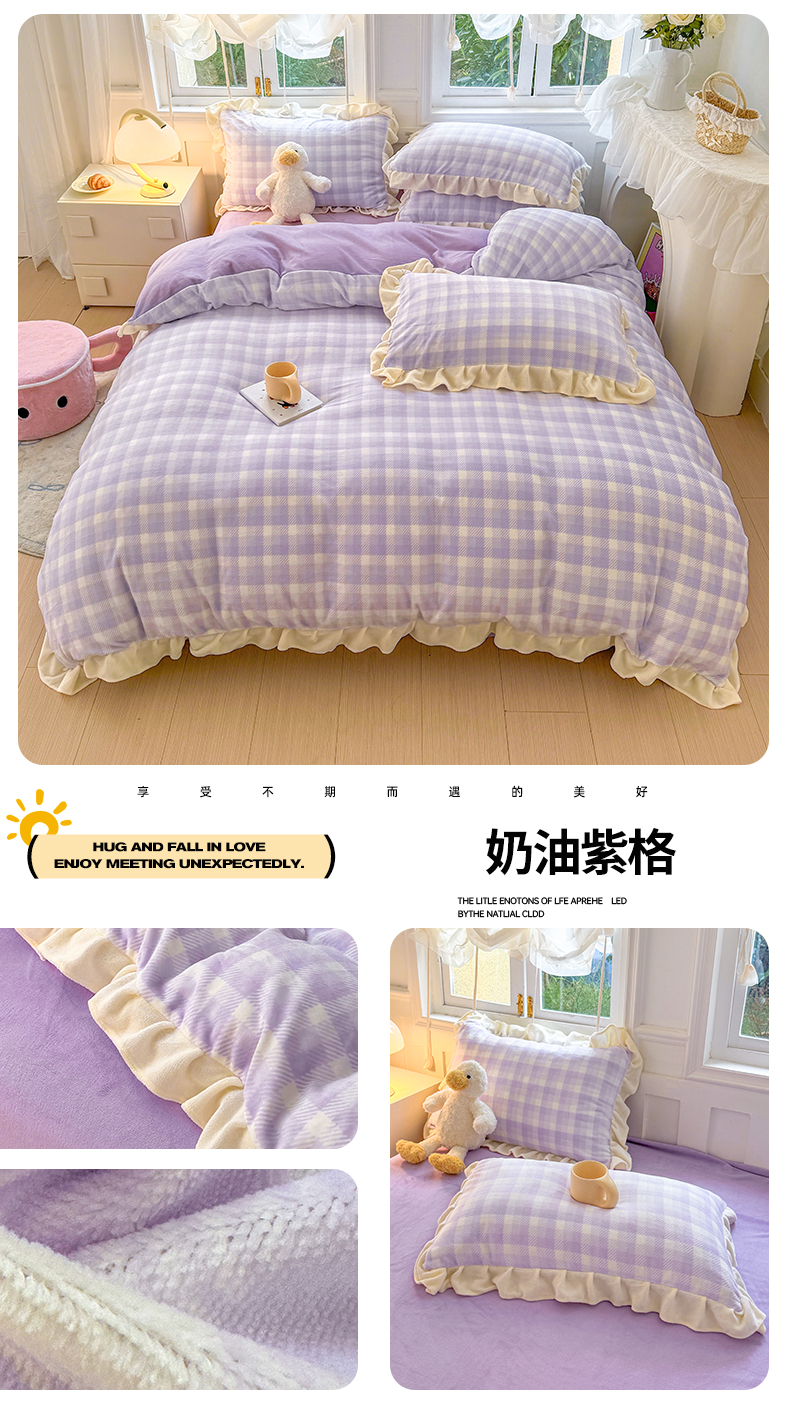 2024新款高克重韩版牛奶绒四件套-奶油格子系列 奶油紫格