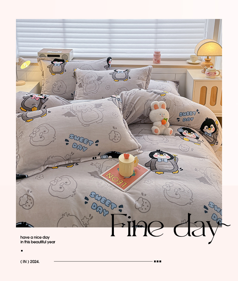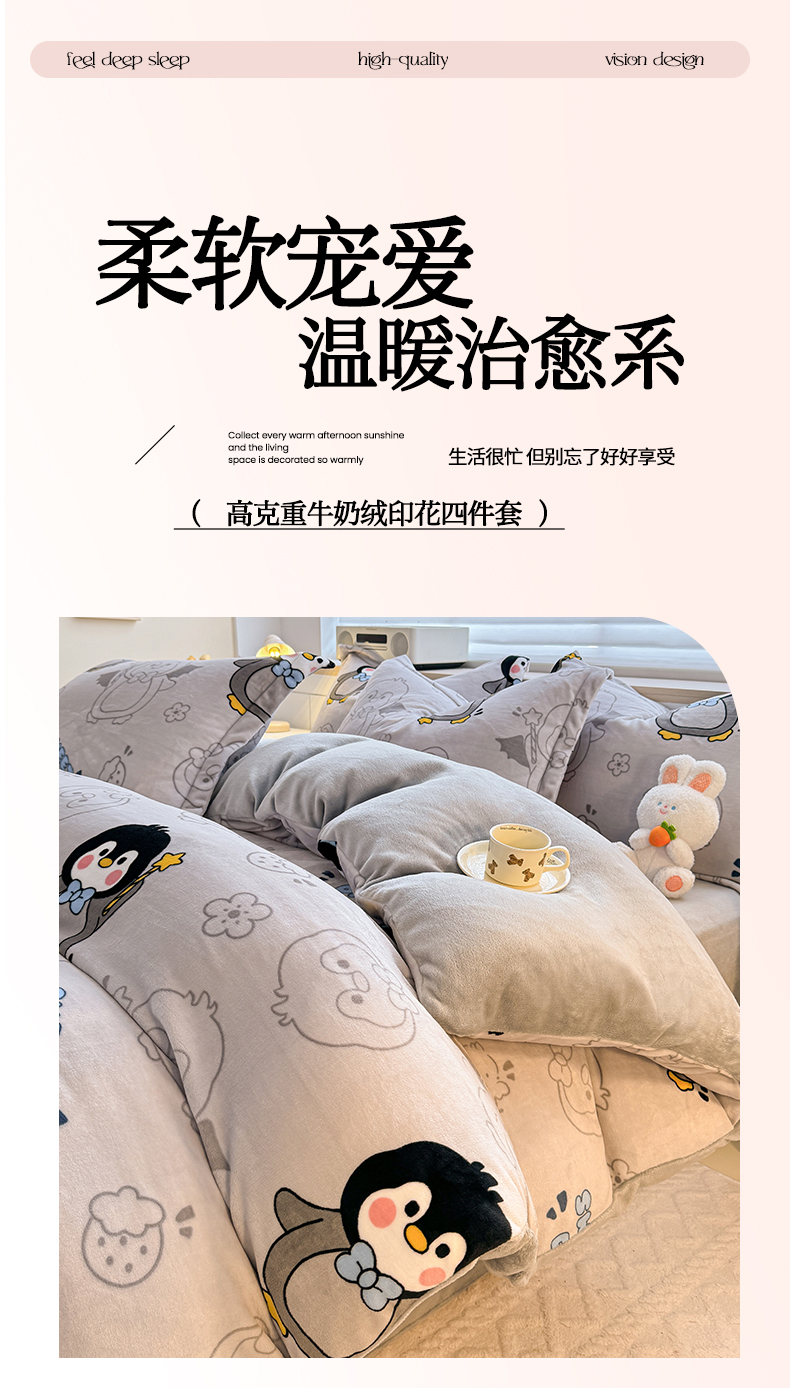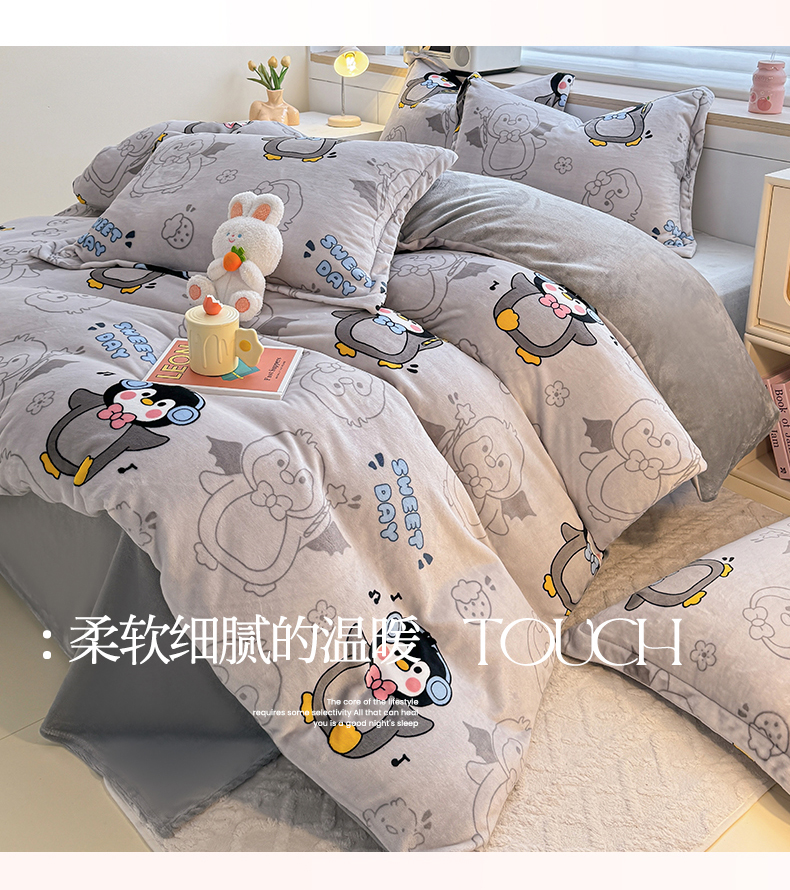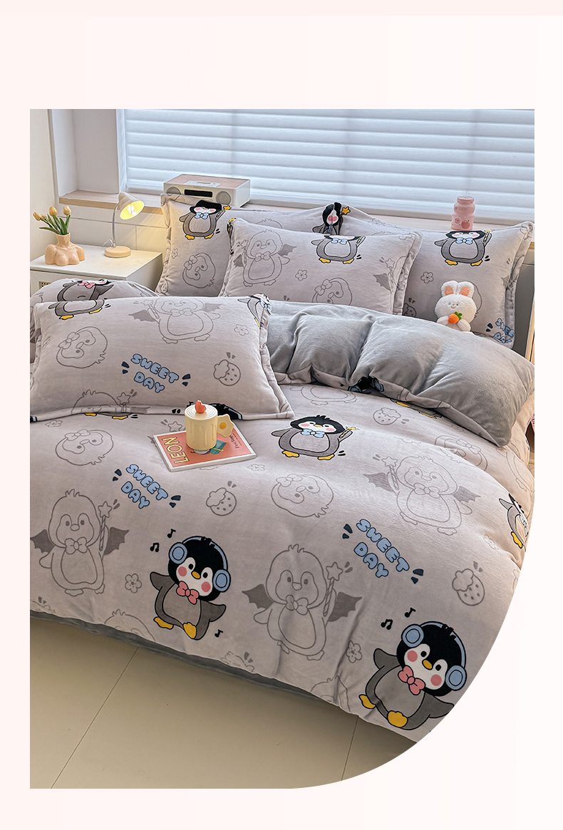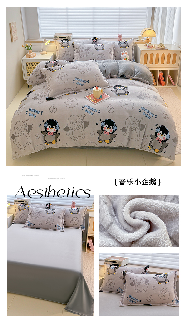 当前位置: 91家纺网 > 商品网购 > 床品套件 > 四件套 > 牛奶绒四件套 > 妖妖家纺 2024新款高克重200克印花牛奶绒四件套 音乐小企鹅