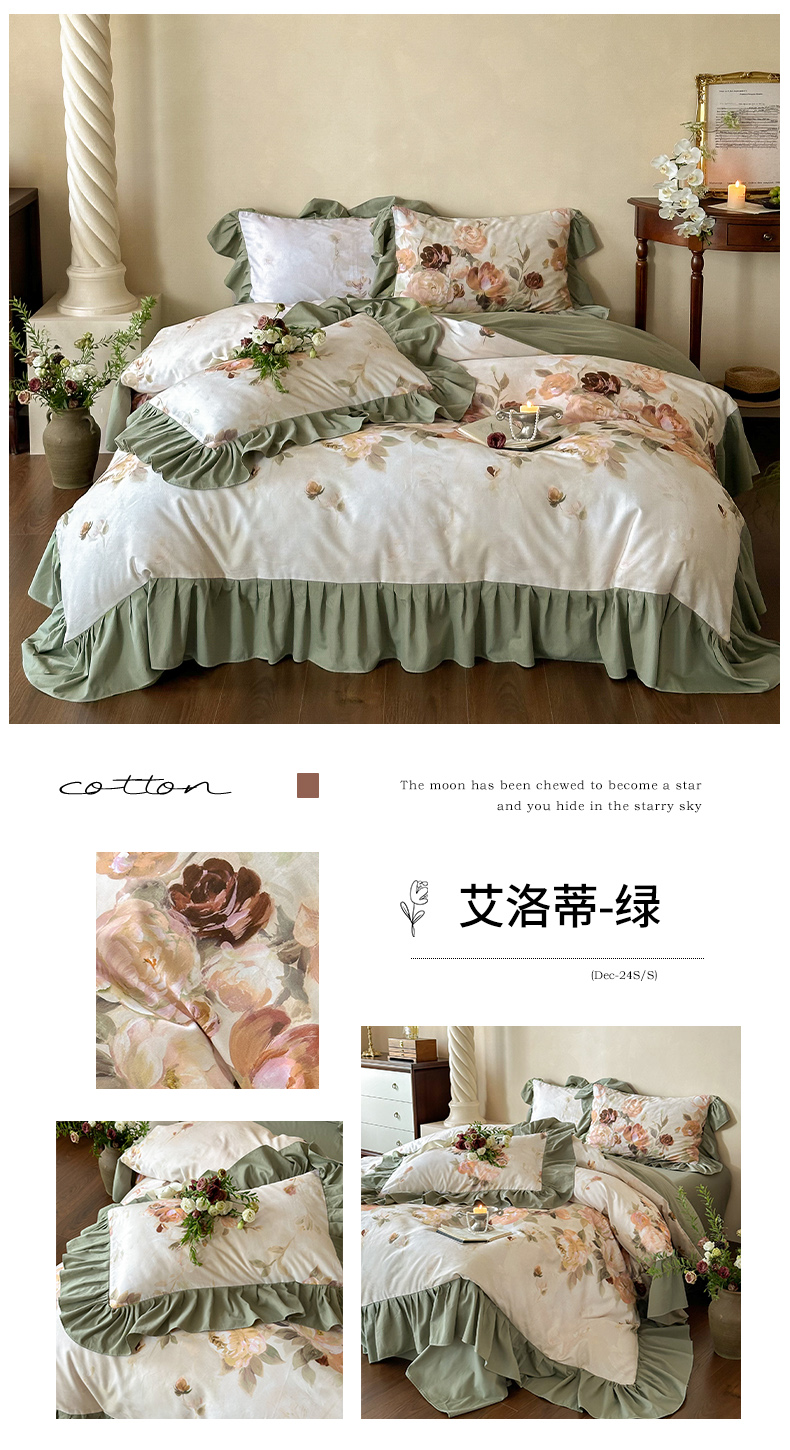 商品名称:宜代光年 2024新款法式花边全棉磨毛工艺款四件套 花漾甜心-绿