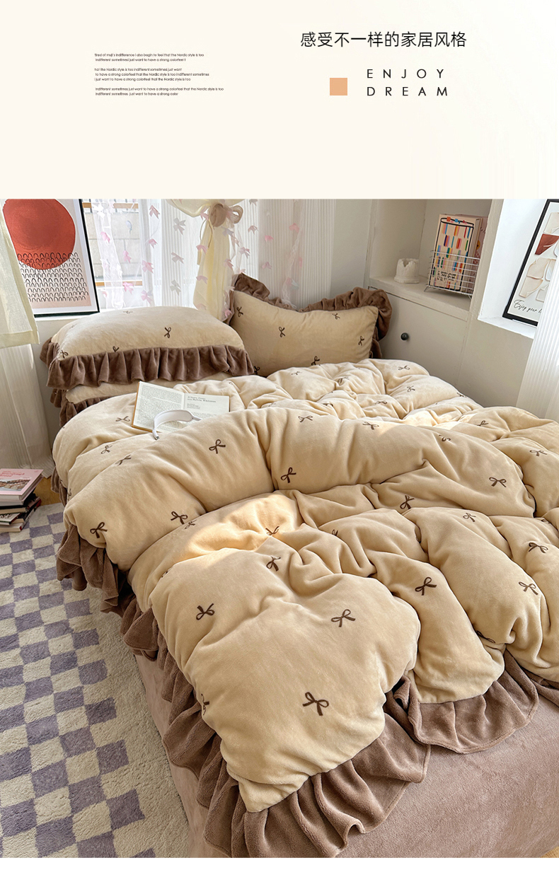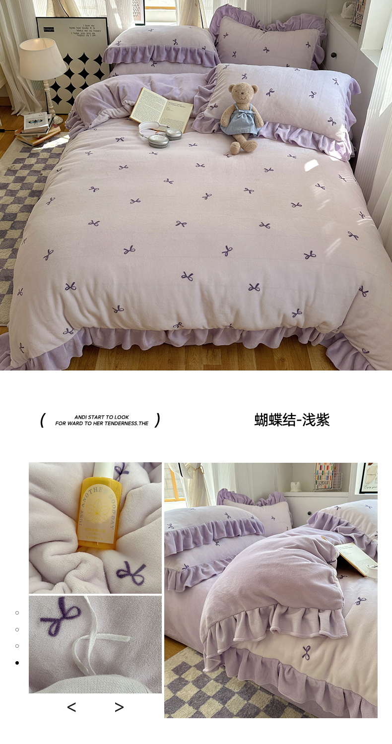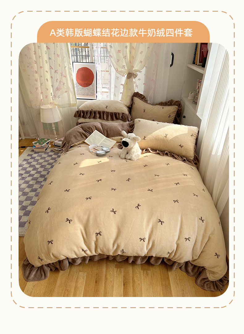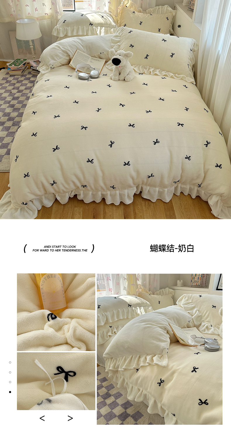 当前位置: 91家纺网 > 商品网购 > 床品套件 > 四件套 > 牛奶绒四件套 > 十里居 2024新款韩版蝴蝶结花边款牛奶绒四件套 蝴蝶结-黑白