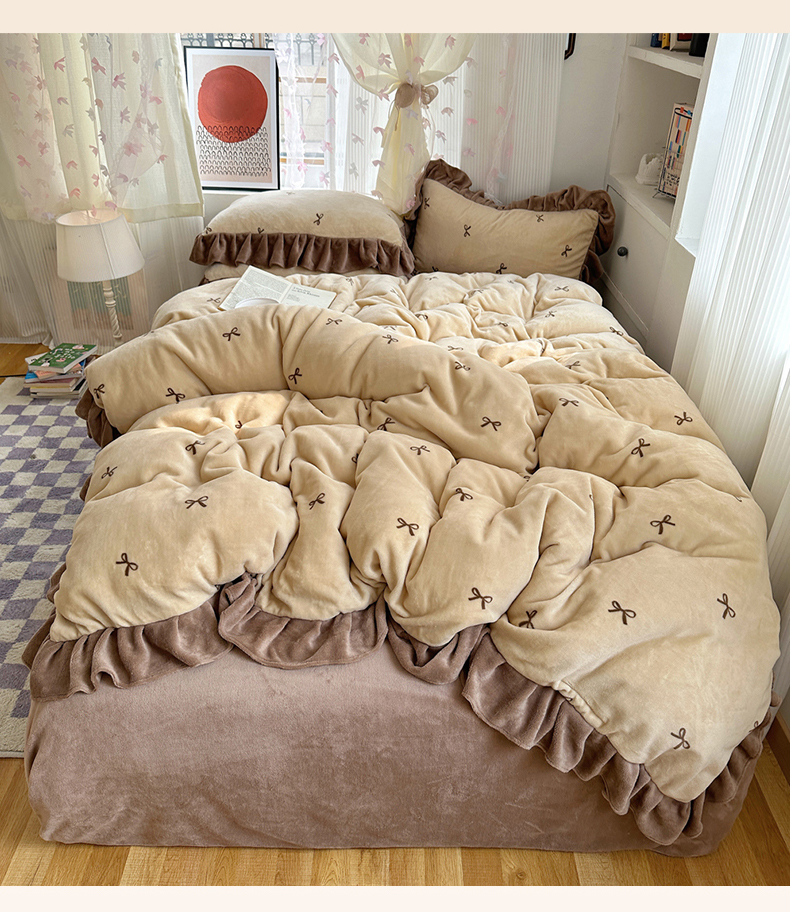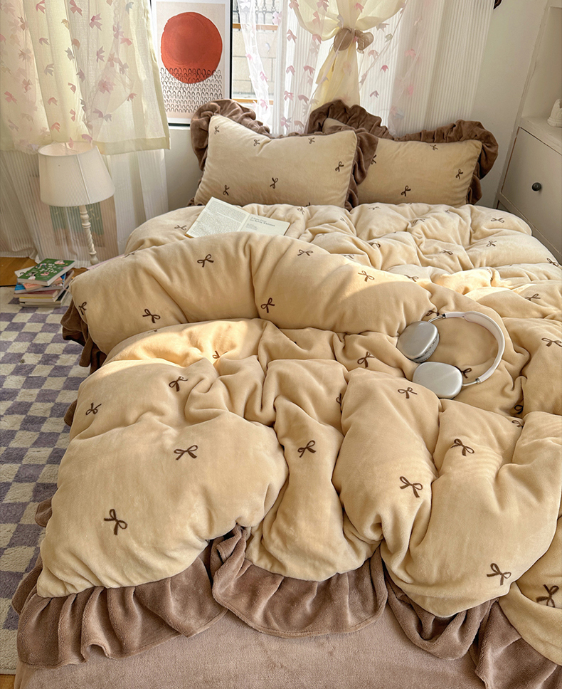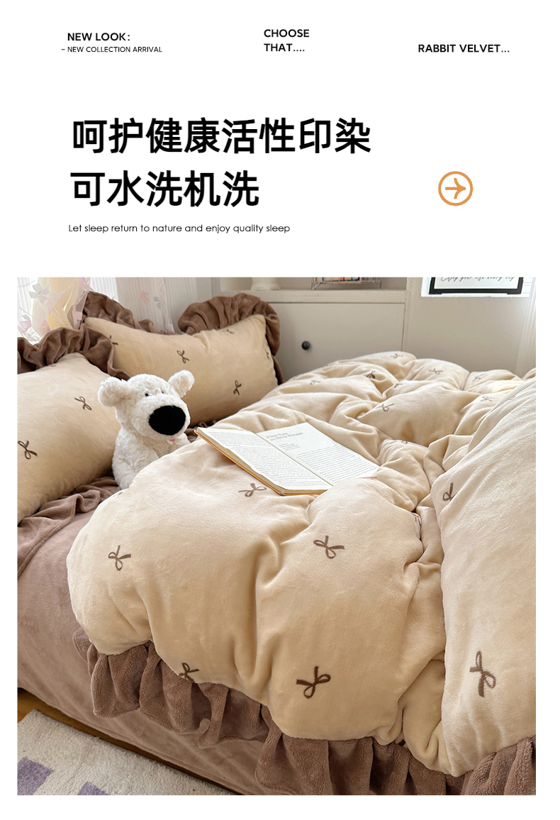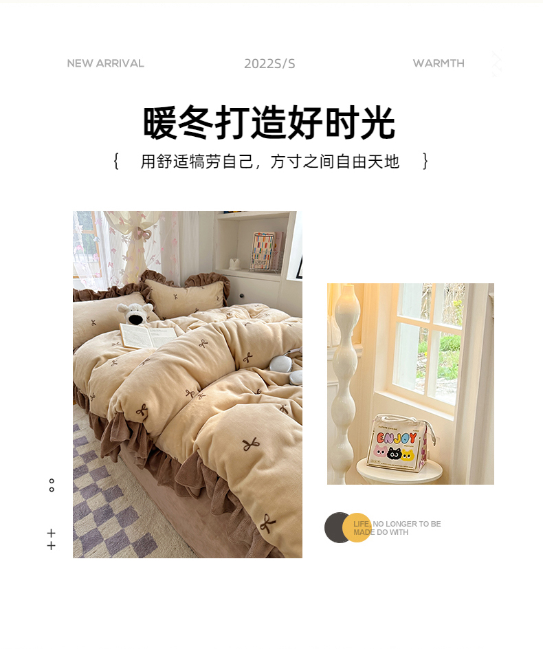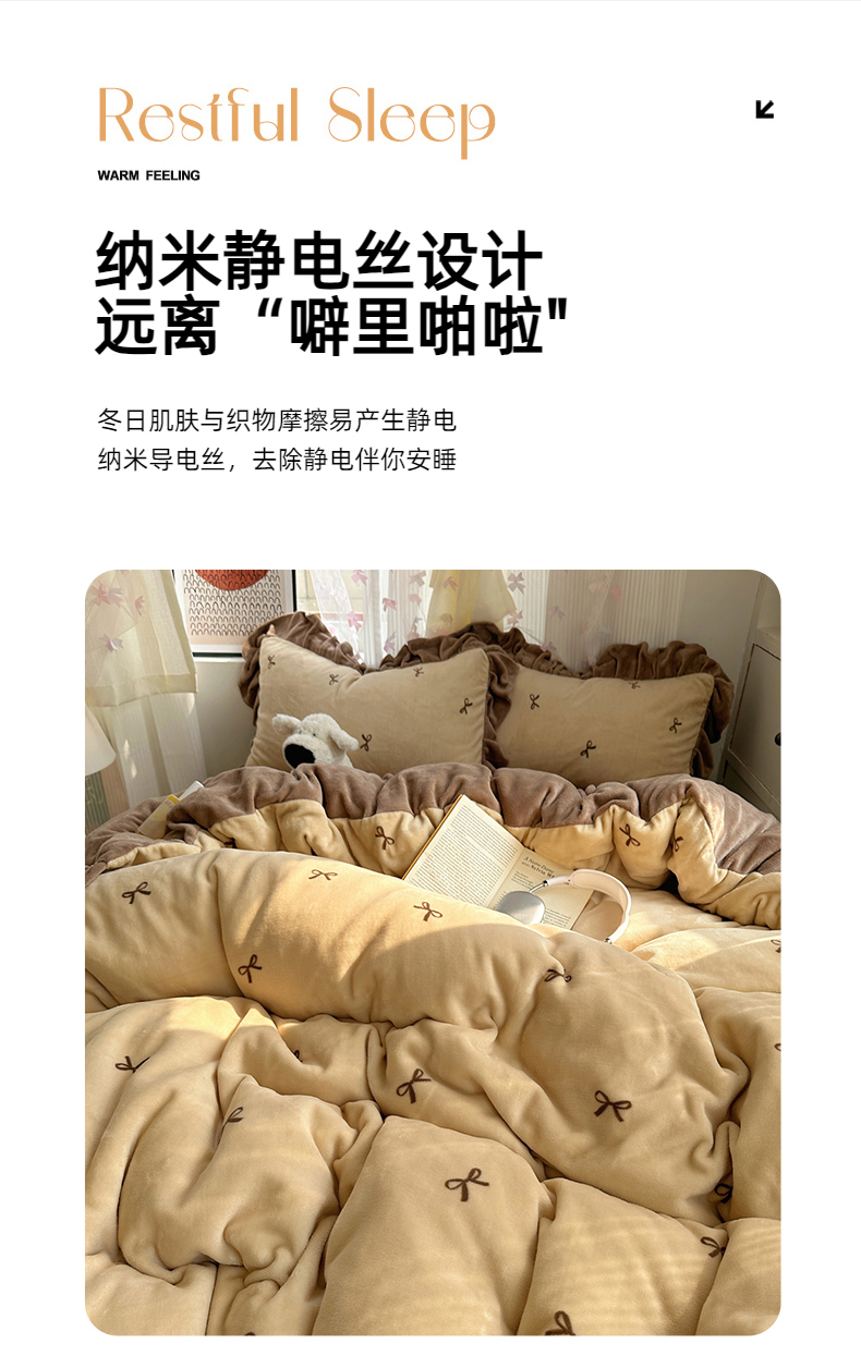 当前位置: 91家纺网 > 商品网购 > 床品套件 > 四件套 > 牛奶绒四件套 > 十里居 2024新款韩版蝴蝶结花边款牛奶绒四件套 蝴蝶结-黑白