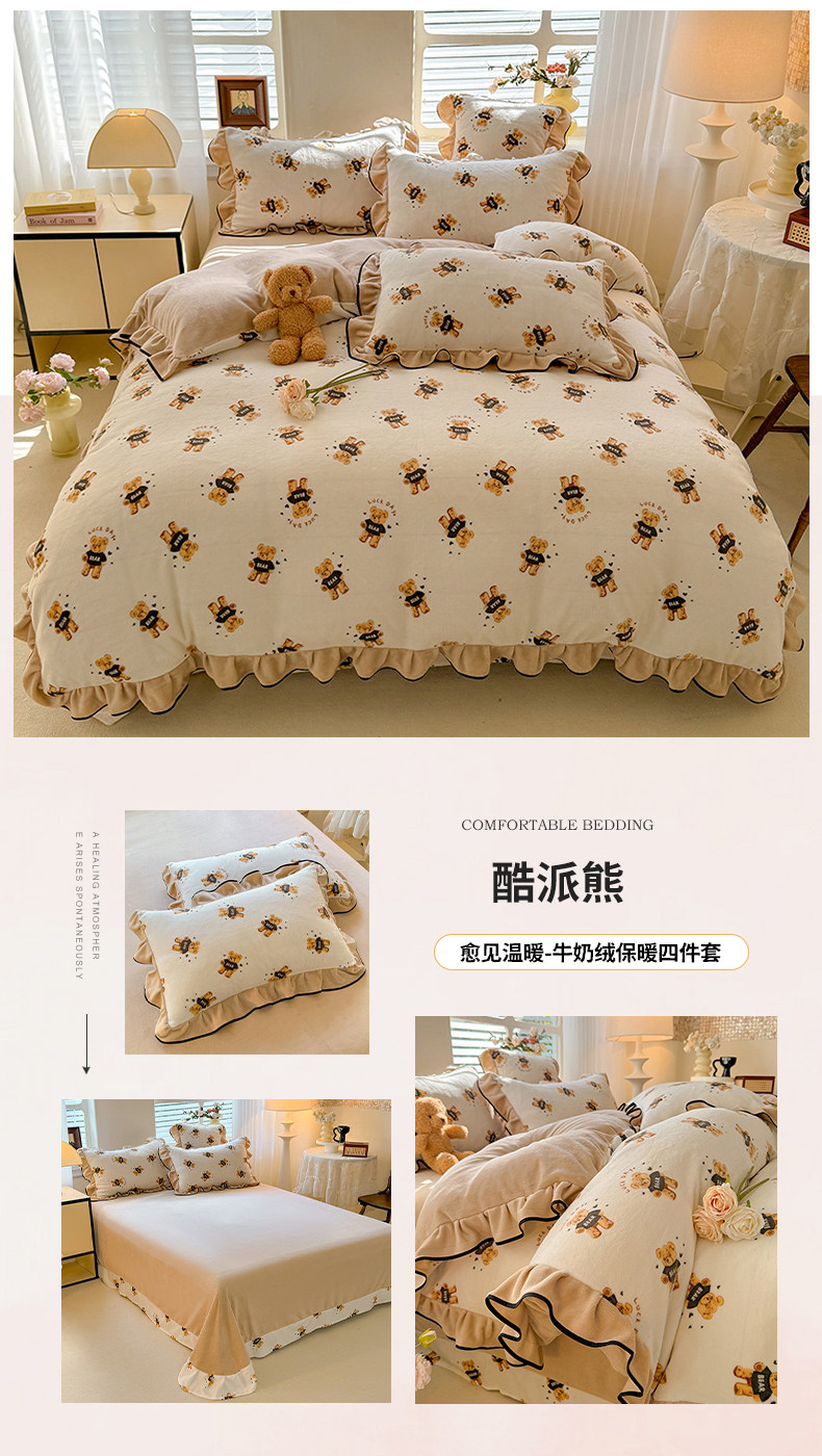 商品名称:韩约家纺 2024新款牛奶绒花边款印花四件套 酷派熊