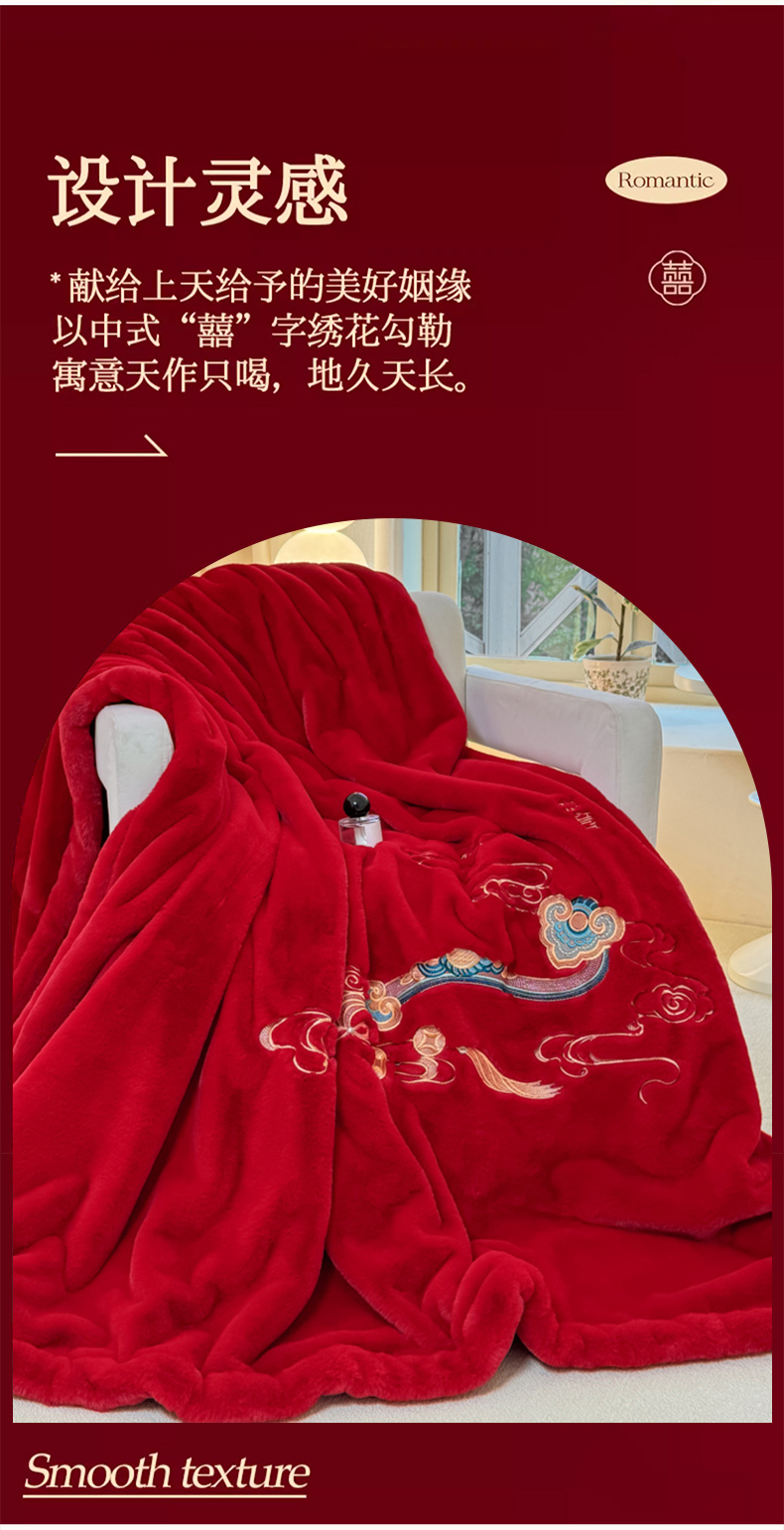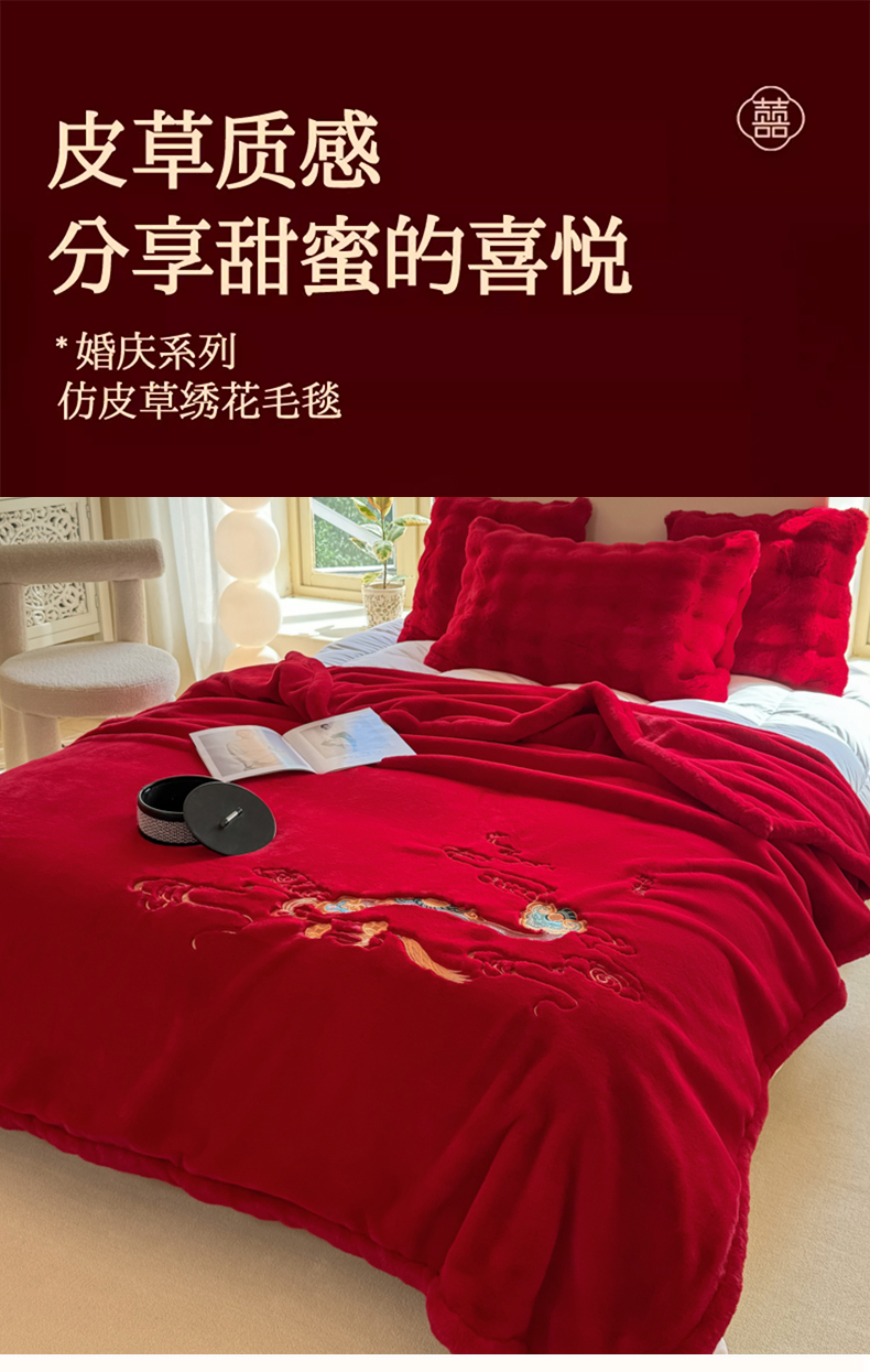 尚品绵羊毛毯 2025新款高端婚庆毛毯双层加厚仿貂皮草绣花毯盖毯 如意