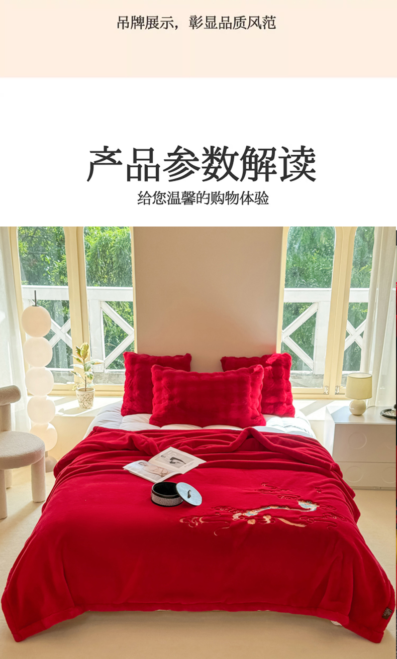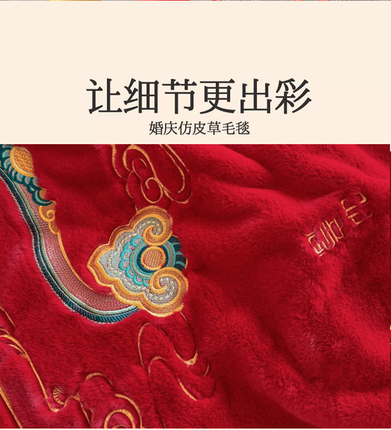 商品名称:尚品绵羊毛毯 2025新款高端婚庆毛毯双层加厚仿貂皮草绣花毯盖毯 如意