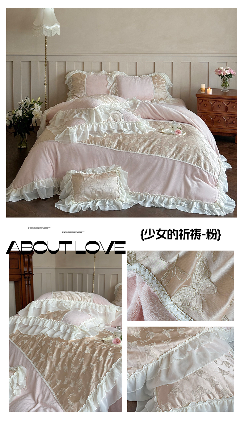 商品名称:凯儿家纺 2024新款全消光牛奶绒法式公主风花边工艺款四件套 少女的祈祷-粉
