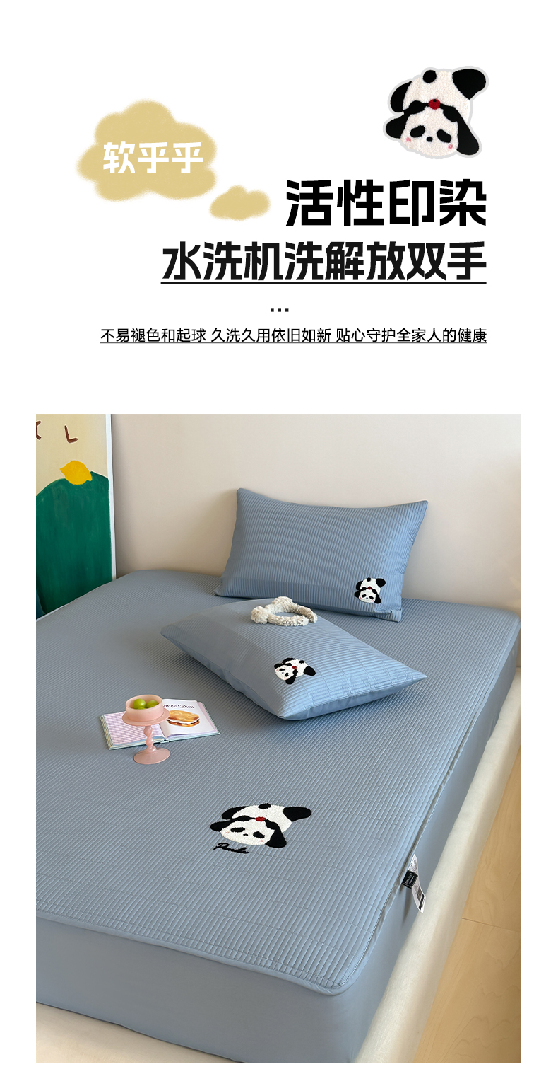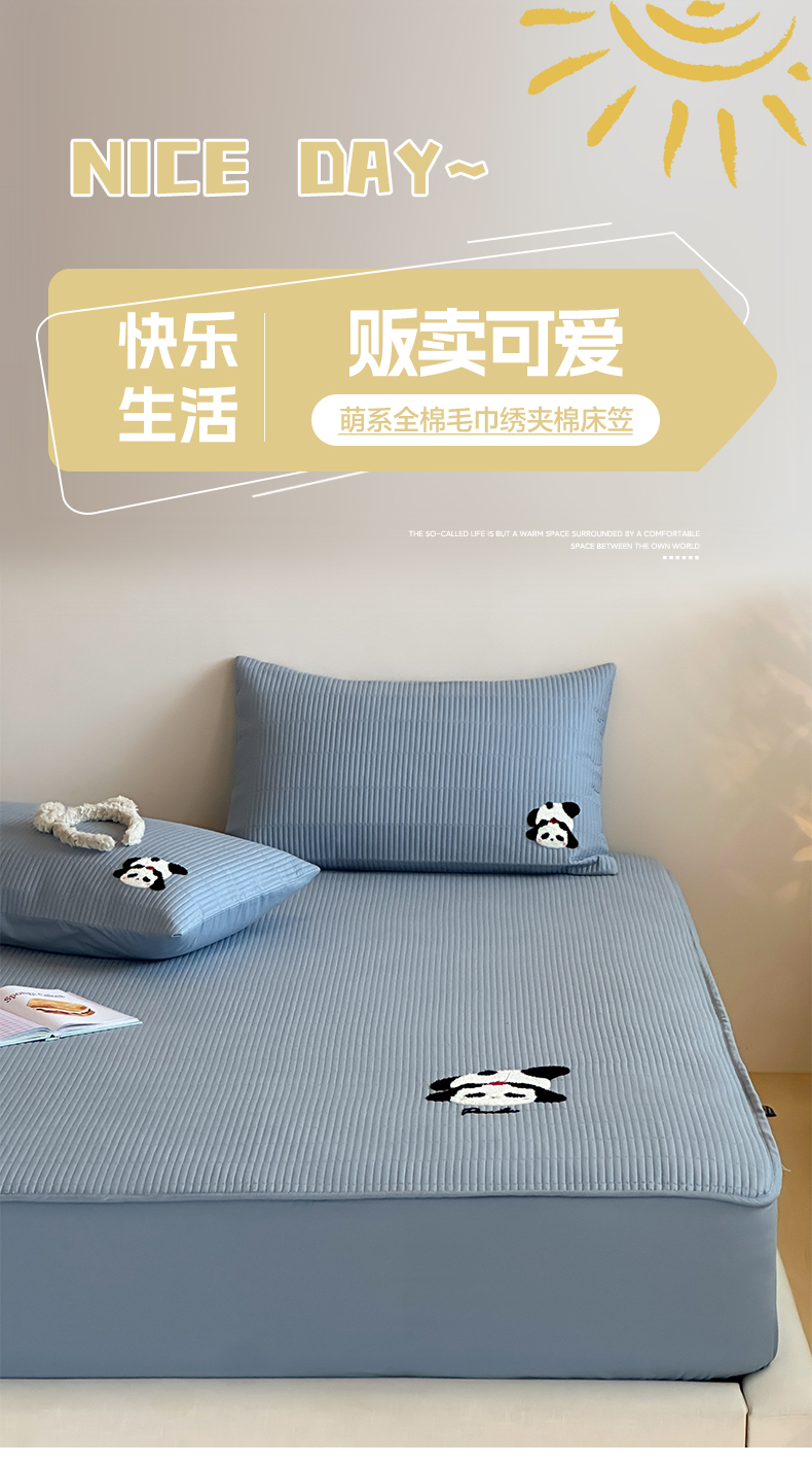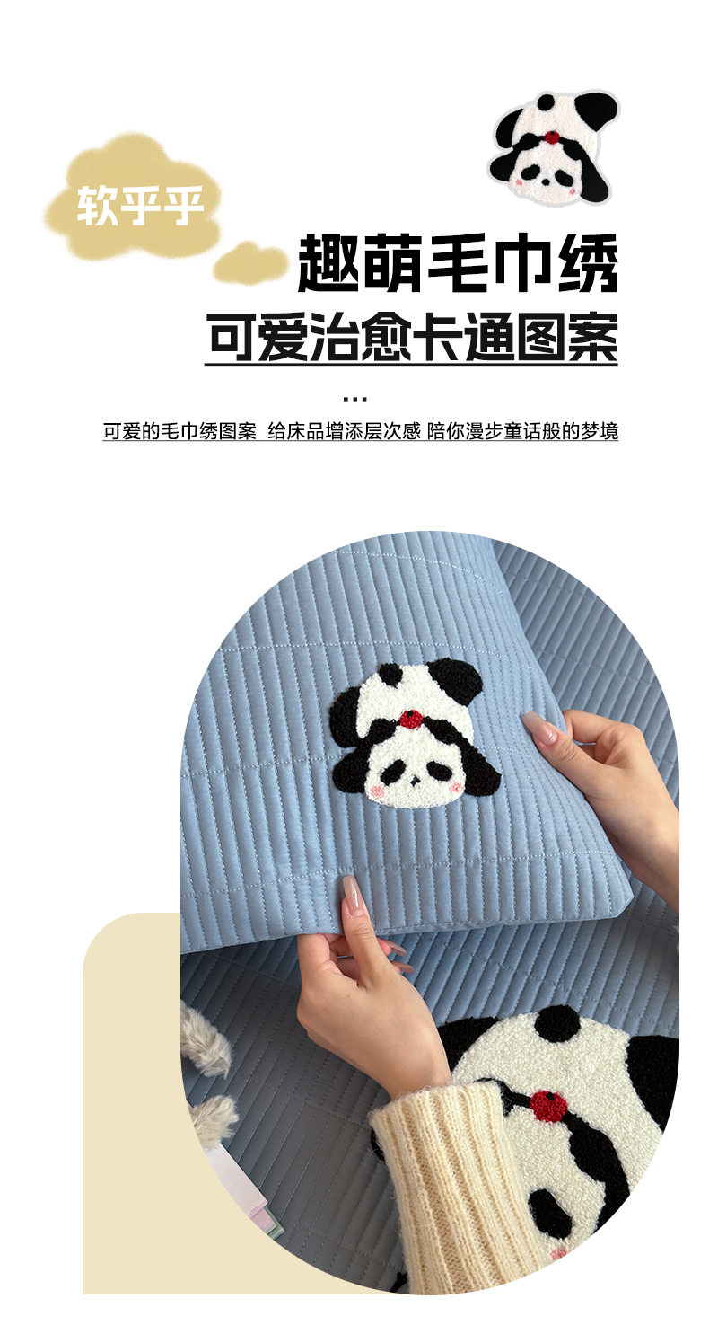 商品名称:三味舒屋 2024新款萌系卡通毛巾绣夹棉床笠 熊猫卡卡蓝