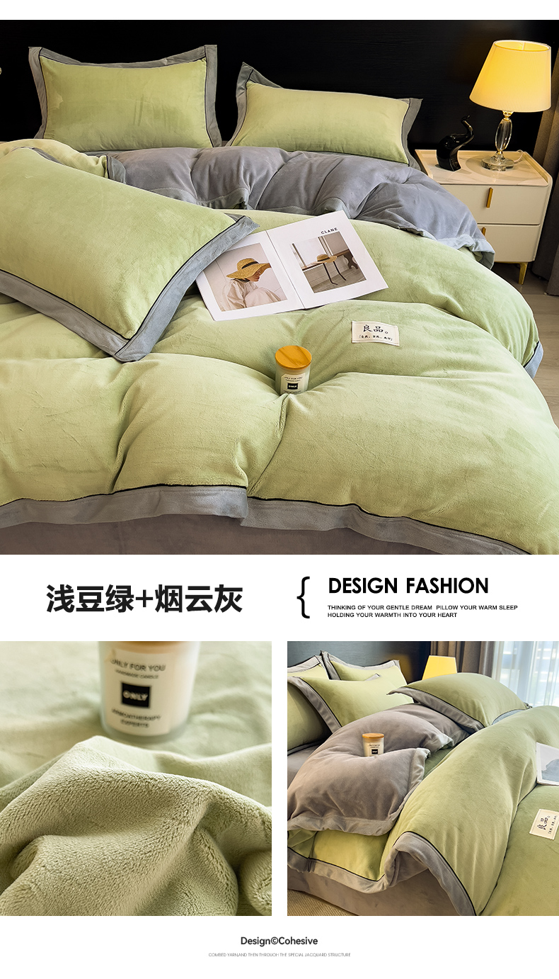孩子王家纺 2024新款高克重牛奶绒双拼宽边四件套 浅豆绿+烟云灰