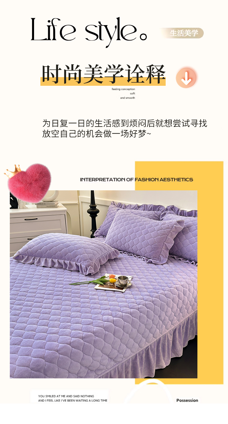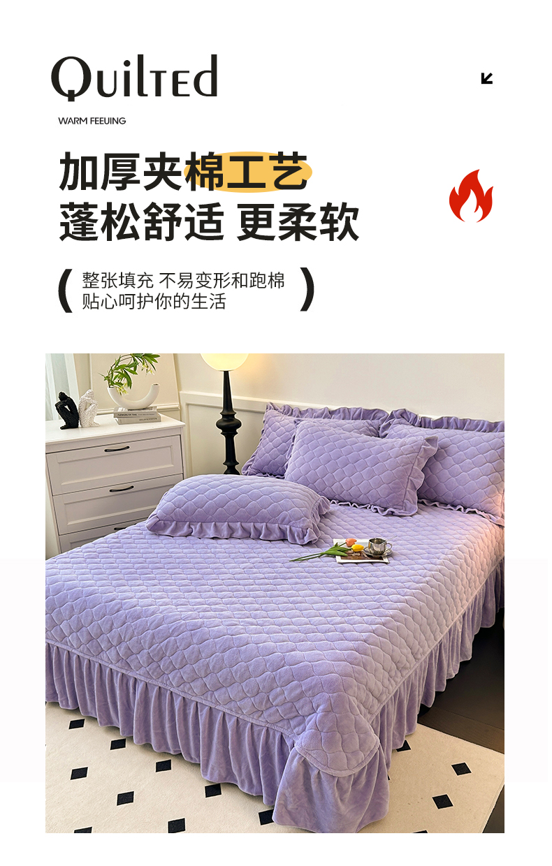 (总)屹成家纺2025新款水晶绒夹棉绗缝蕾丝床裙三件套(塞纳河畔)床裙单件起售价不低于105元,大红,豆沙,翡翠绿,粉玉,橄榄绿,蔚蓝,银灰