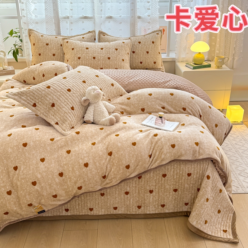 梦可莱家居 2024新款牛奶豆豆绒印花床盖四件套 豆豆绒卡爱心