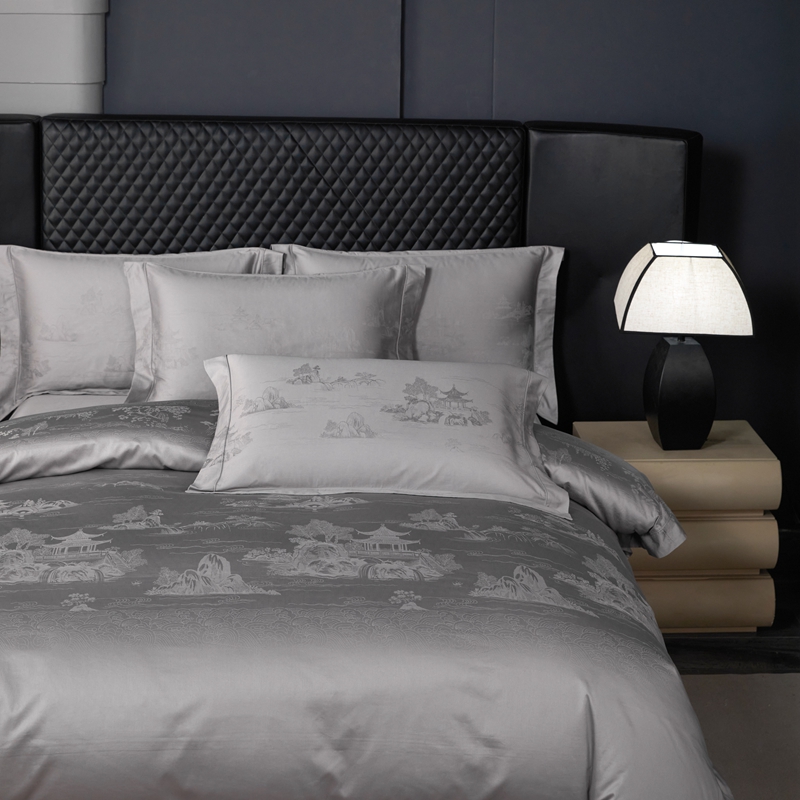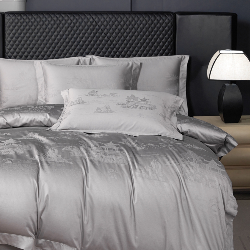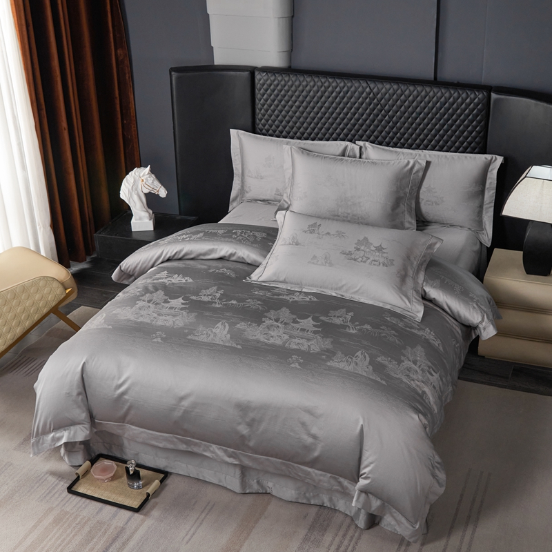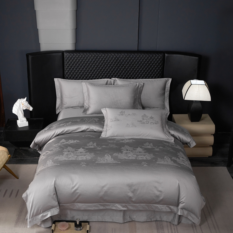 商品名称:淳绵家居 2024新款50*50S双股长绒棉大版定位提花四件套 亭香叶影-时尚灰
