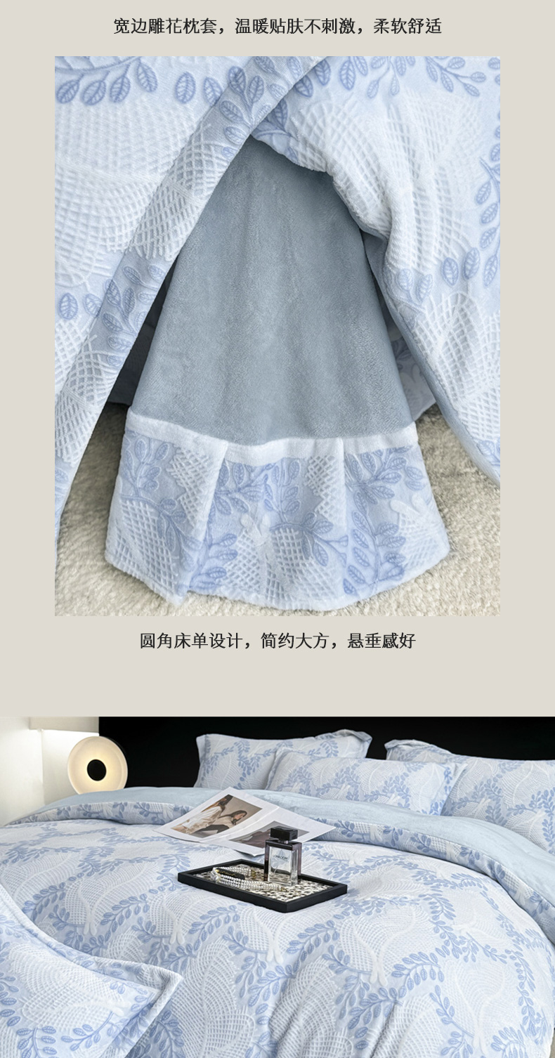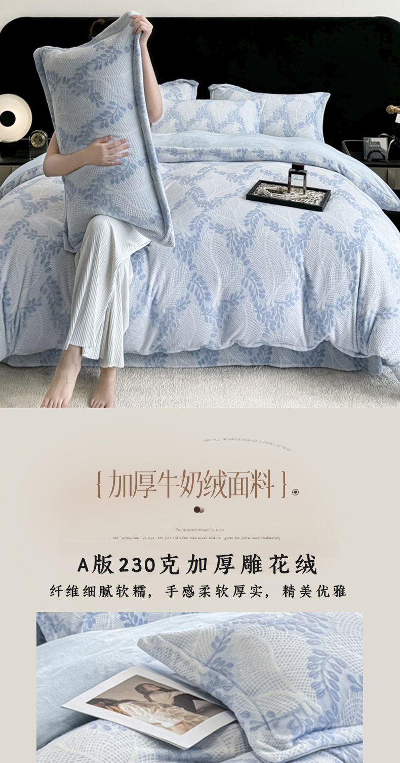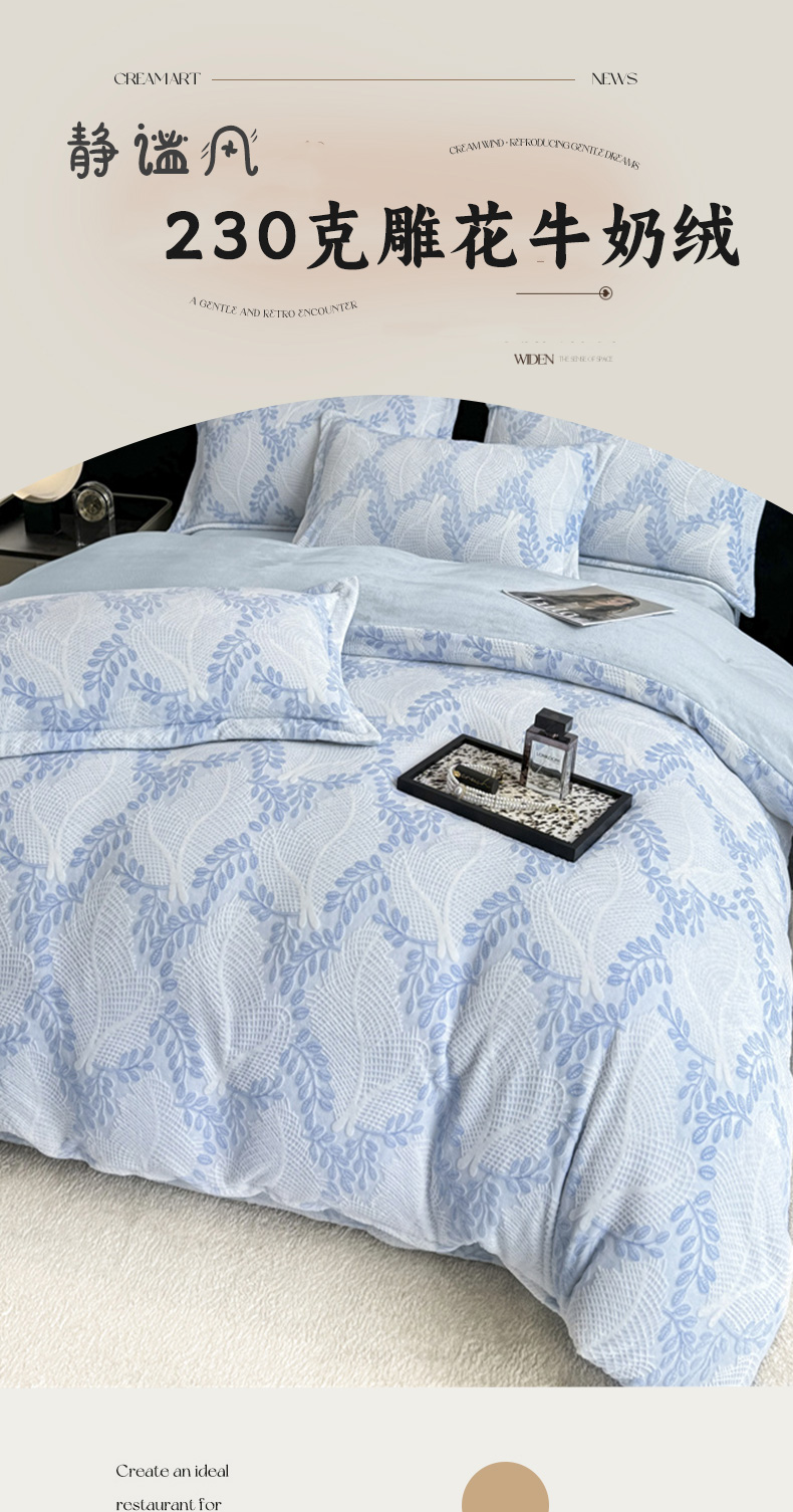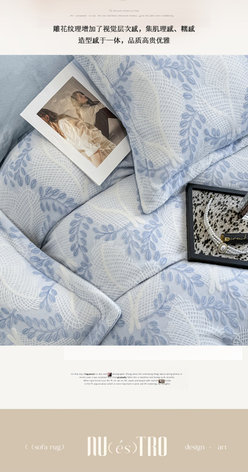 商品名称:金喜 2024新款230克AB版雕花牛奶绒加厚四件套-雅风 雅风-雪柳