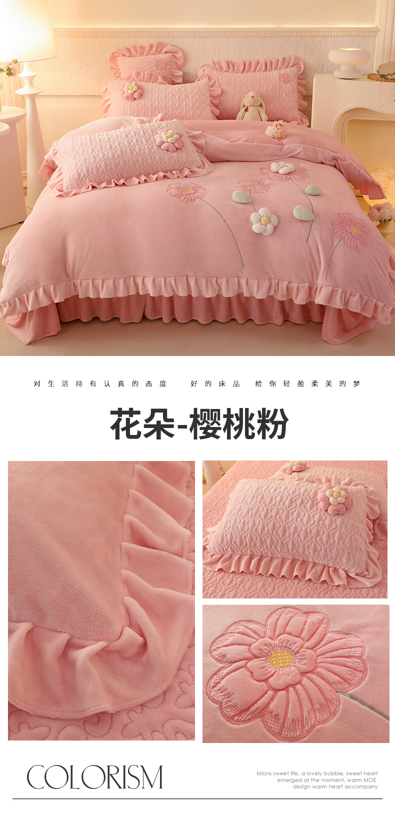 绒棉世家 2025A类高克重牛奶绒床盖款韩版立体花四件套-花朵系列樱桃粉
