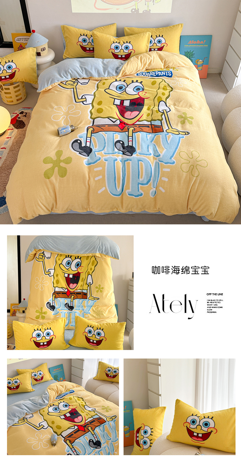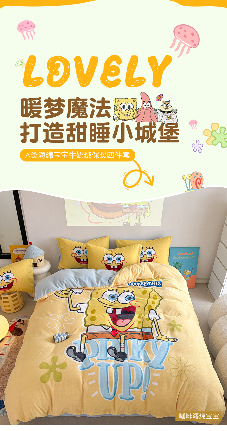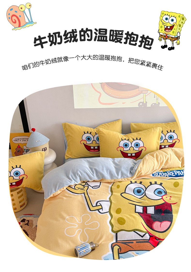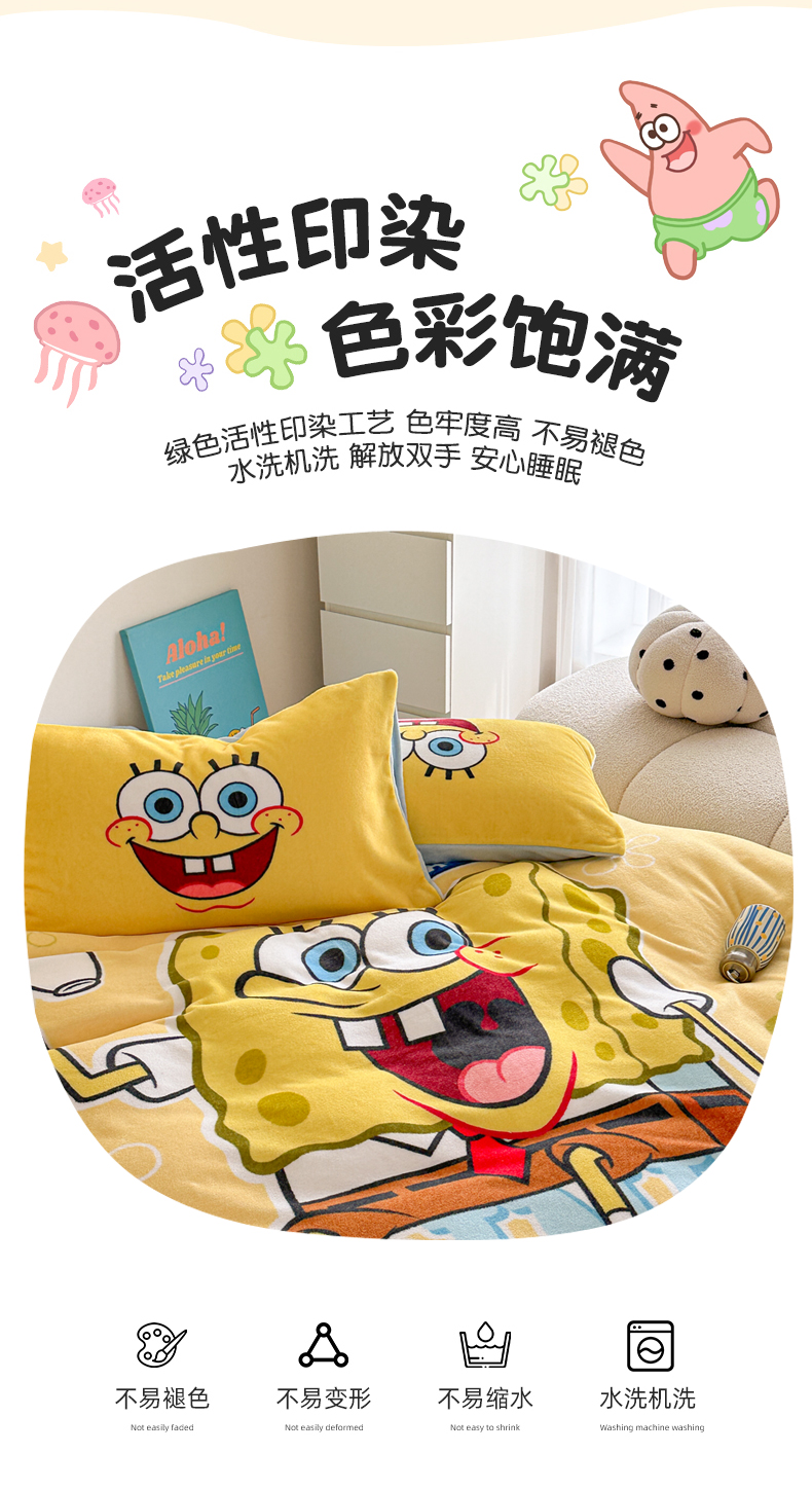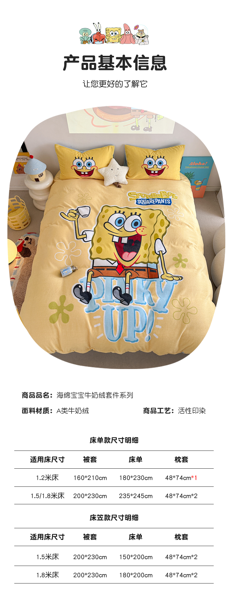 商品名称:金爱家 2024新品正版海绵宝宝授权大版卡通平网数码印花加厚高克重牛奶绒系列四件套 咖啡海绵宝宝