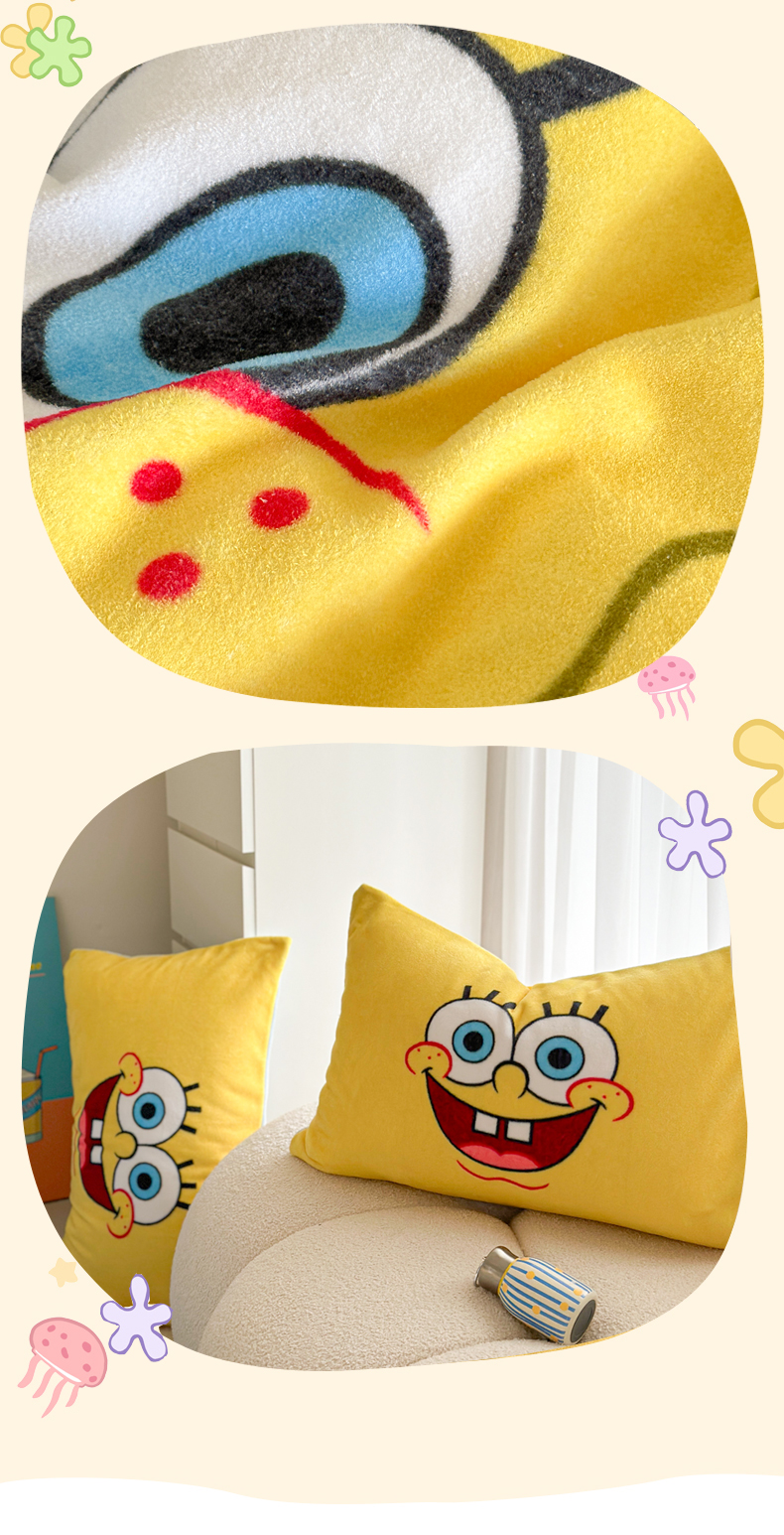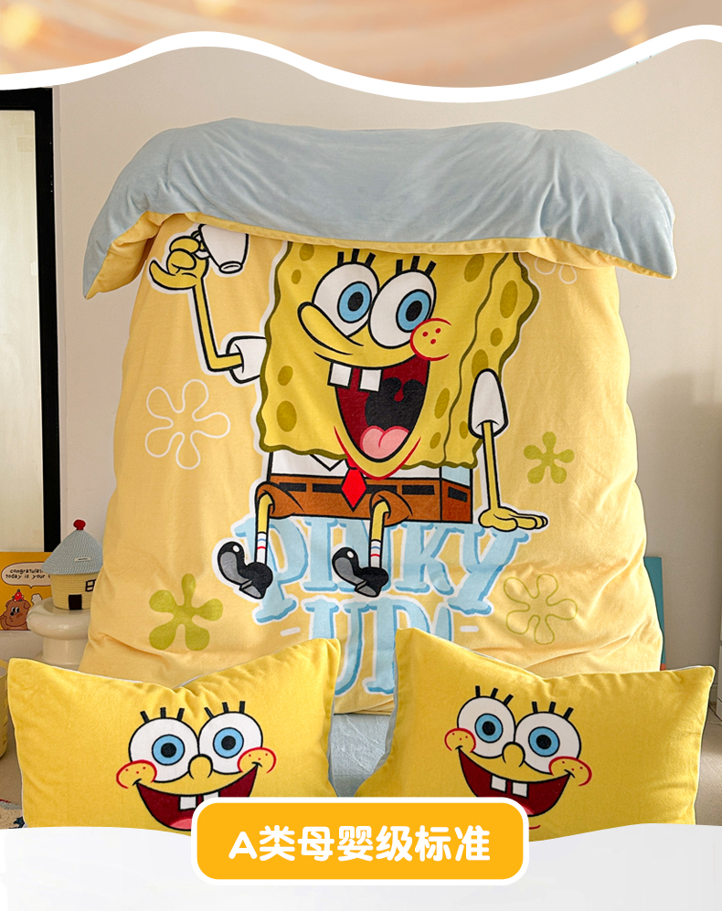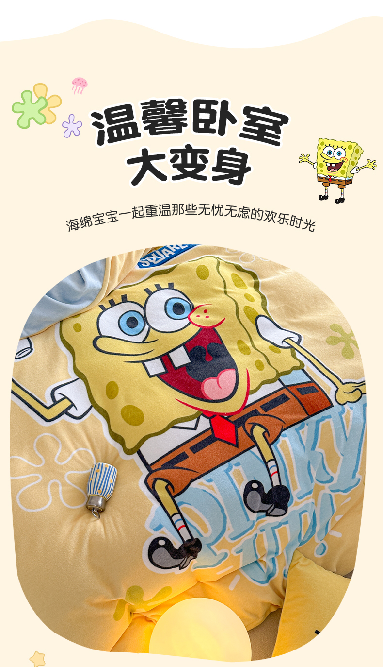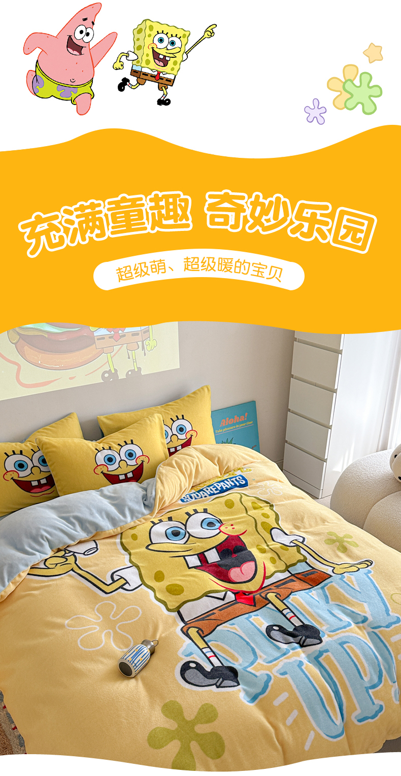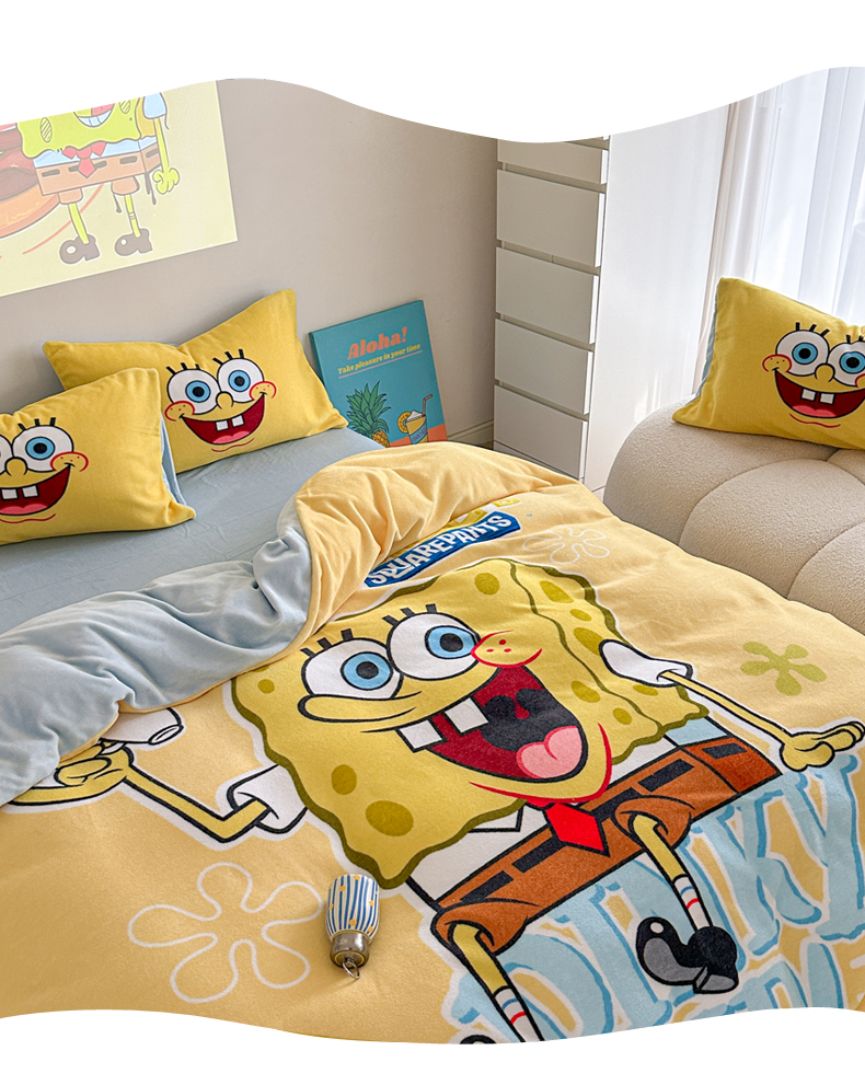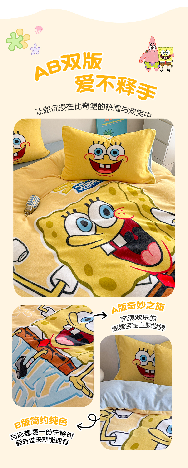 商品名称:金爱家 2024新品正版海绵宝宝授权大版卡通平网数码印花加厚高克重牛奶绒系列四件套 咖啡海绵宝宝