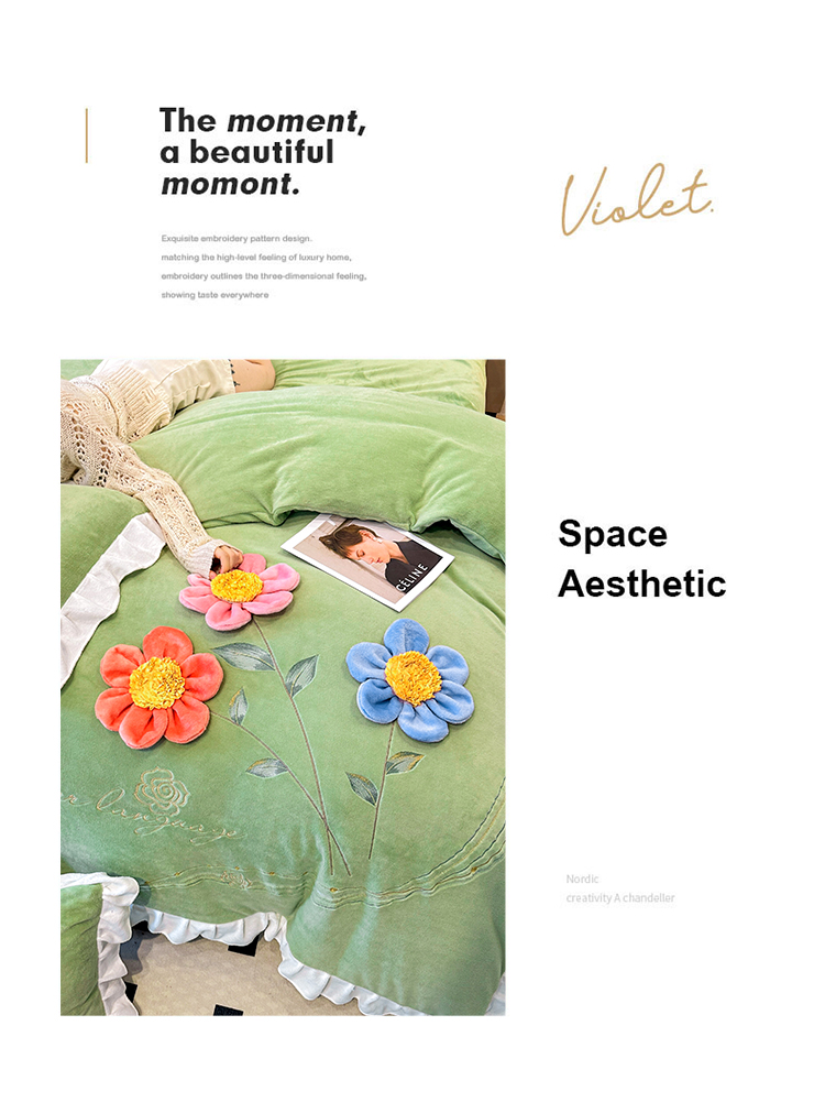 9斤高端韩版少女心法式公主风贴布绣花牛奶绒四件套小清新绒兔毛绒法莱绒床盖被套丝绒兔毛绒法莱绒床盖被套 潘多拉-新芽绿