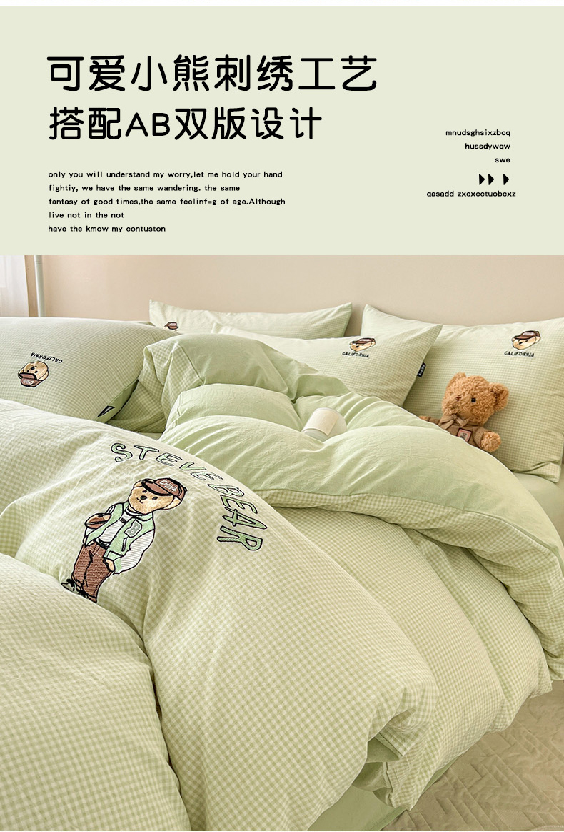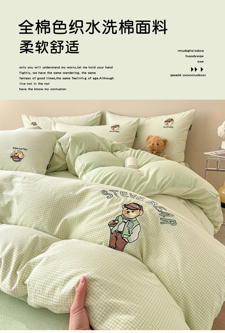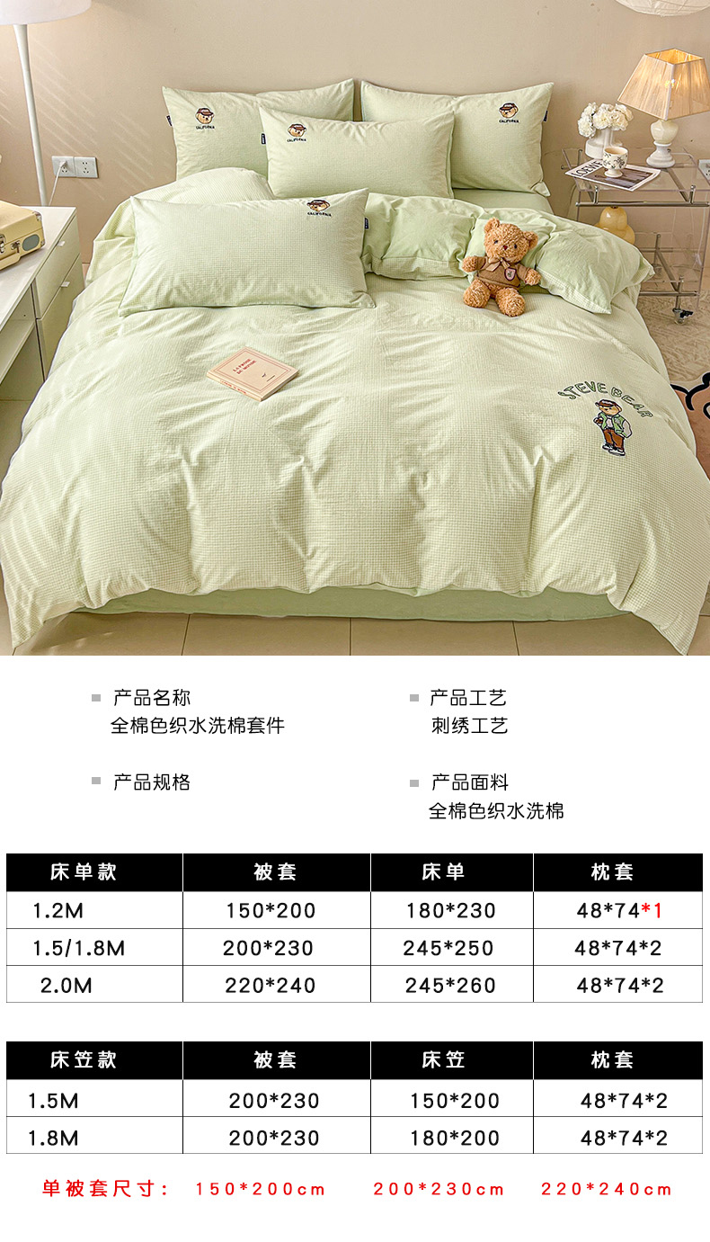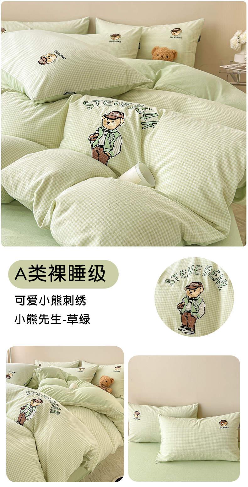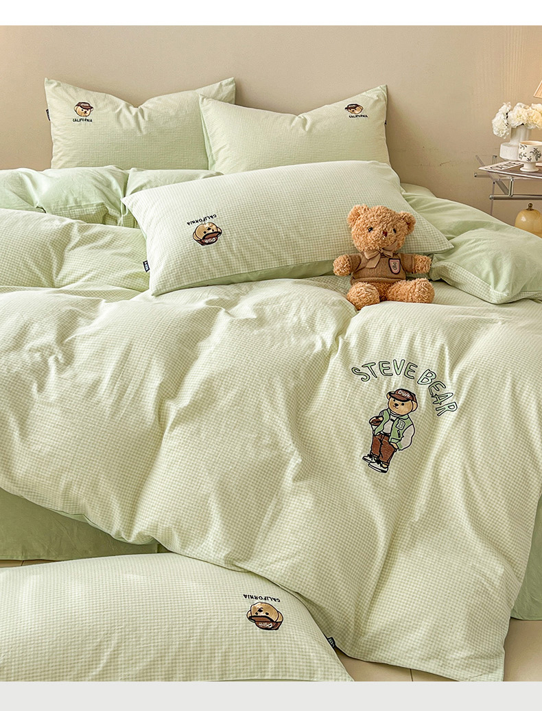 当前位置: 91家纺网 > 商品网购 > 床品套件 > 四件套 > 水洗棉四件套 > 2025新款A类全棉色织水洗棉可爱小熊刺绣四件套 小熊先生-草绿