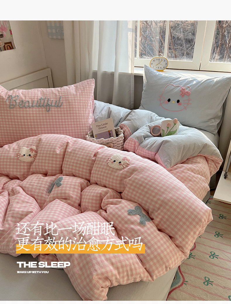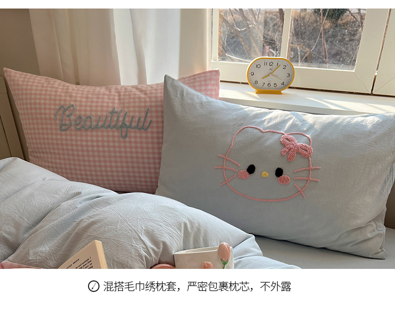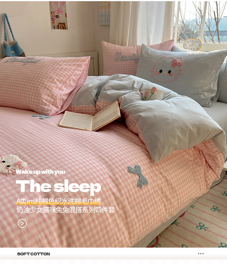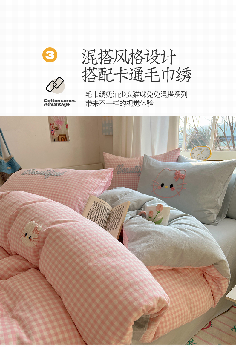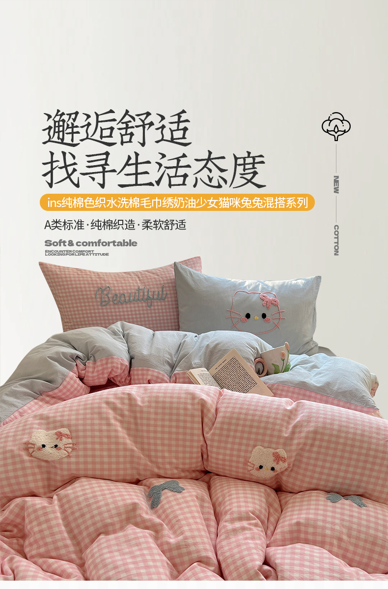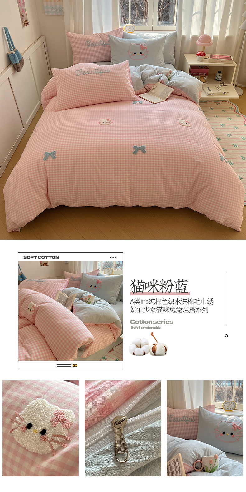 当前位置: 91家纺网 > 商品网购 > 床品套件 > 四件套 > 水洗棉四件套 > 桃子家居 2025新款A类ins纯棉色织水洗棉毛巾绣奶油少女猫咪兔兔混搭系列四件套 色织水洗棉-猫咪粉蓝