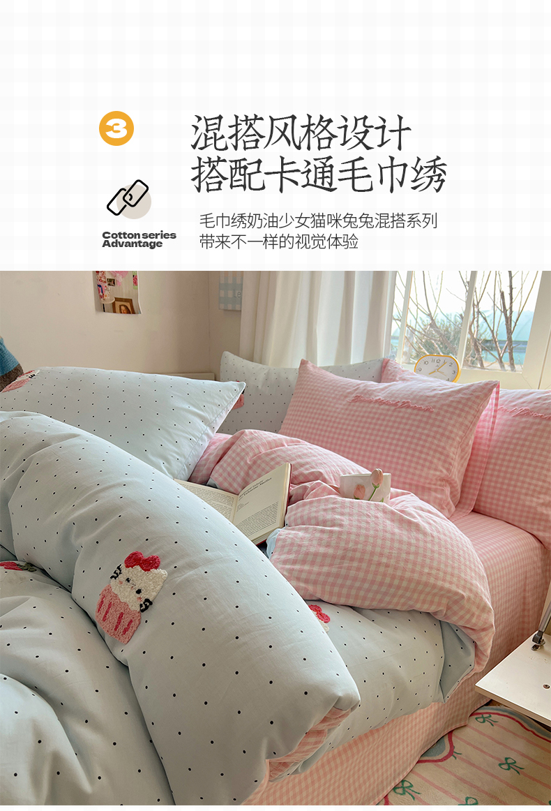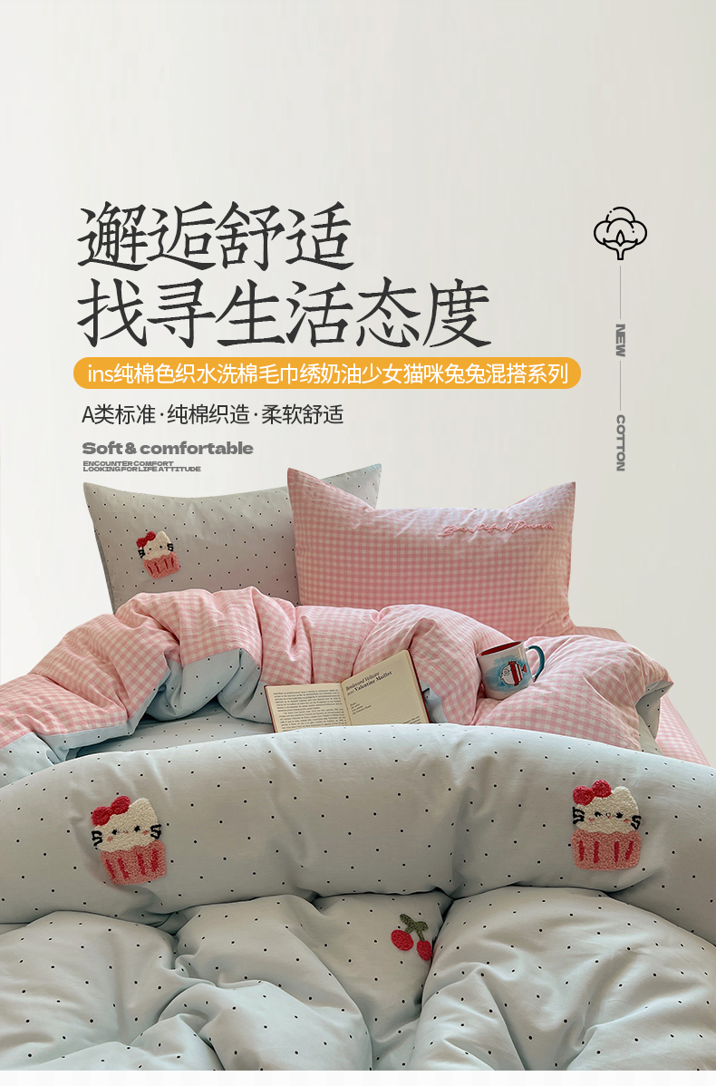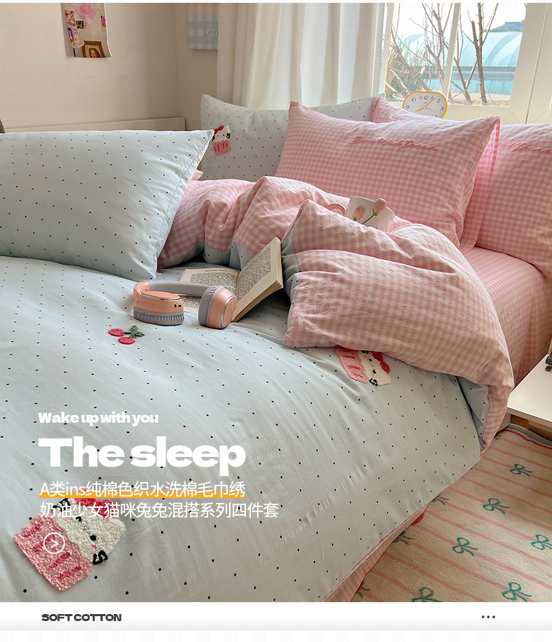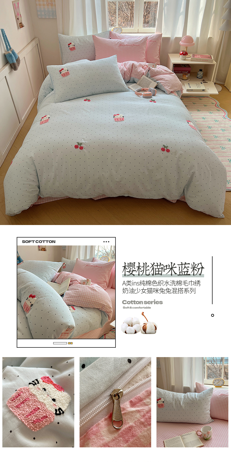 当前位置: 91家纺网 > 商品网购 > 床品套件 > 四件套 > 水洗棉四件套 > 桃子家居 2025新款A类ins纯棉色织水洗棉毛巾绣奶油少女猫咪兔兔混搭系列四件套 色织水洗棉-樱桃猫咪蓝粉