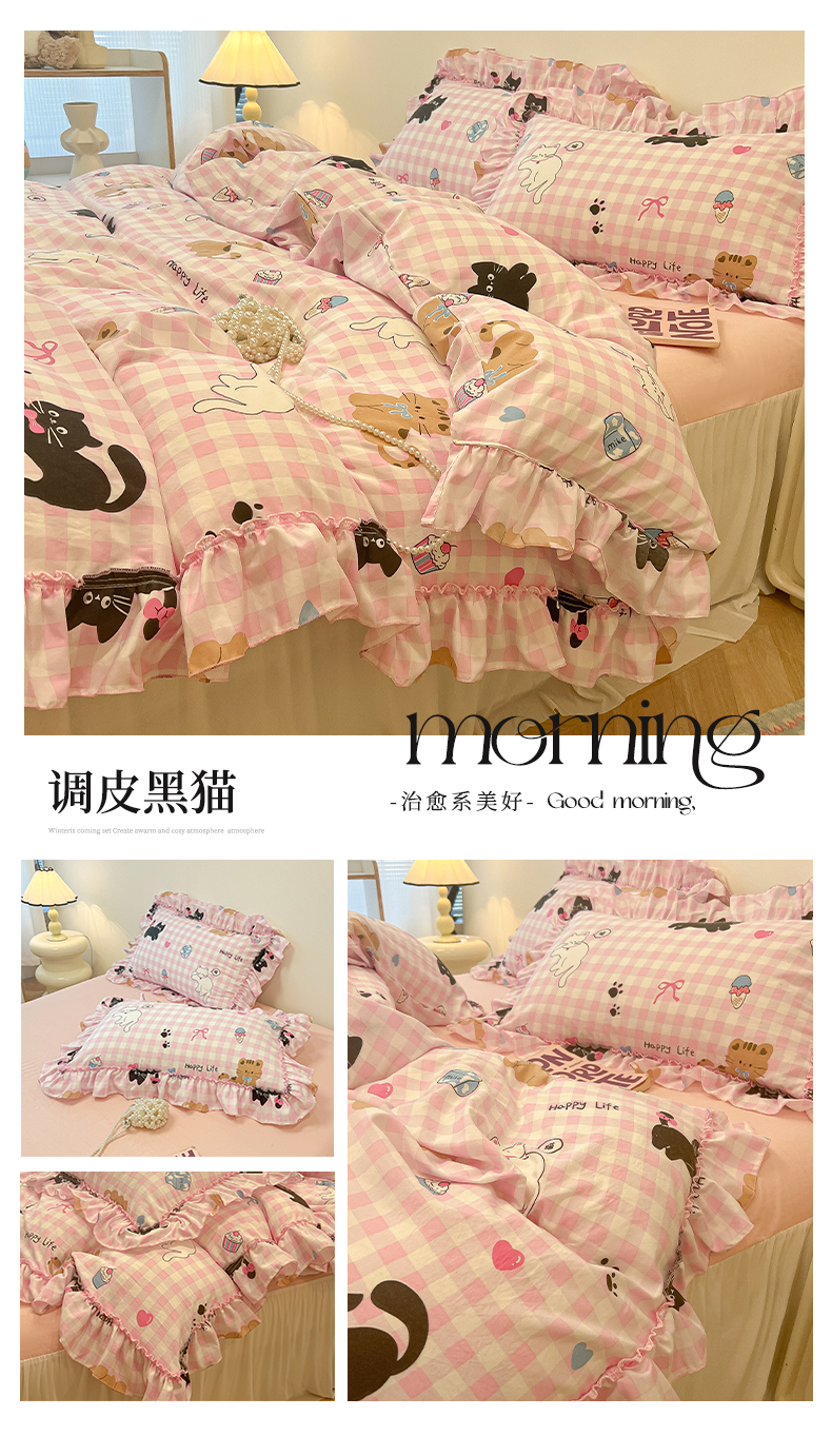 当前位置: 91家纺网 > 商品网购 > 床品套件 > 四件套 > 其它四件套 > 盼季家纺 2025新款公主风花边小清新水洗棉床上四件套床单被套床裙三件套-风格一 调皮黑猫
