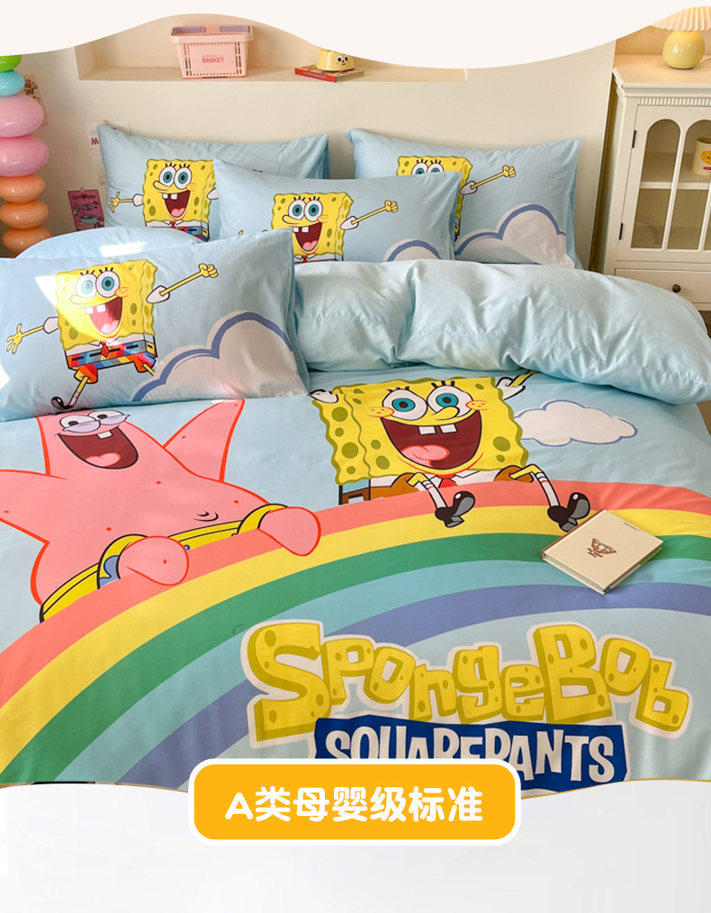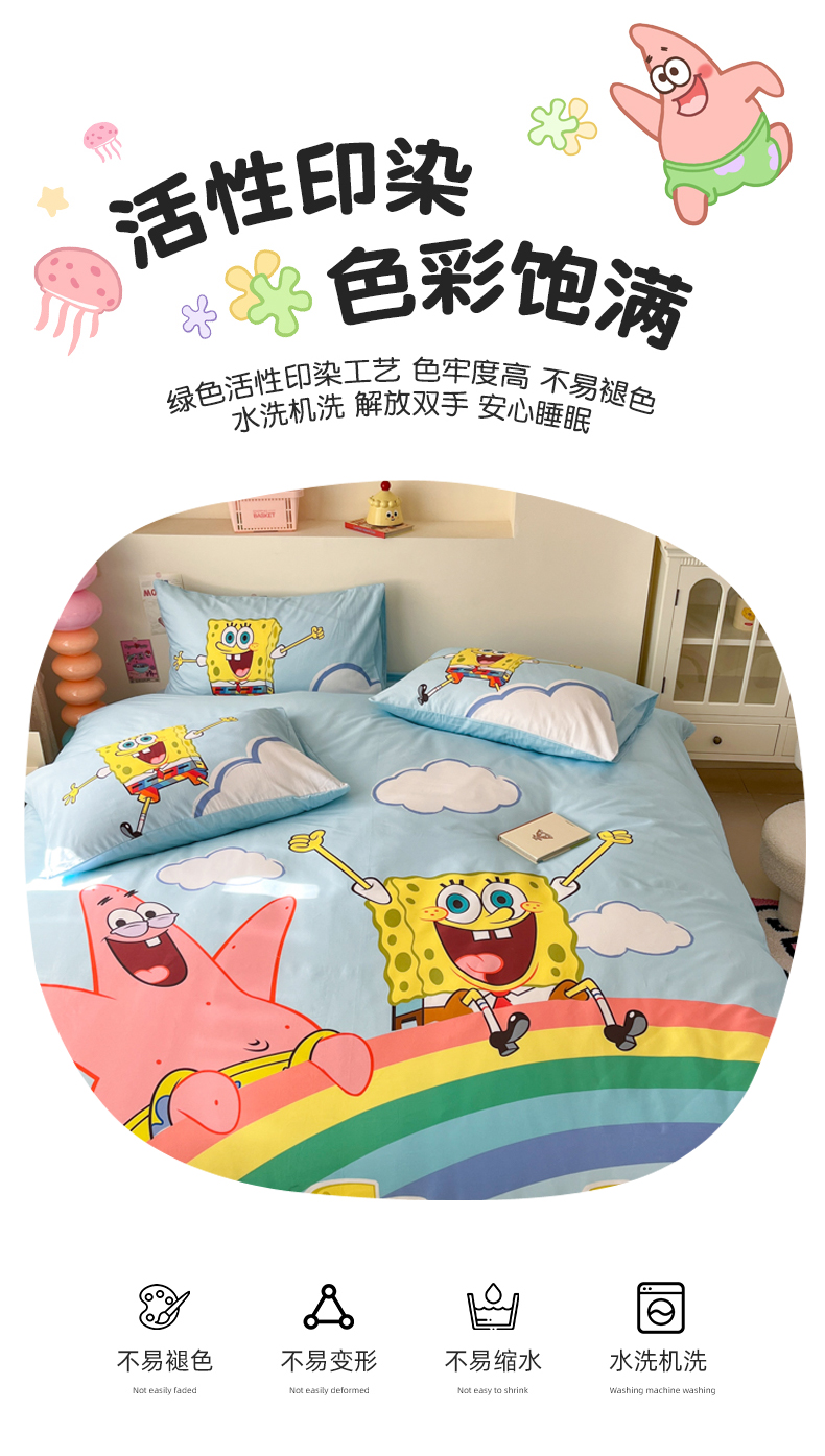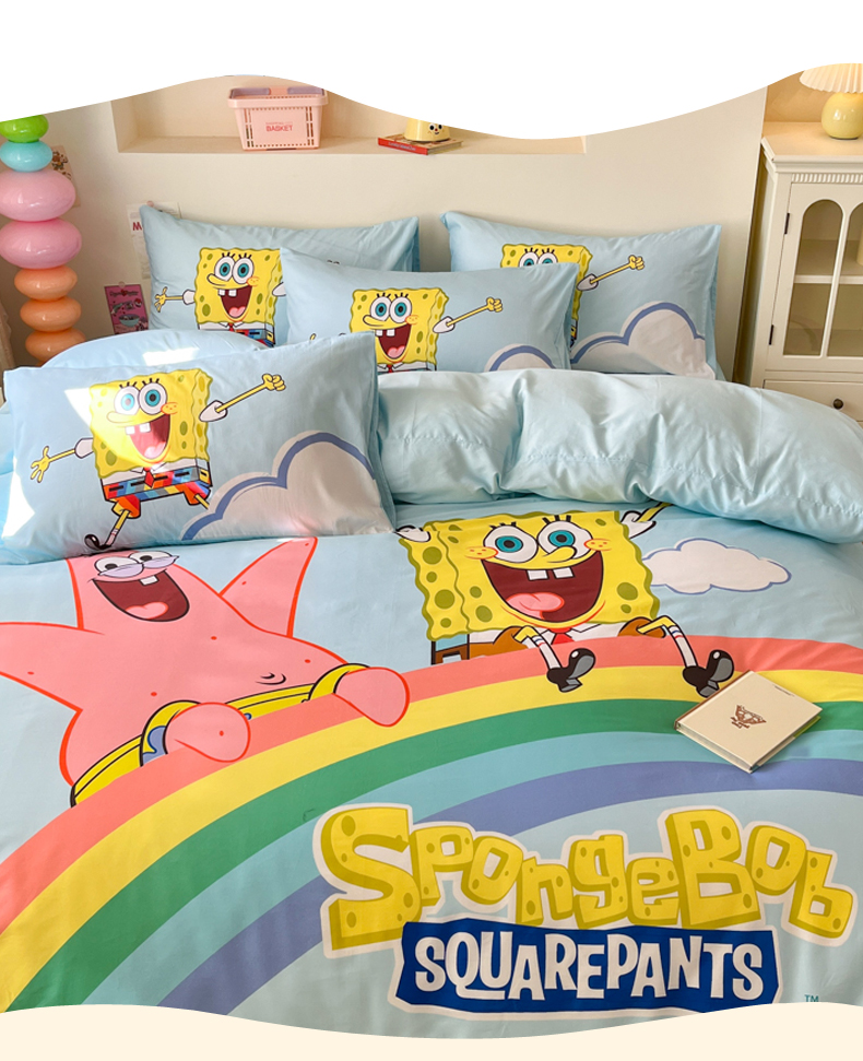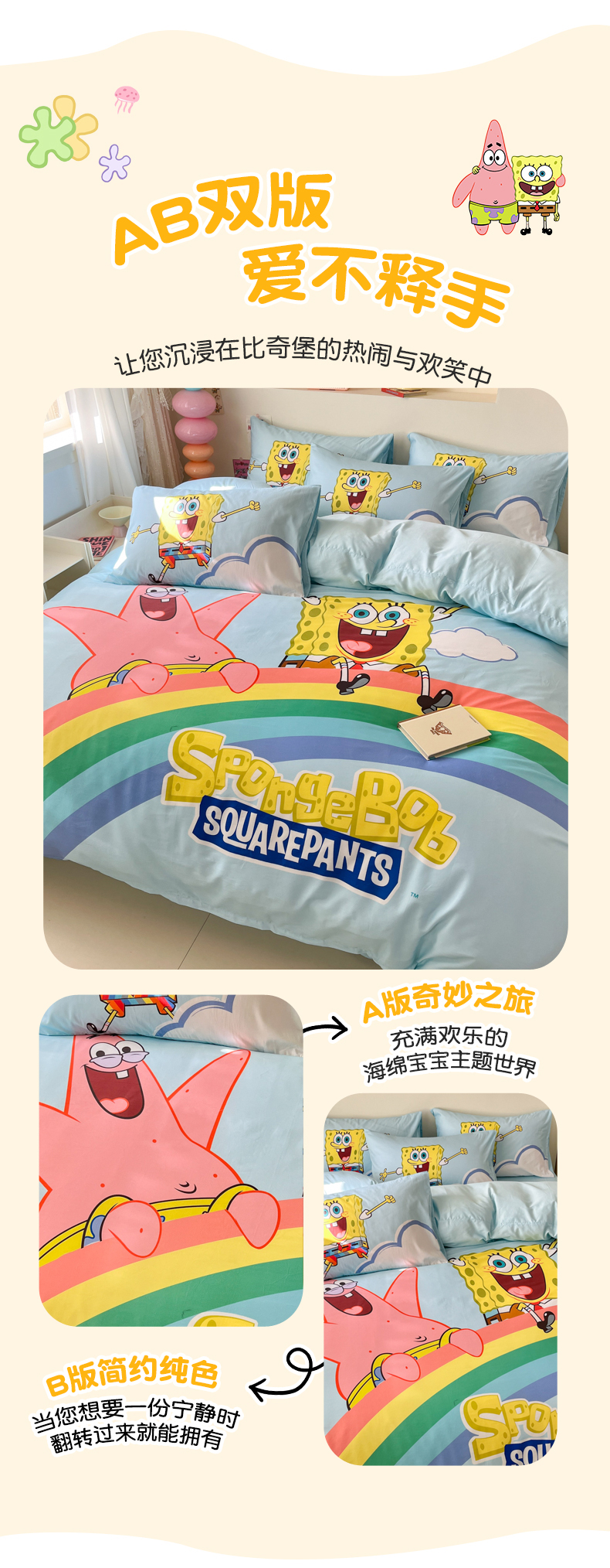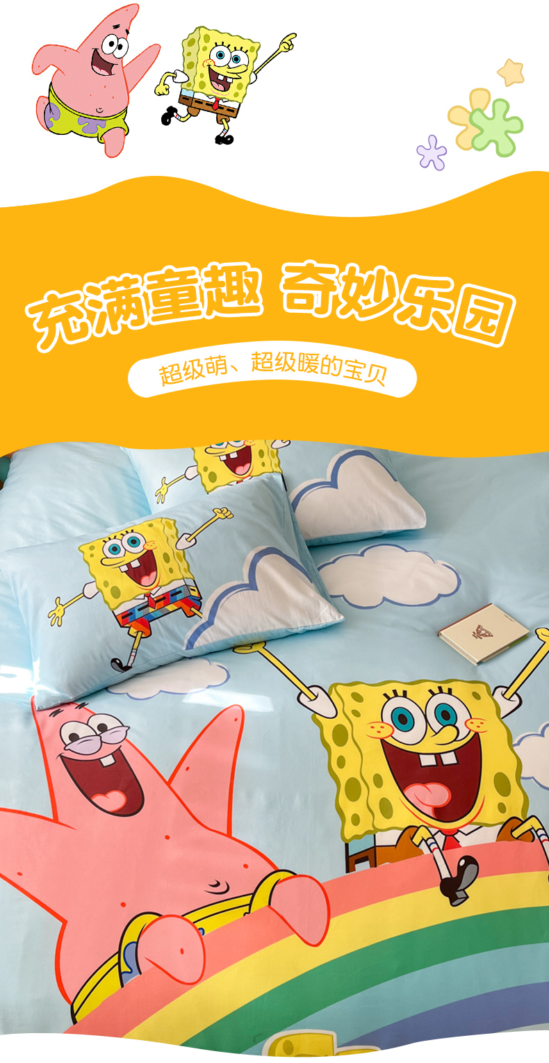 当前位置: 91家纺网 > 商品网购 > 床品套件 > 四件套 > 全棉普通四件套 > 金爱家纯棉数码印花系列四件套-海绵宝宝 棉D-彩虹海绵宝宝