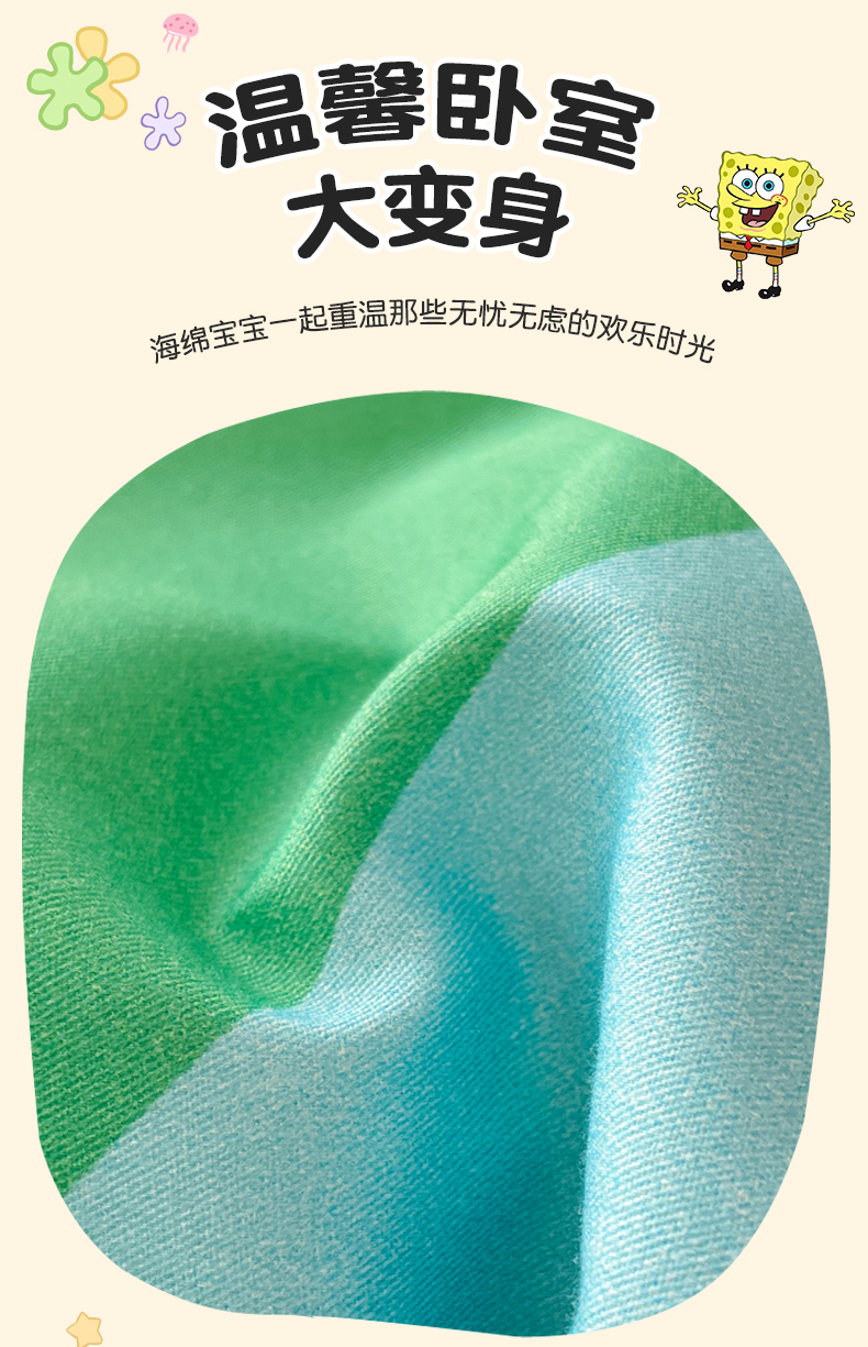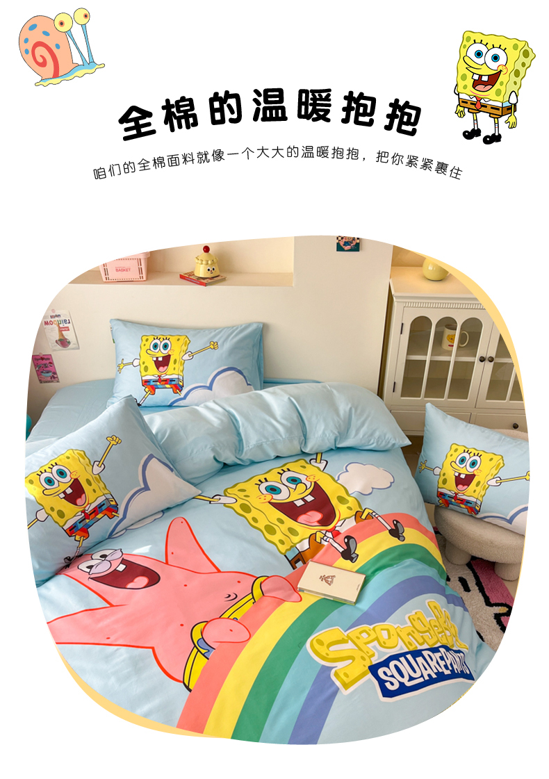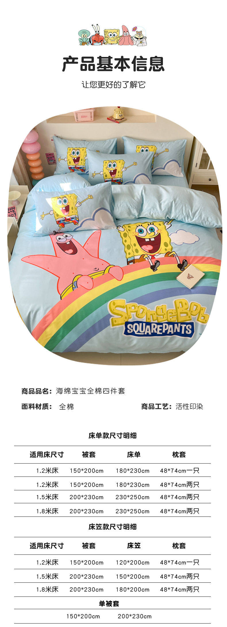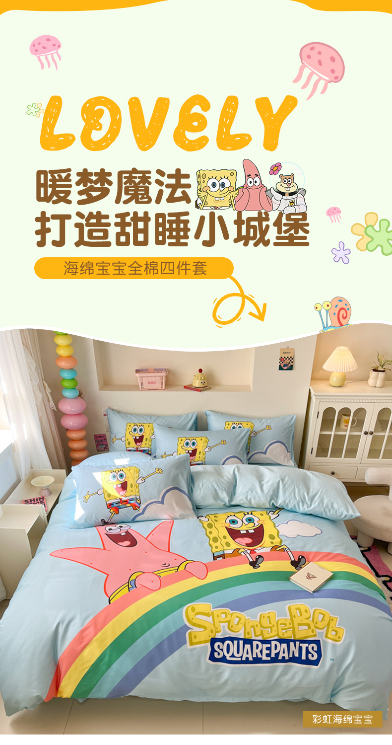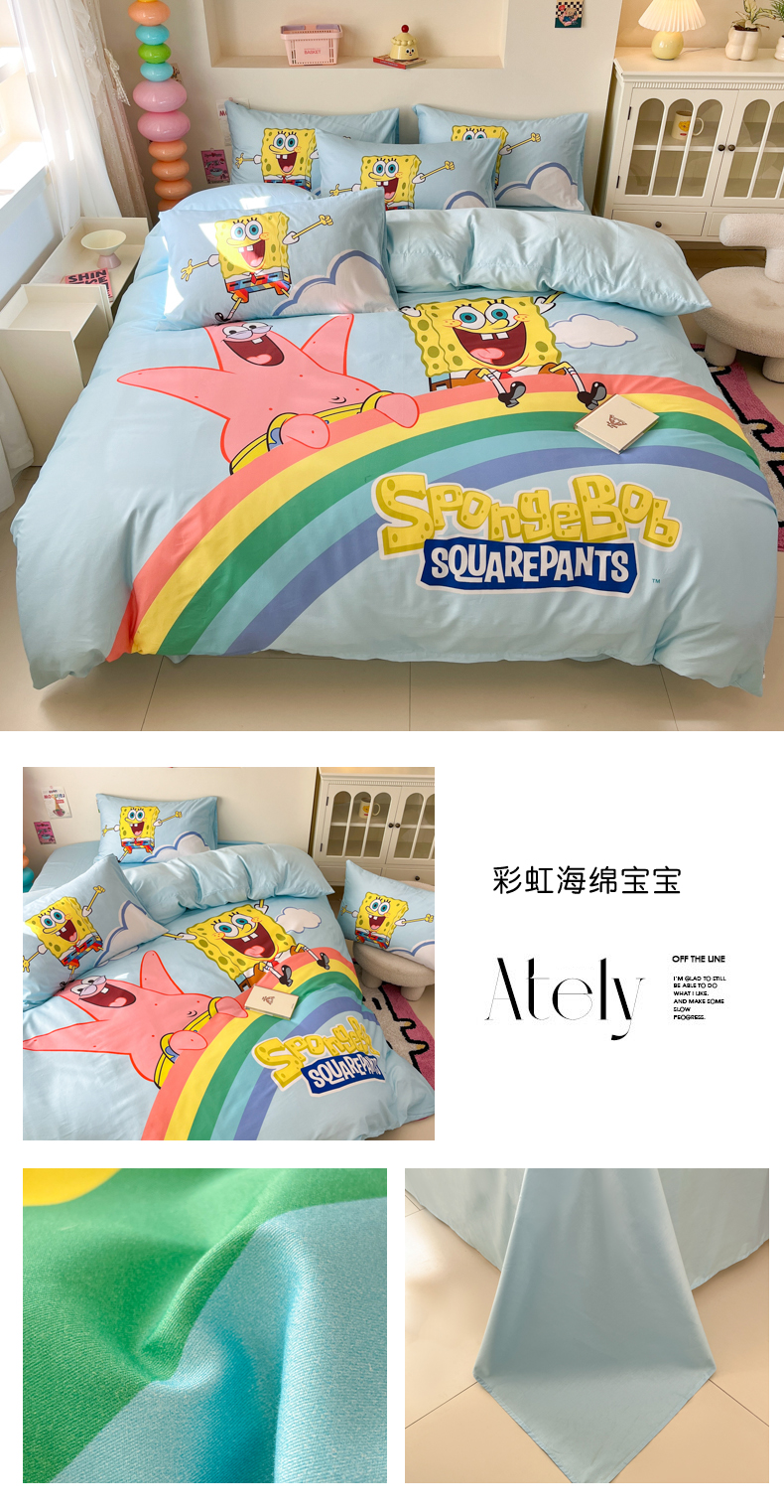 当前位置: 91家纺网 > 商品网购 > 床品套件 > 四件套 > 全棉普通四件套 > 金爱家纯棉数码印花系列四件套-海绵宝宝 棉D-彩虹海绵宝宝