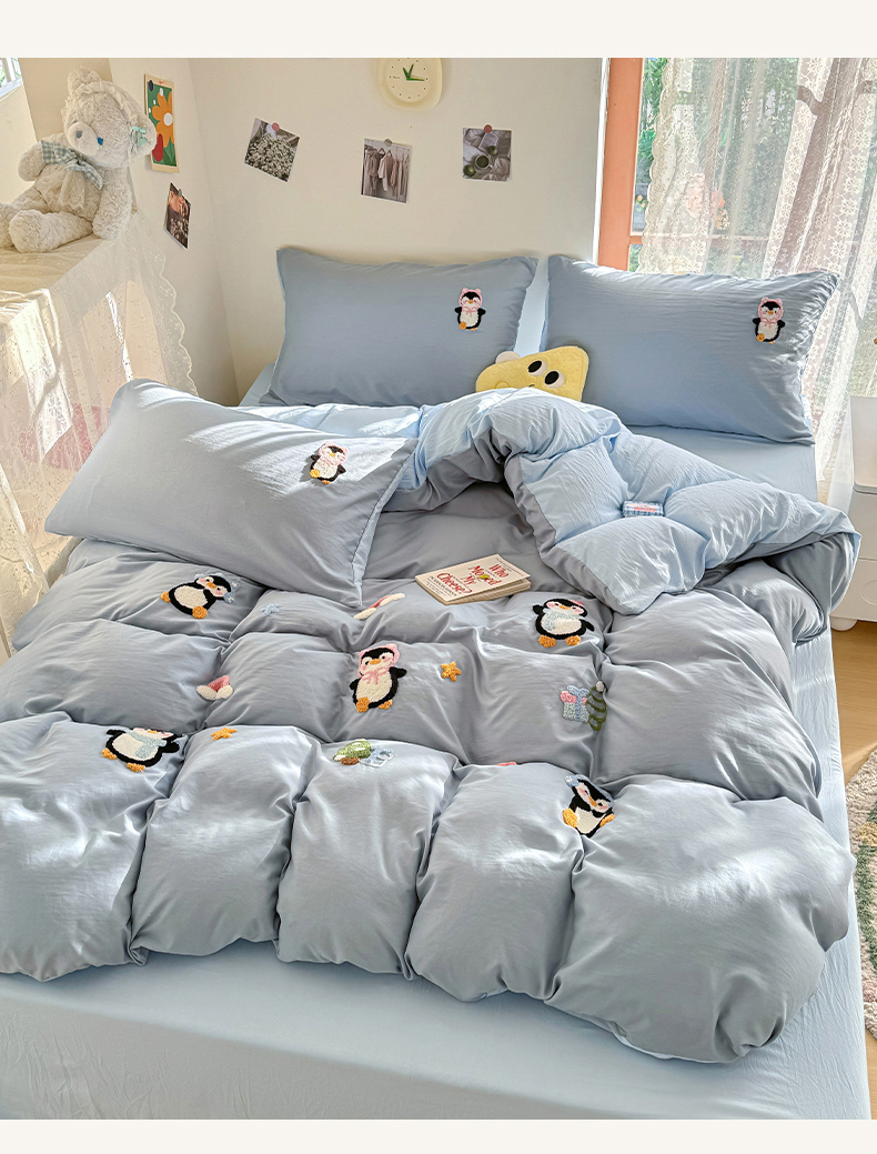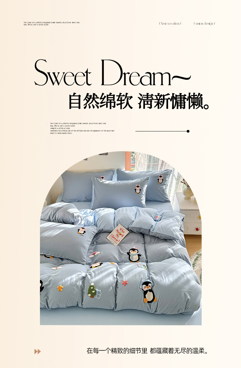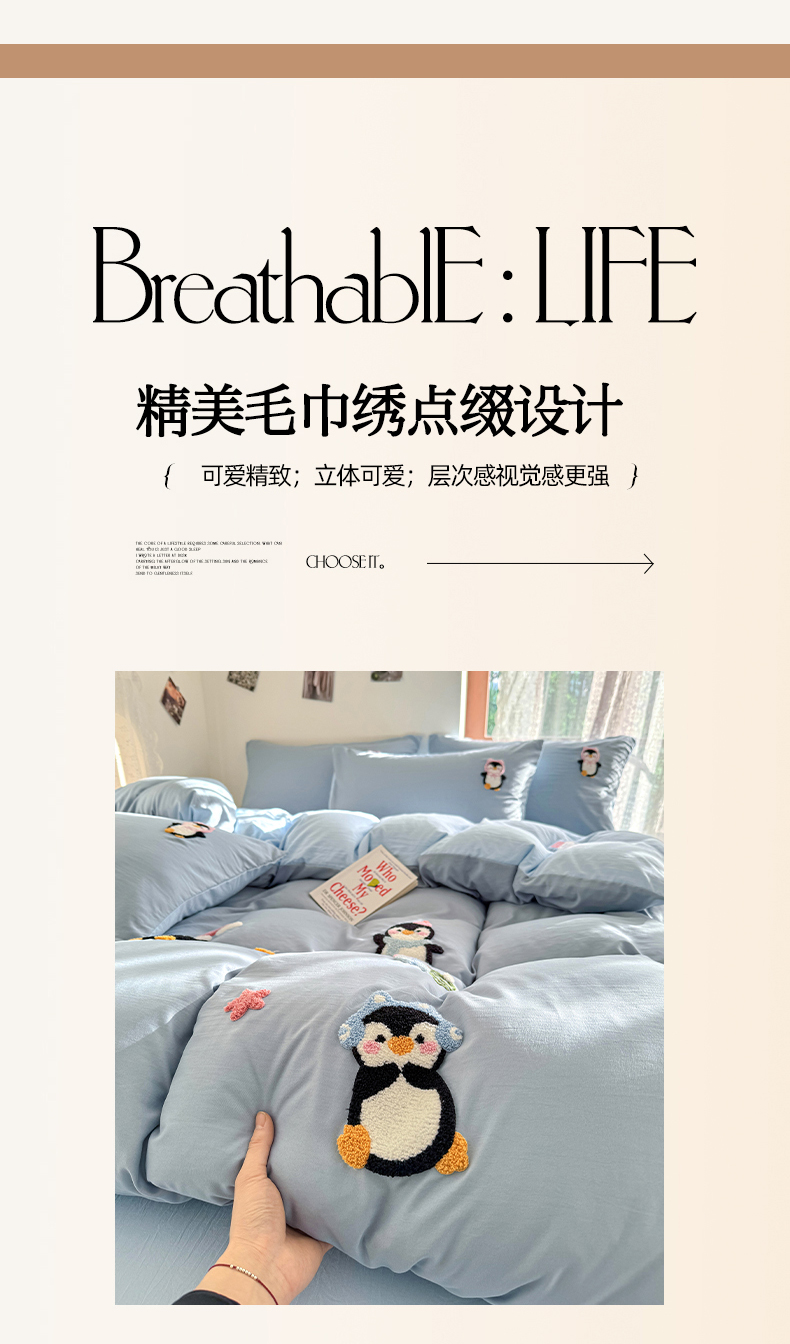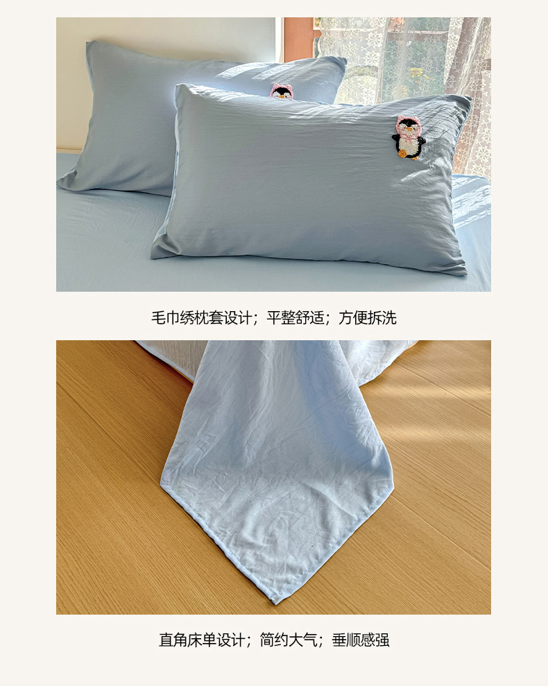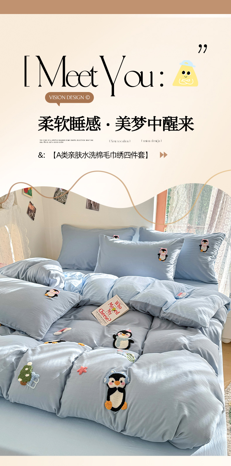 当前位置: 91家纺网 > 商品网购 > 床品套件 > 四件套 > 水洗棉四件套 > 优卡迪家纺馆 2025新款A类亲肤水洗棉毛巾绣四件套(下载文件夹包含买家秀) 小企鹅-月光蓝