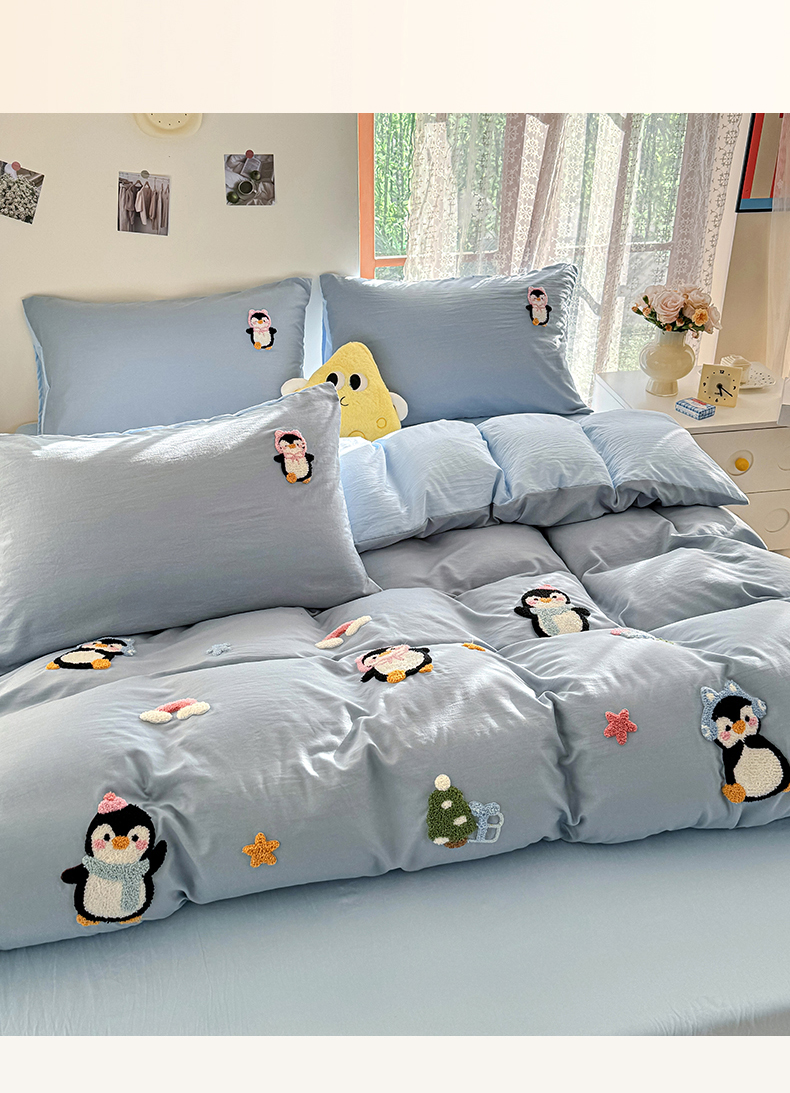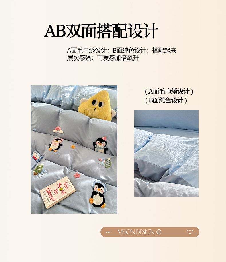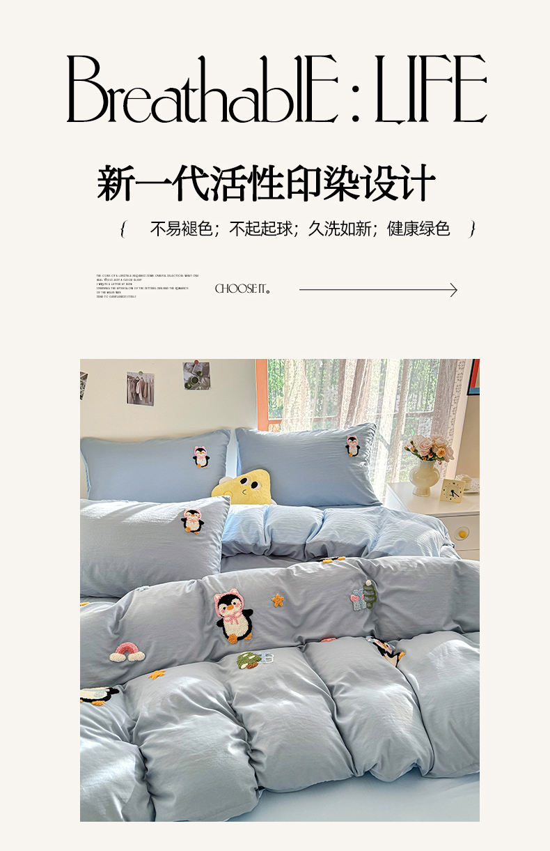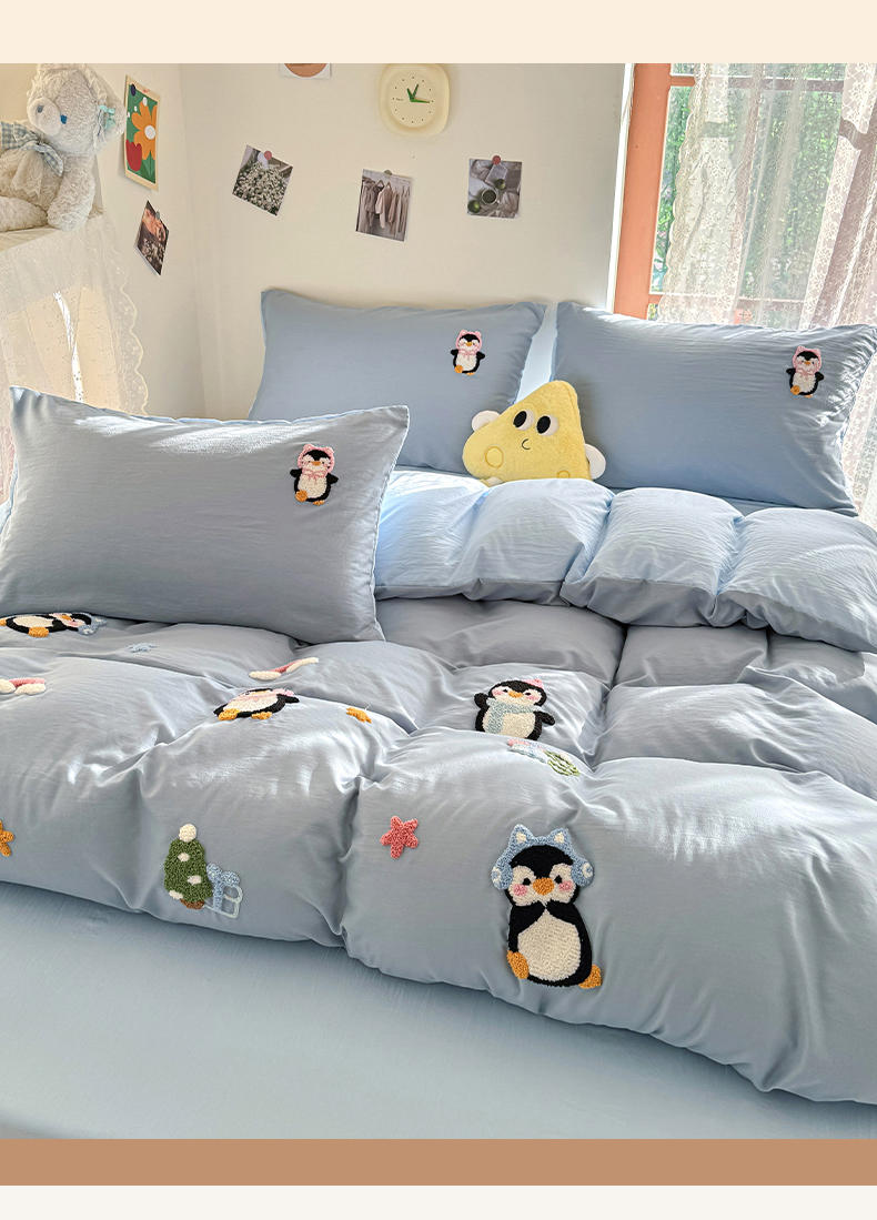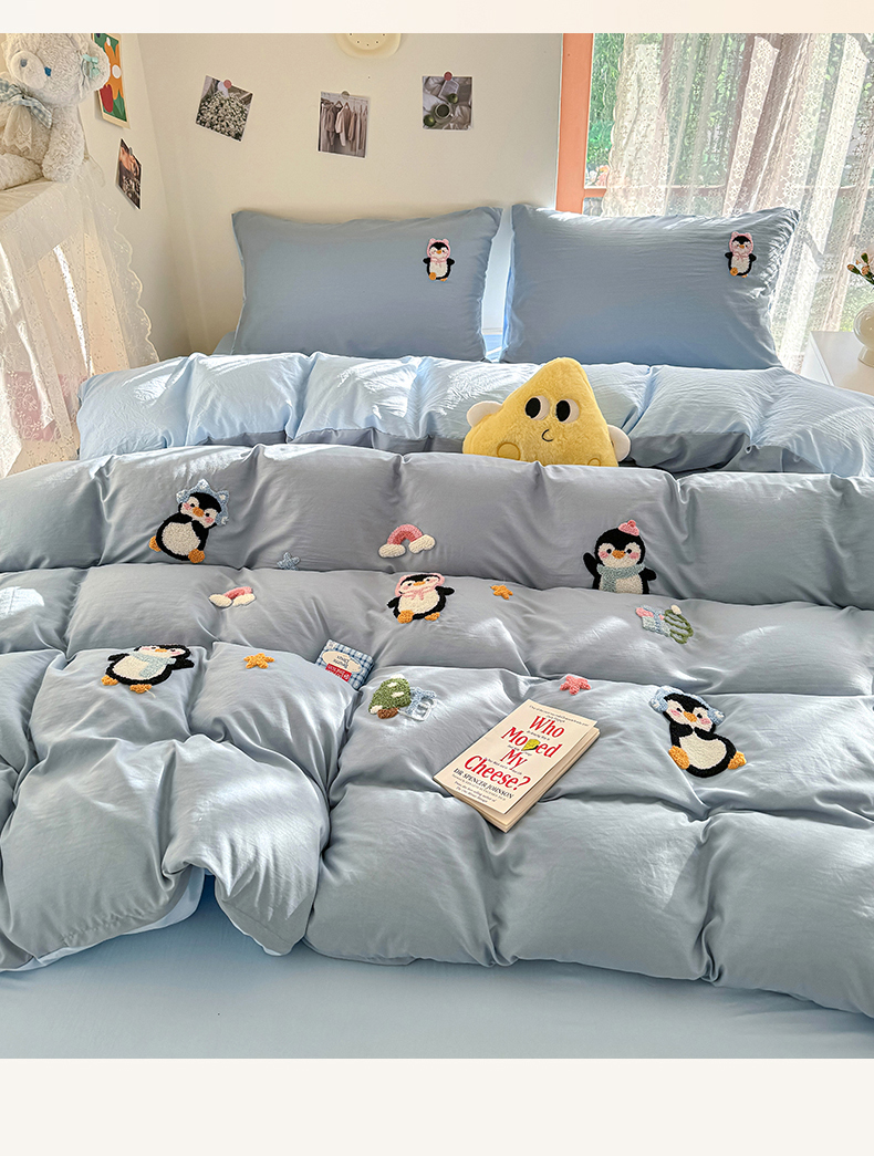当前位置: 91家纺网 > 商品网购 > 床品套件 > 四件套 > 水洗棉四件套 > 优卡迪家纺馆 2025新款A类亲肤水洗棉毛巾绣四件套(下载文件夹包含买家秀) 小企鹅-月光蓝
