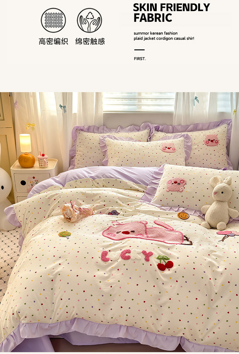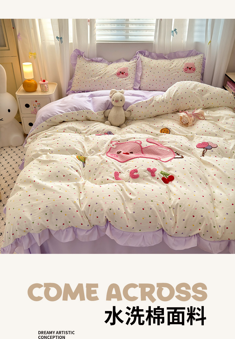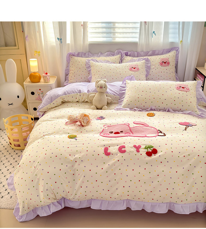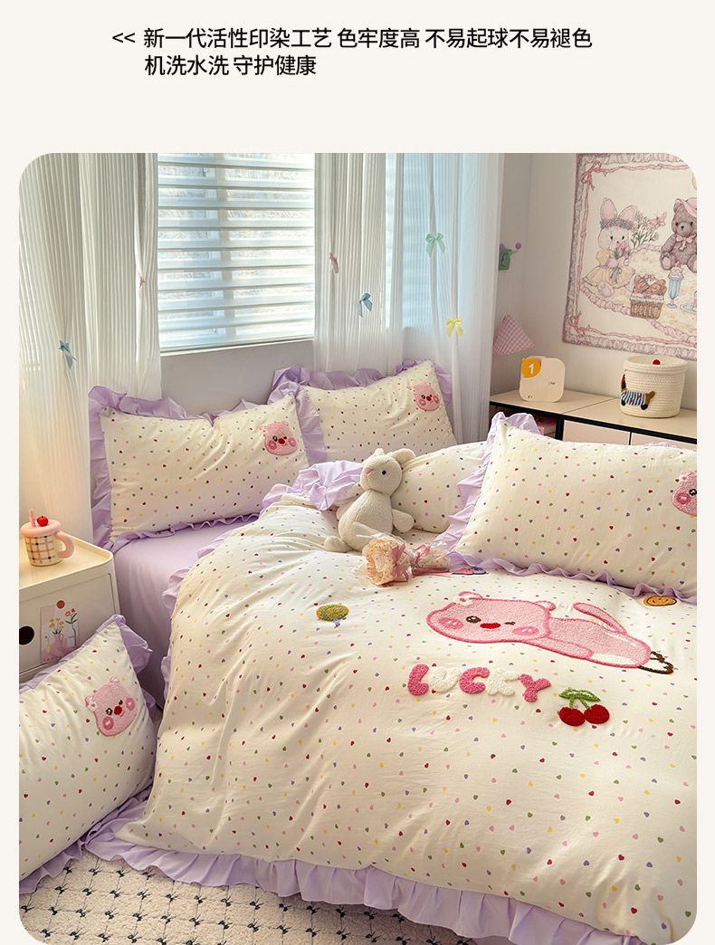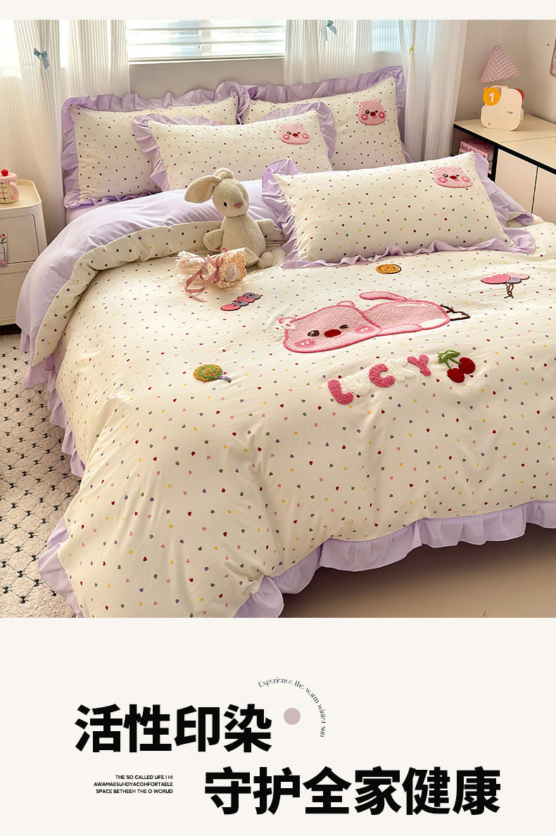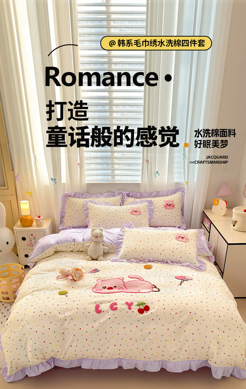 当前位置: 91家纺网 > 商品网购 > 床品套件 > 四件套 > 水洗棉四件套 > 易禾家纺 2025新品韩系小清新水洗棉毛巾绣露比系列四件套(专版花型) 露比-爱心紫