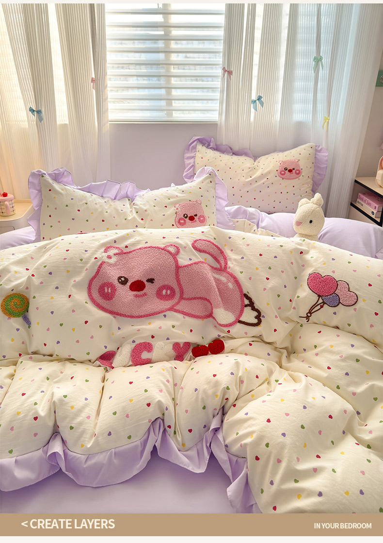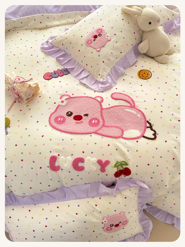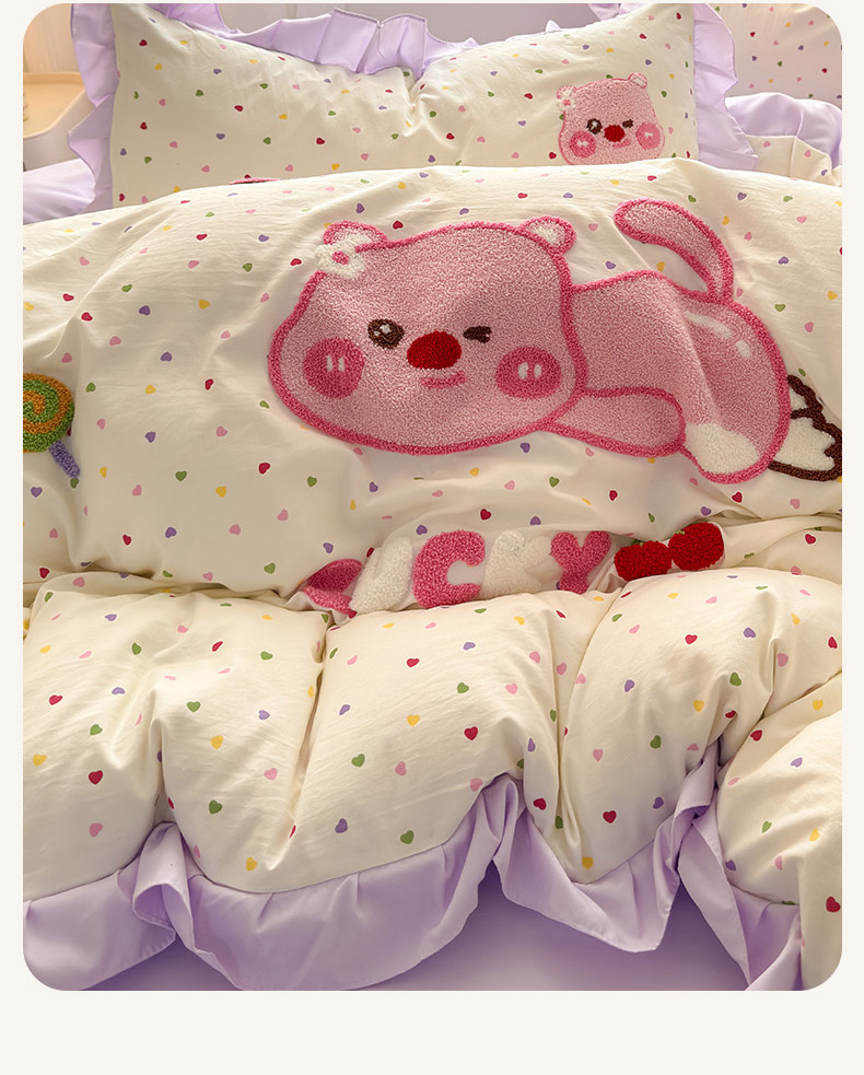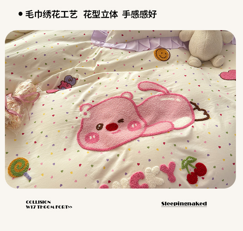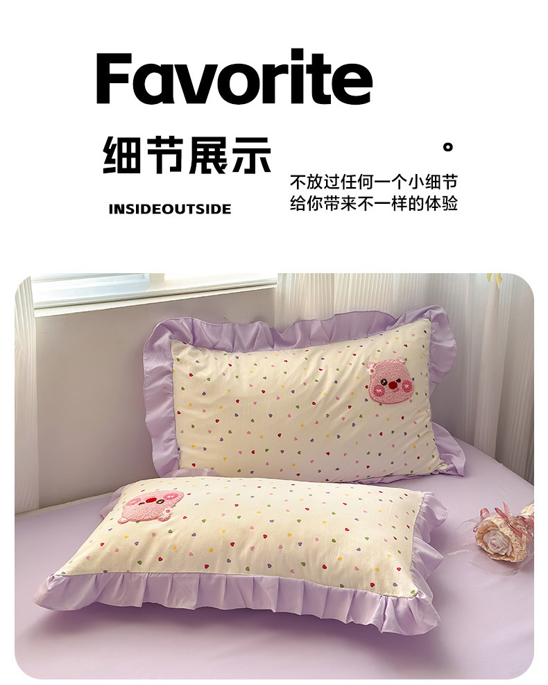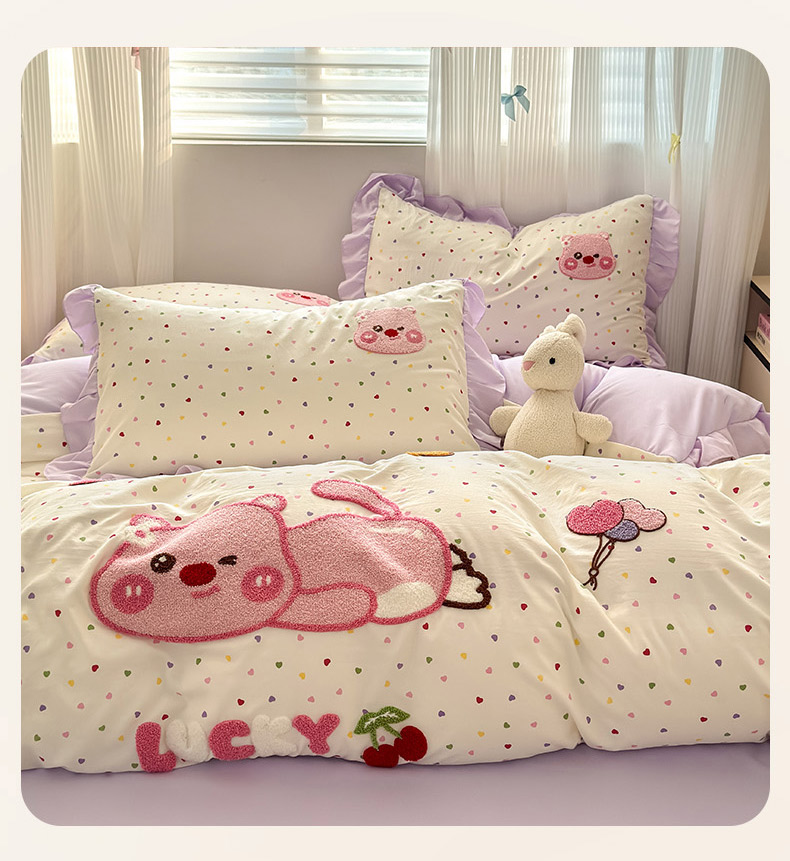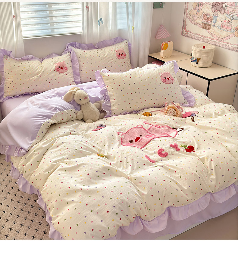 当前位置: 91家纺网 > 商品网购 > 床品套件 > 四件套 > 水洗棉四件套 > 易禾家纺 2025新品韩系小清新水洗棉毛巾绣露比系列四件套(专版花型) 露比-爱心紫