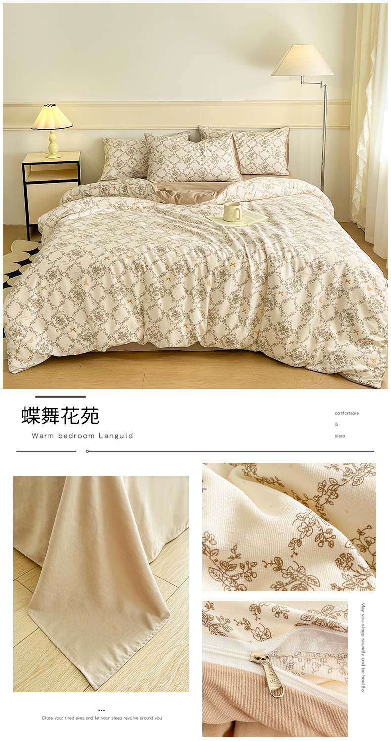 商品名称:悦织湾家纺 2025新款A类针织双层纱小清新印花四件套学生宿舍轻奢时尚三件套床上用品四件套 蝶舞花苑