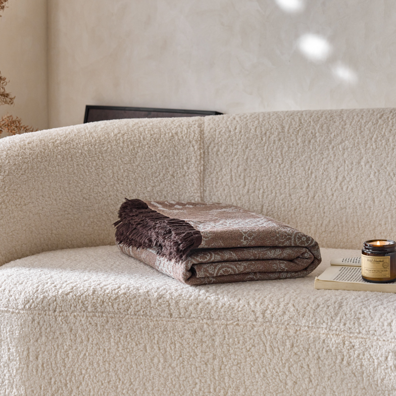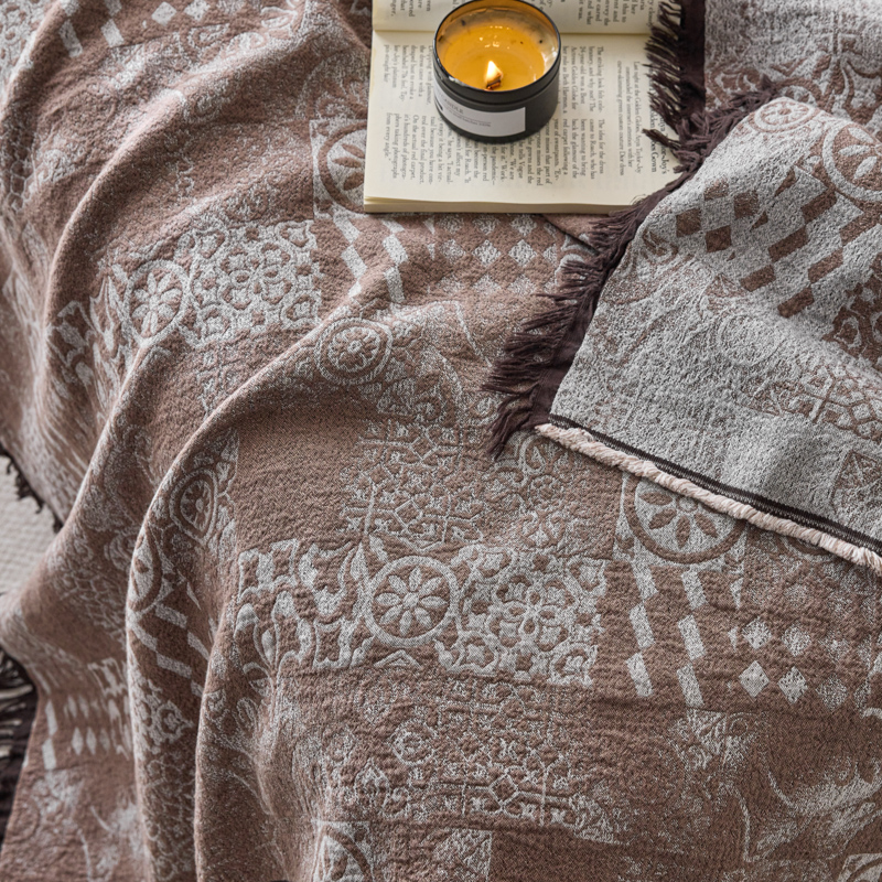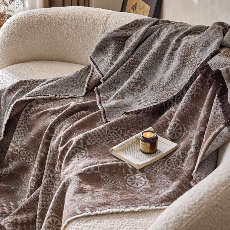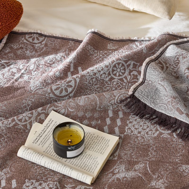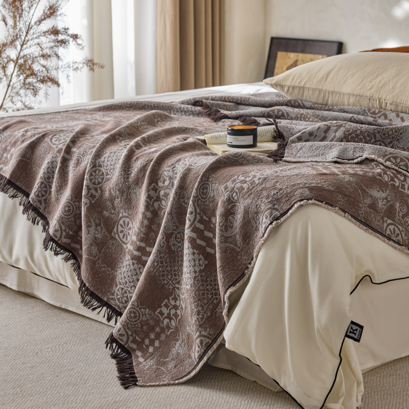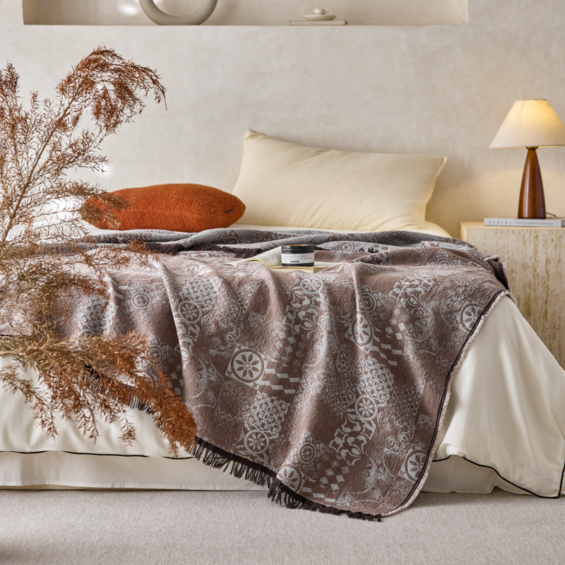 简家居 2025新款全棉色织纱布毯复古流苏毯 山茶----棕