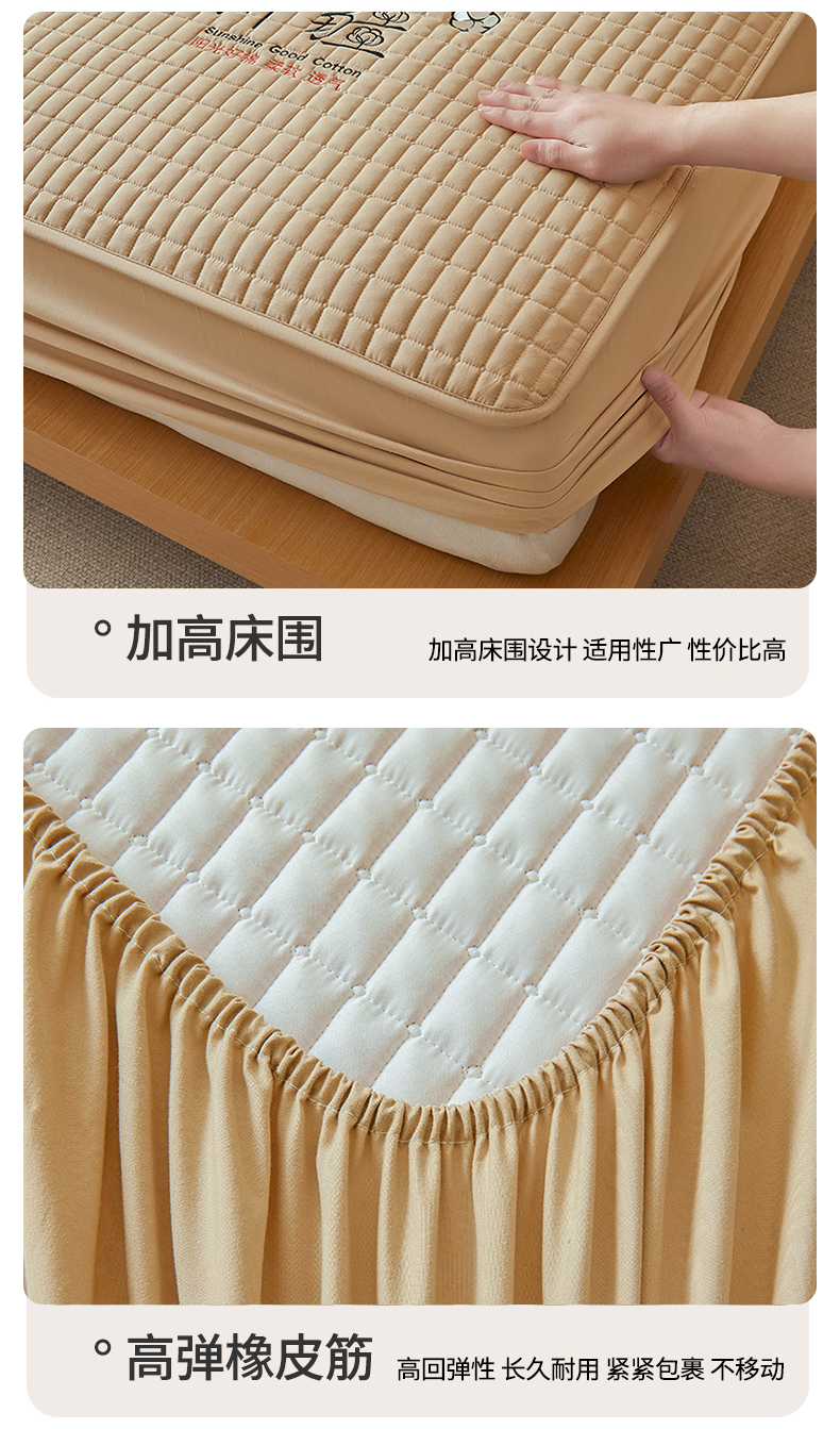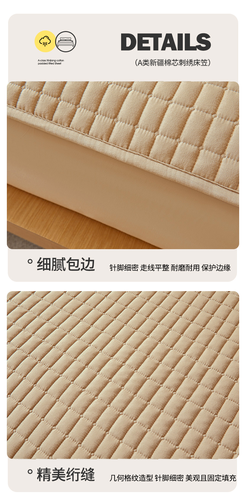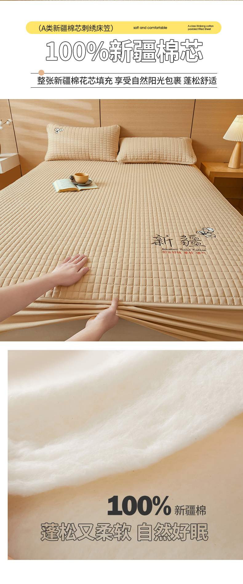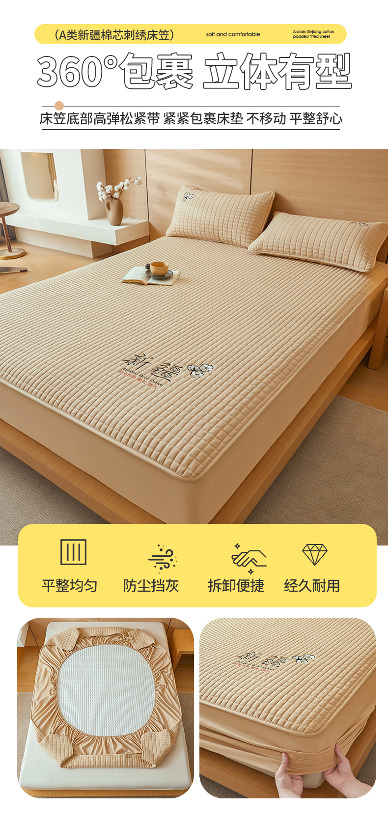 • 91家纺网 家纺一手货源 找家纺 锦眠床笠2025新款刺绣床笠新疆棉花填充-夹棉床笠 奶油咖