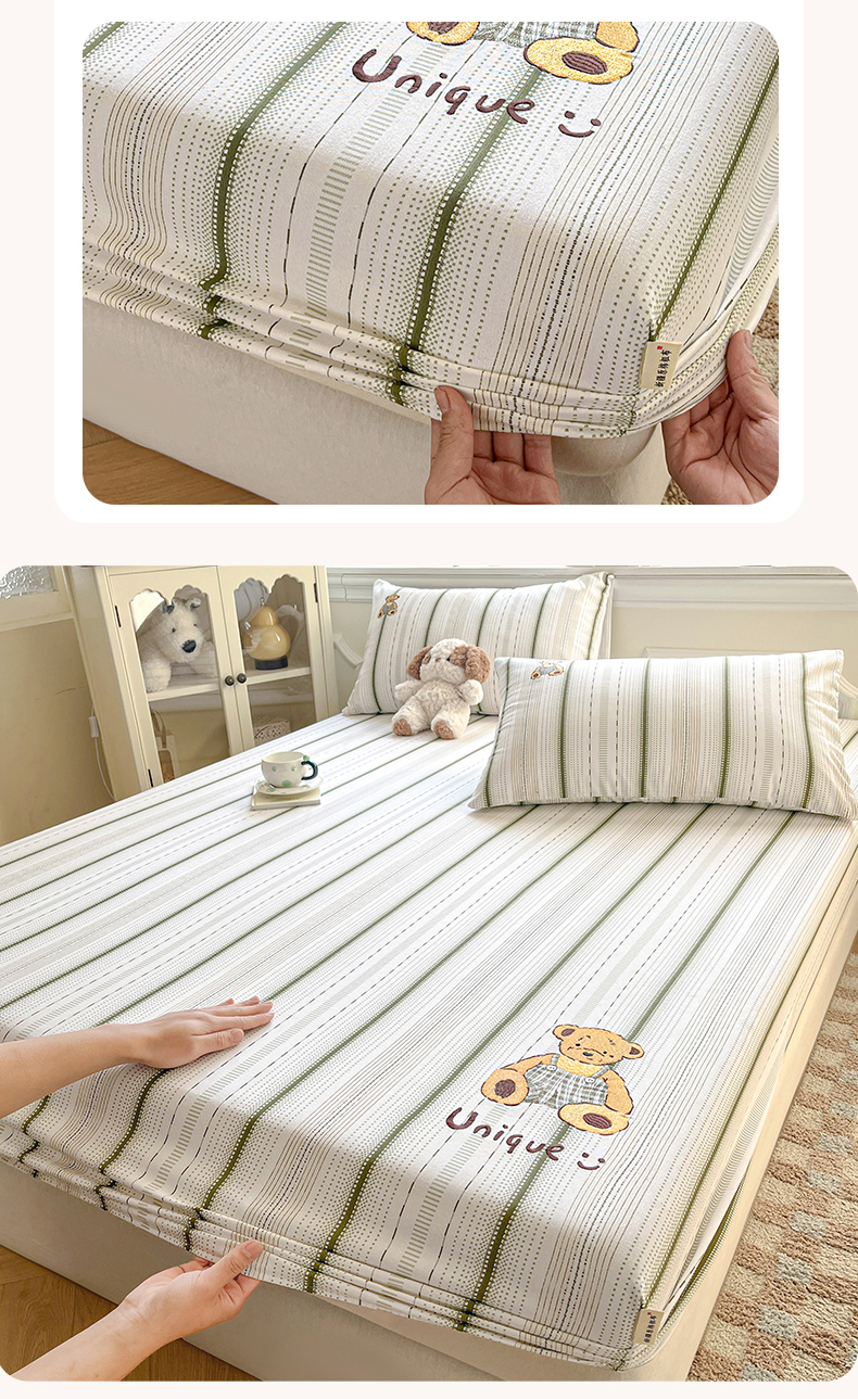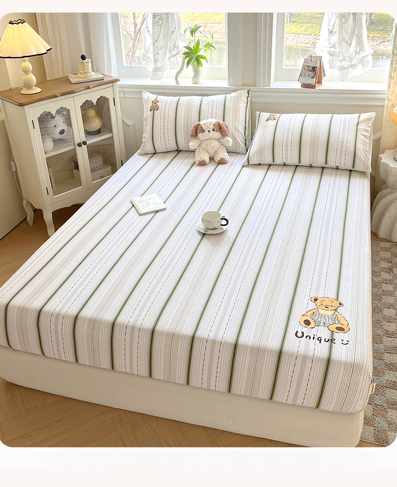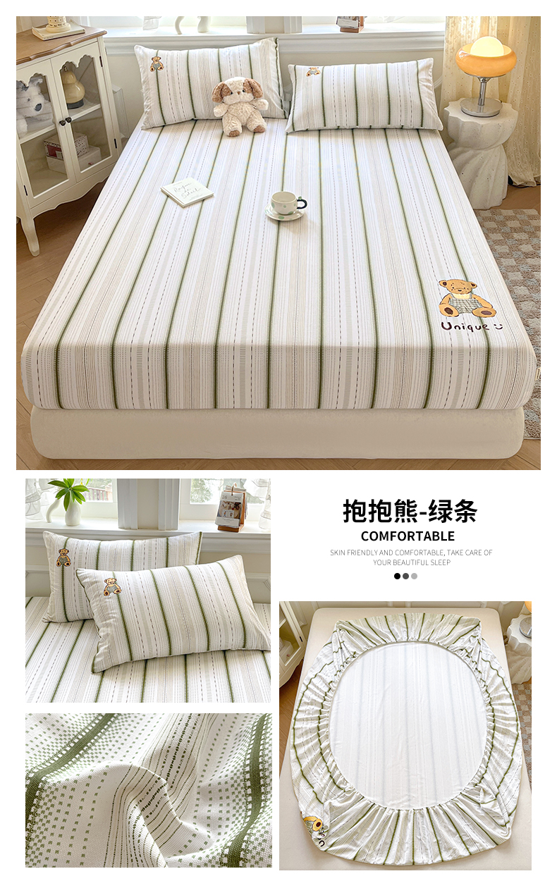 笙意家纺2025新款全棉老粗布单床笠 抱抱熊-绿条