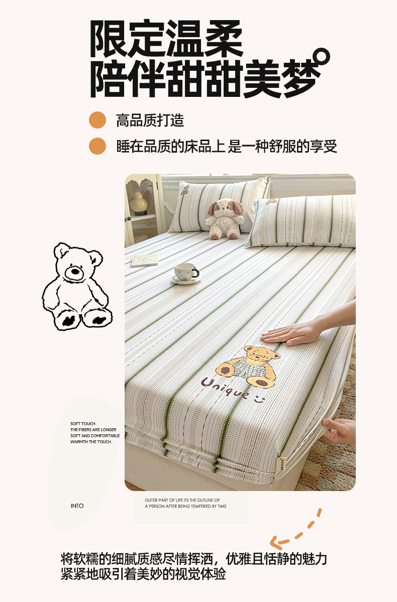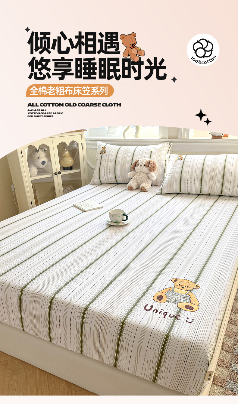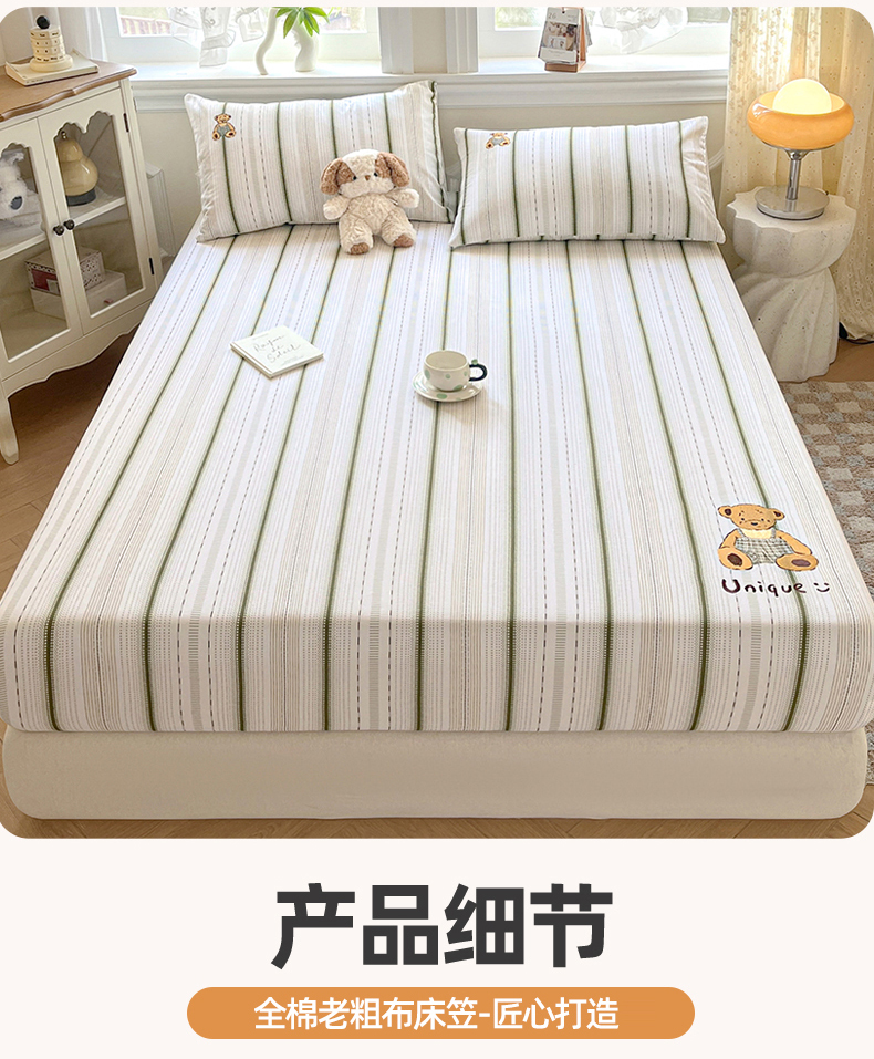 • 91家纺网 家纺一手货源 找家纺 笙意家纺2025新款全棉老粗布单床笠 抱抱熊-绿条