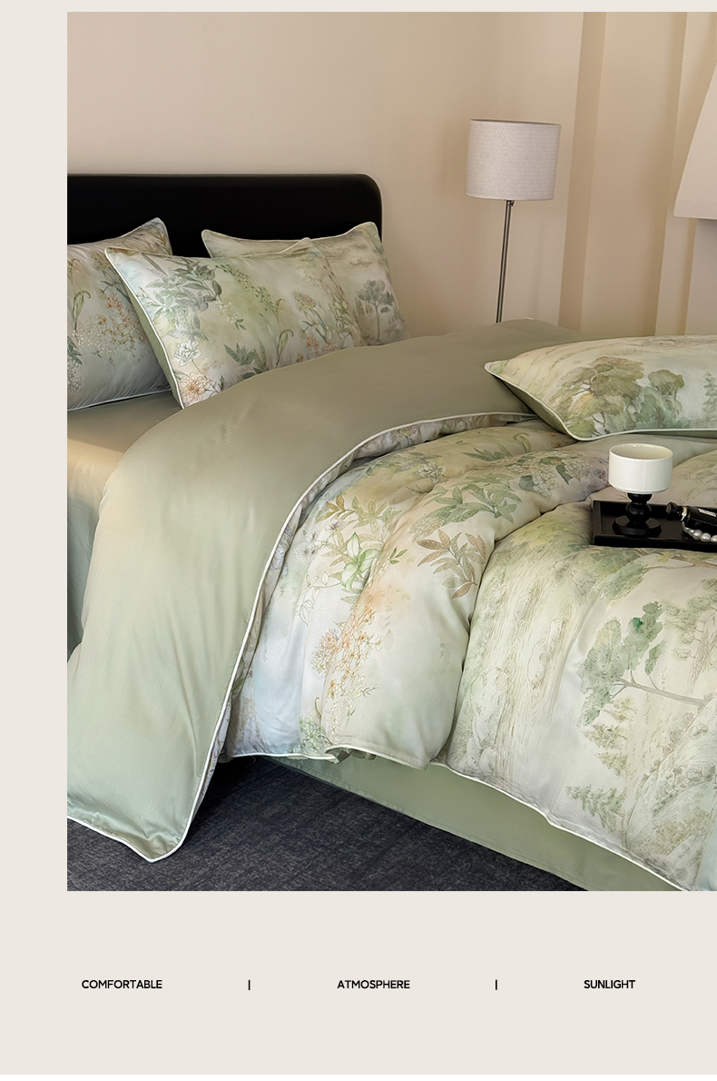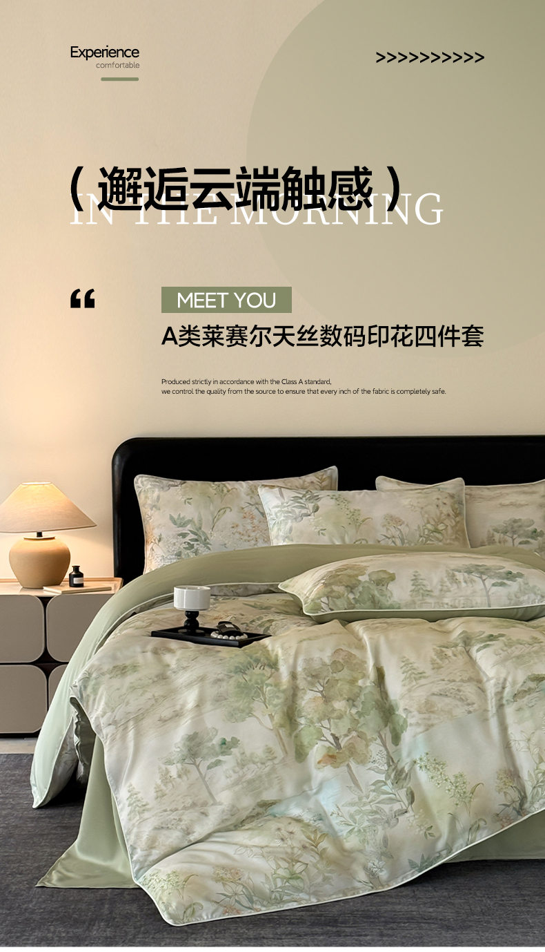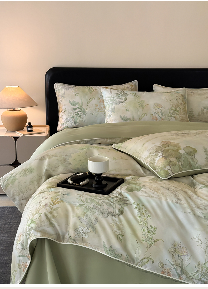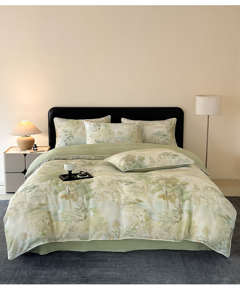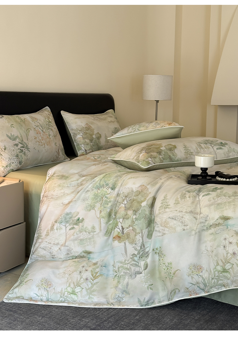 当前位置: 91家纺网 > 商品网购 > 床品套件 > 四件套 > 其它四件套 > 莱登卡奴 2025新款A类50支莱赛尔天丝数码印花麻绳款四件套 远山黛绿