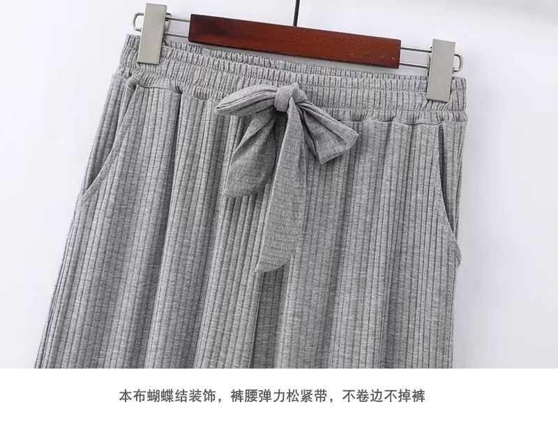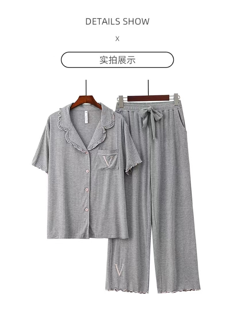 商品名称:洛兰沙家居馆【只代发】【只代发】 2025新款外贸欧美风8*5宽坑条莫代尔睡衣女春夏秋开衫翻领短袖长裤家居服 浅灰