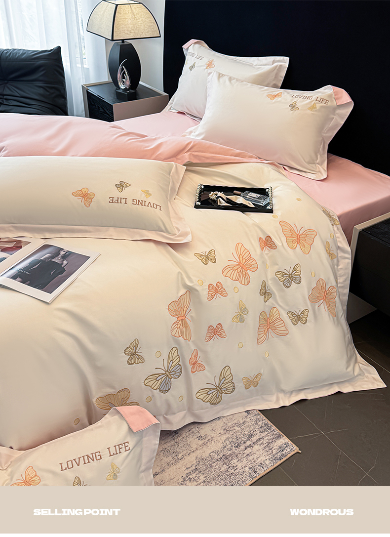 懒猫2025新款高精密40支13374全棉喷气绣花四件套 【带礼盒】 蝴蝶花园-白