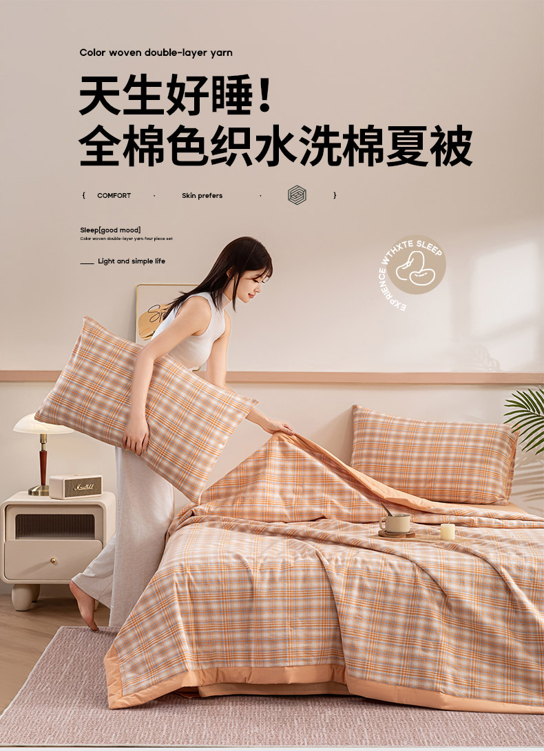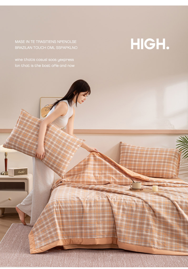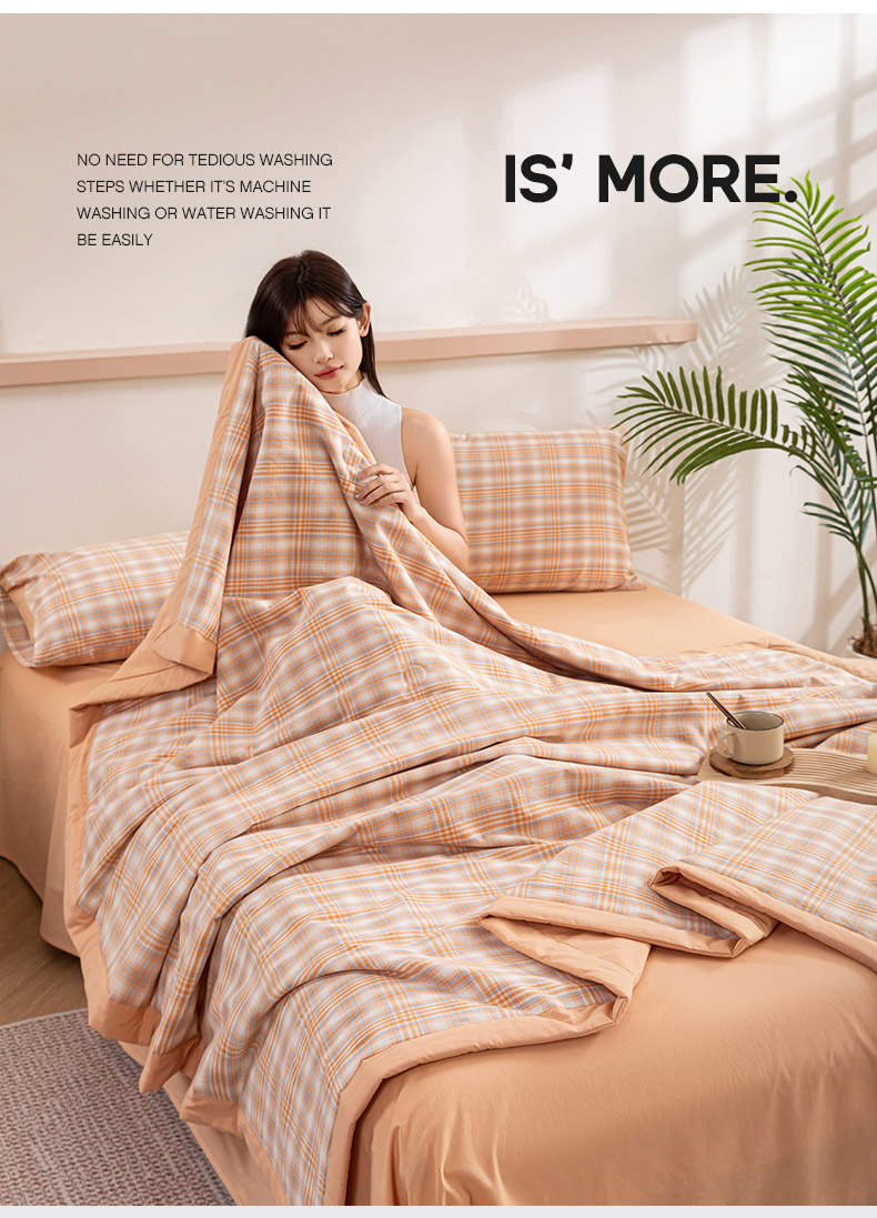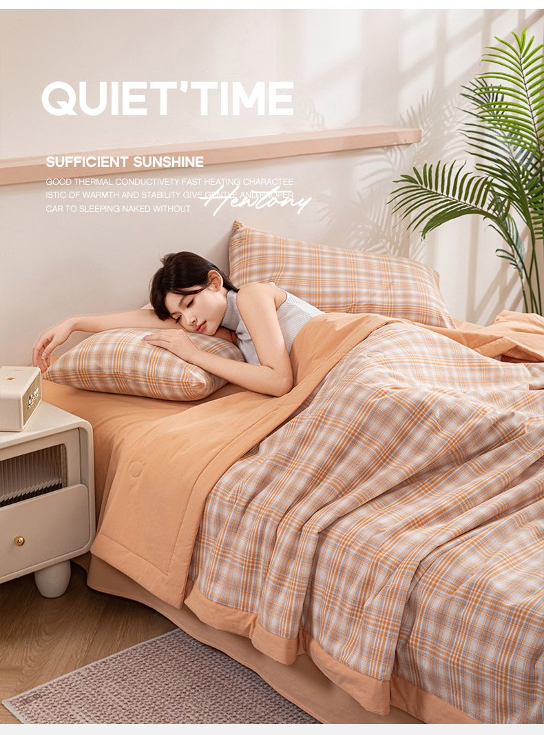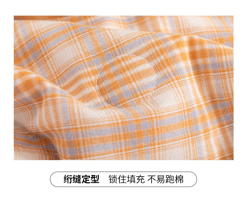 商品名称:吾诺 2025 全棉色织水洗棉夏被大豆夏被四件套被子被芯空调被夏凉被 桔色格