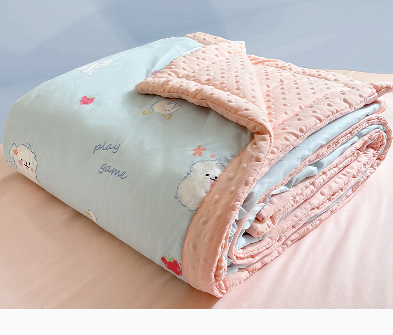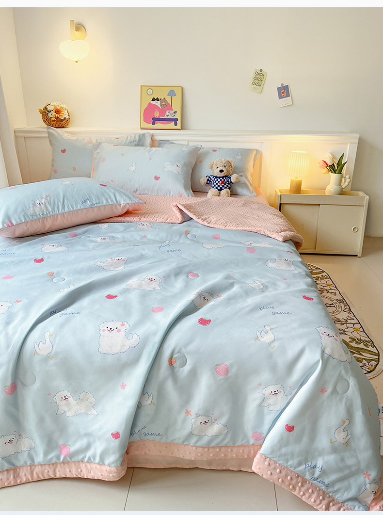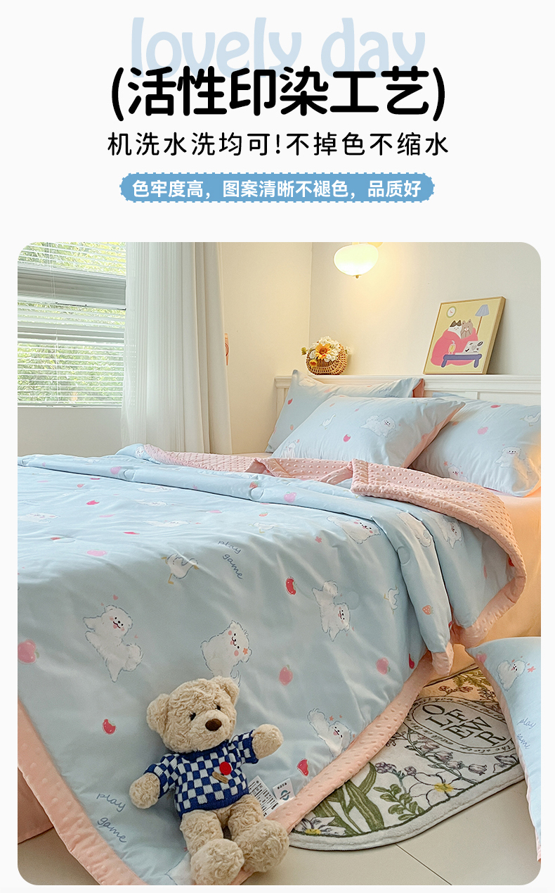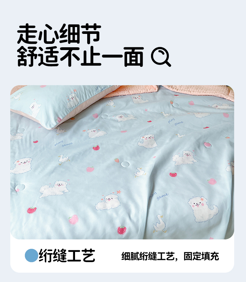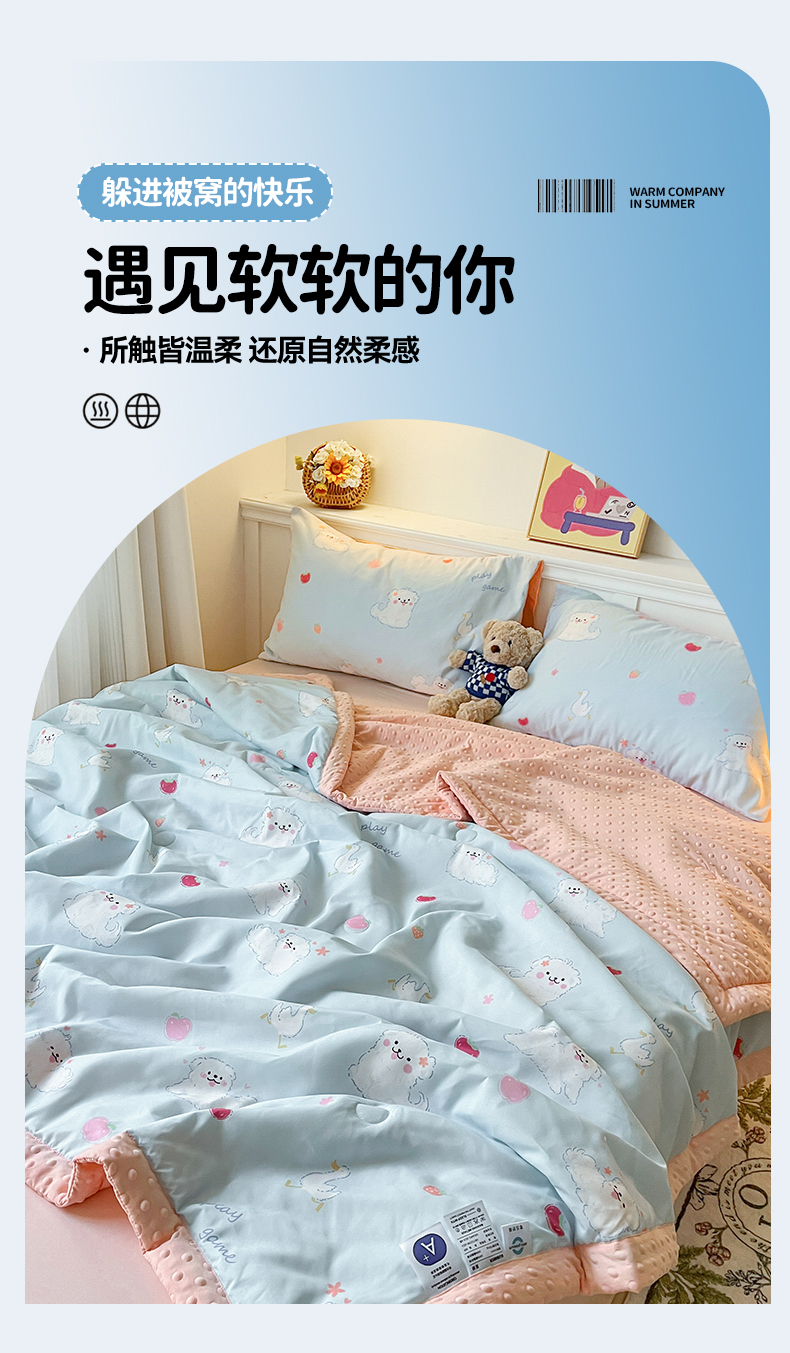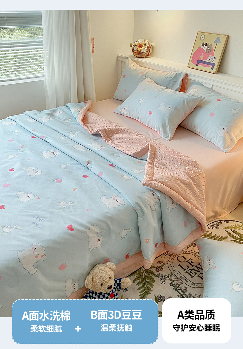 • 91家纺网 家纺一手货源 找家纺 盛秋家纺 2026新款A类水洗棉豆豆夏被系列 甜心猫+奶油粉