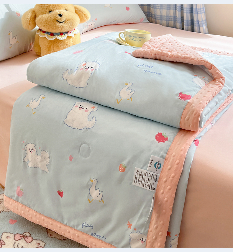 (总)盛秋家纺 2026新款皱皱纱印花夏被-萝拉,生日派对+清新绿,格子花园+奶油粉,格子铺粉+天空蓝,花丛小熊+奶油粉,可可颂蓝+天空蓝,恐龙游记+天空蓝,快乐时光+深咖,麻薯团+米驼,派对狗+深咖,森林小象+奶油粉,小狗来信+奶油粉,小伙伴+米驼,小熊小花+麦绿,修勾咖+米驼