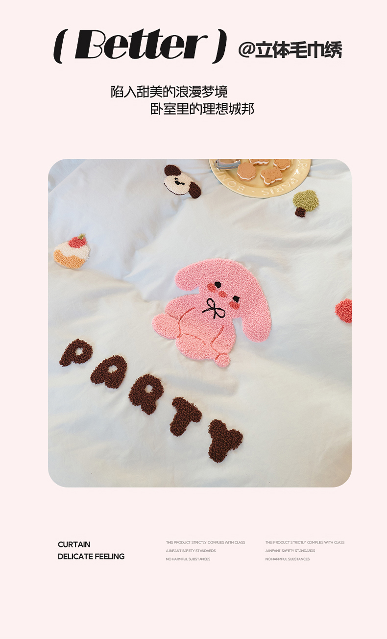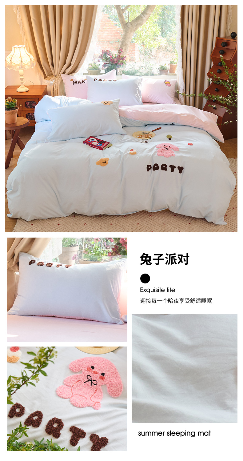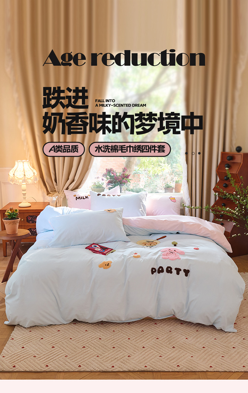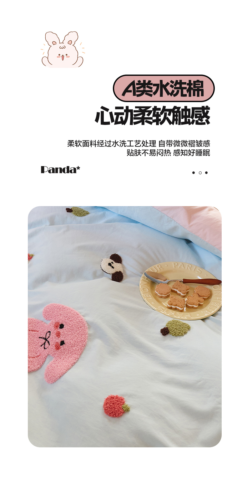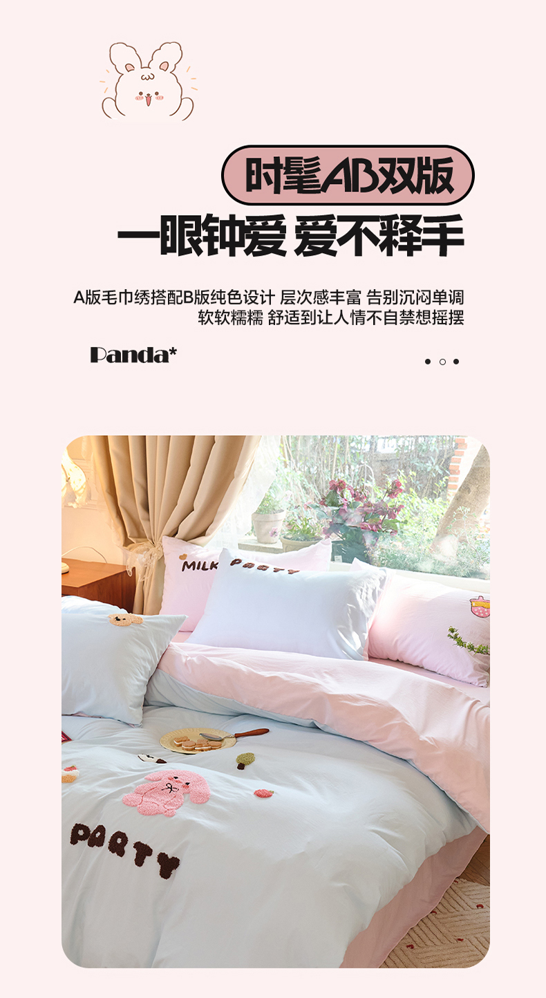 当前位置: 91家纺网 > 商品网购 > 床品套件 > 四件套 > 全棉普通四件套 > 鑫喜莱 2025新款水洗棉毛巾绣四件套场景一【全系图有买家秀文件】 兔子派对