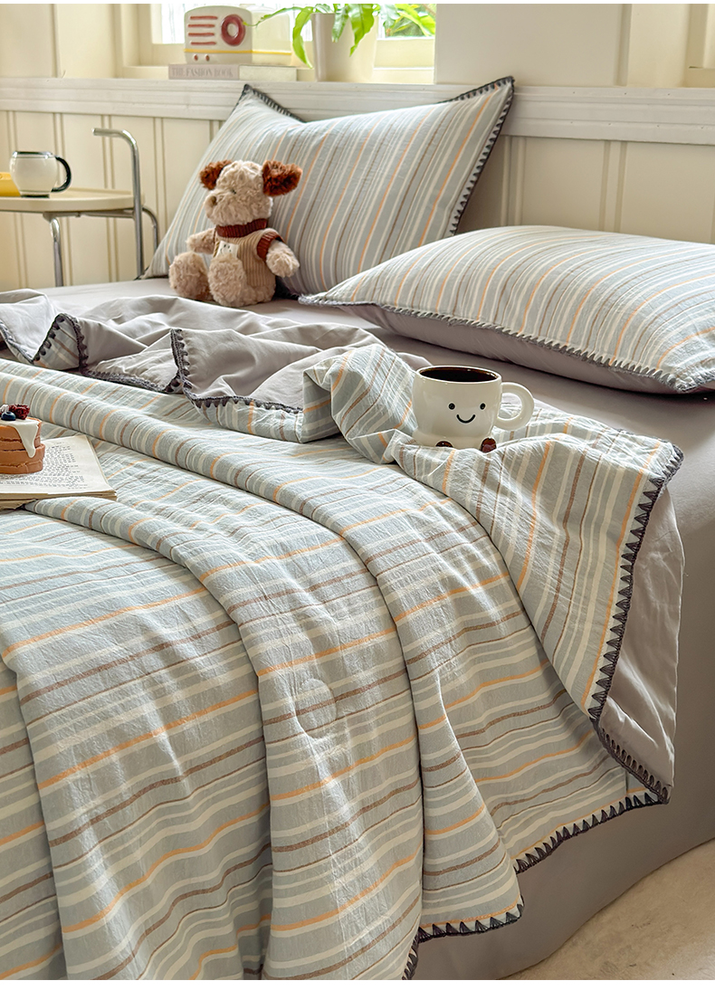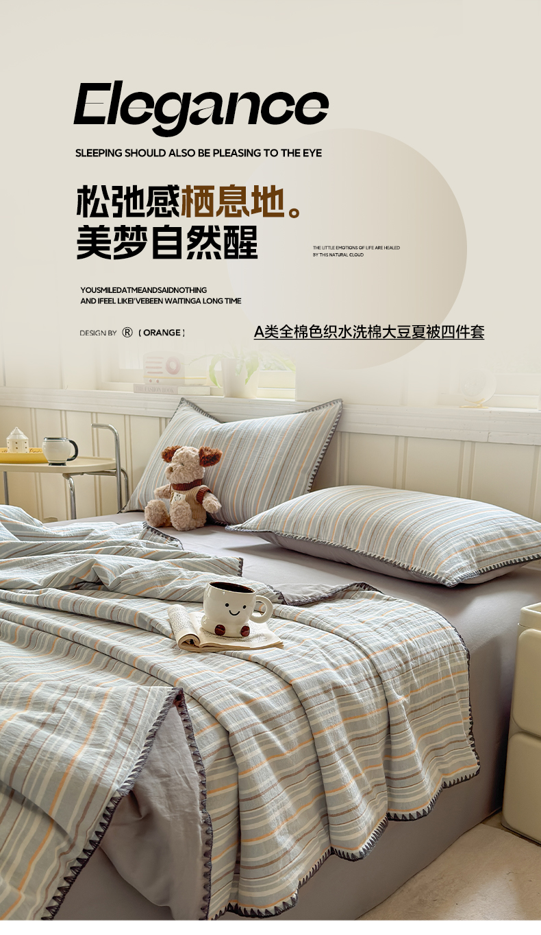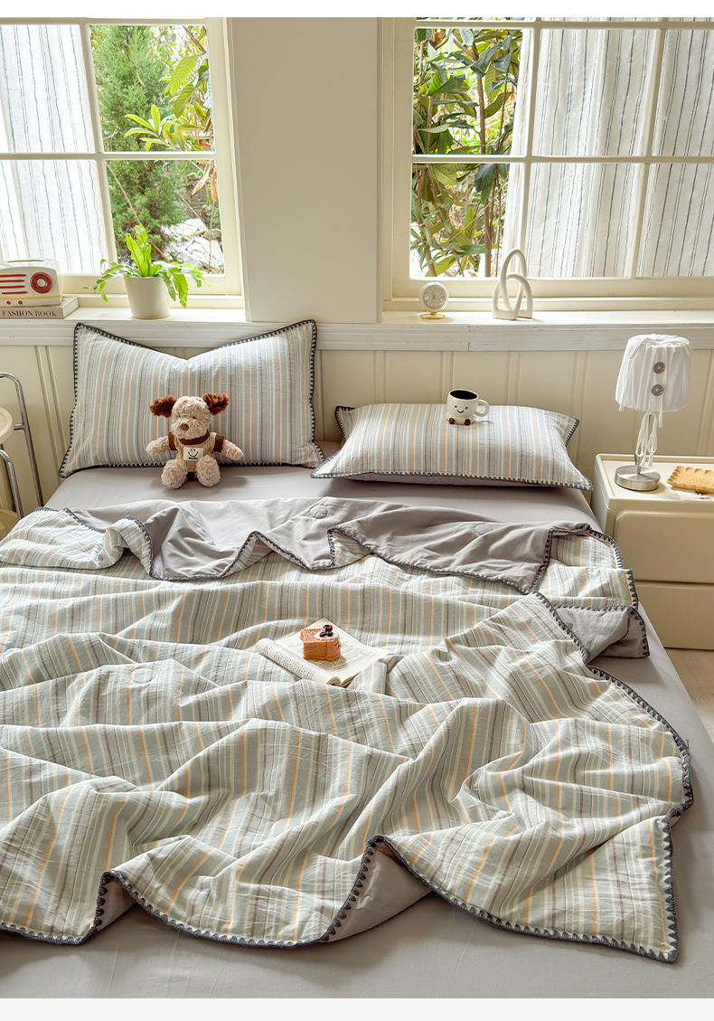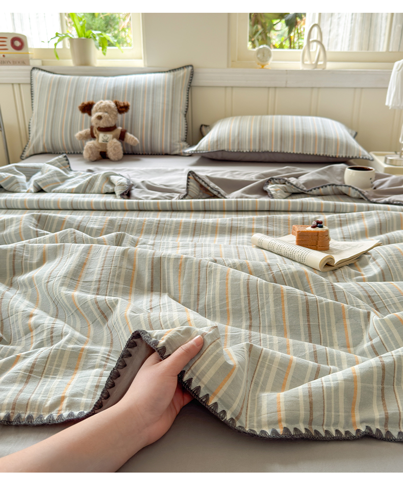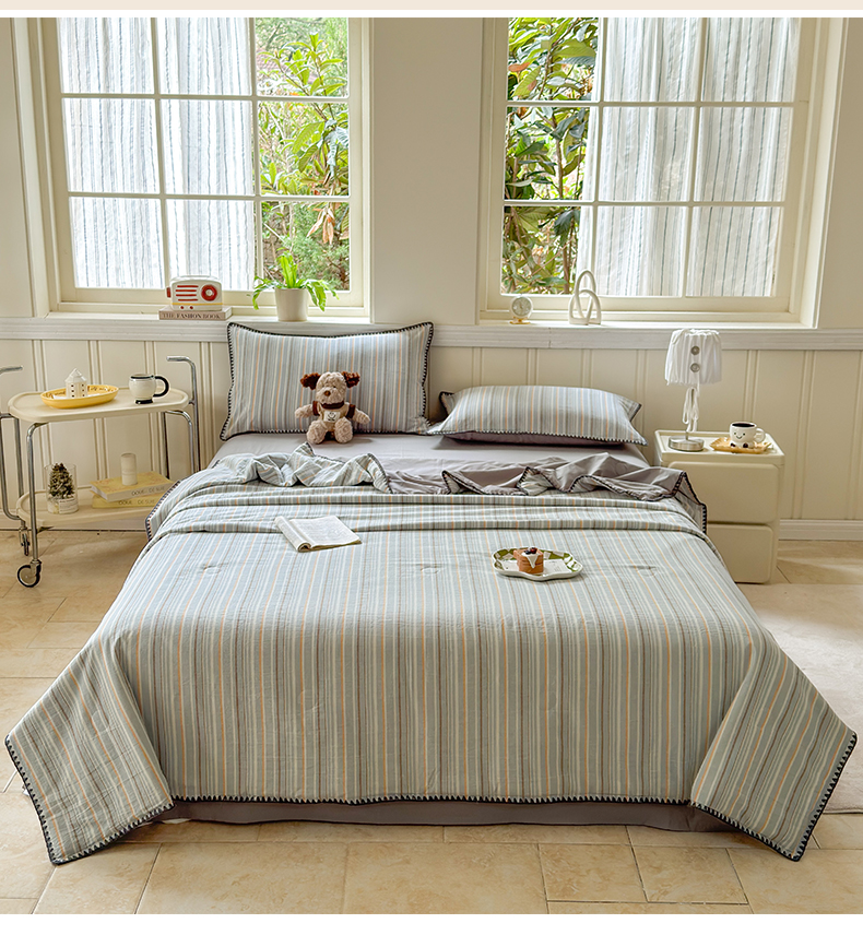 当前位置: 91家纺网 > 商品网购 > 床品套件 > 四件套 > 夏被四件套 > 莱登卡奴 2025新款A类全棉色织水洗棉大豆夏被四件套系列 色织夏被-静谧浅灰