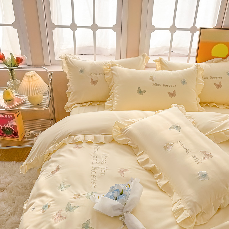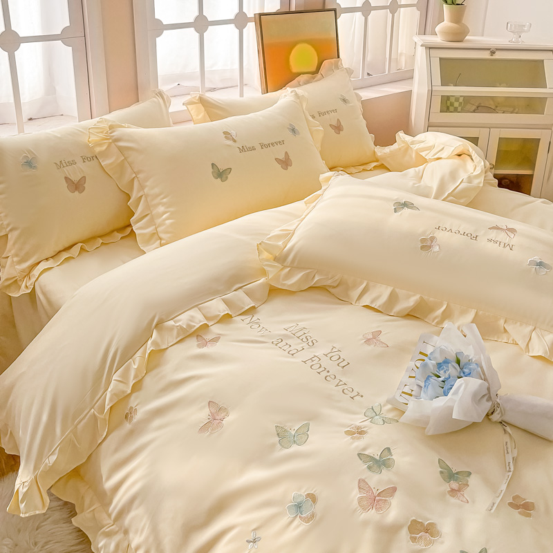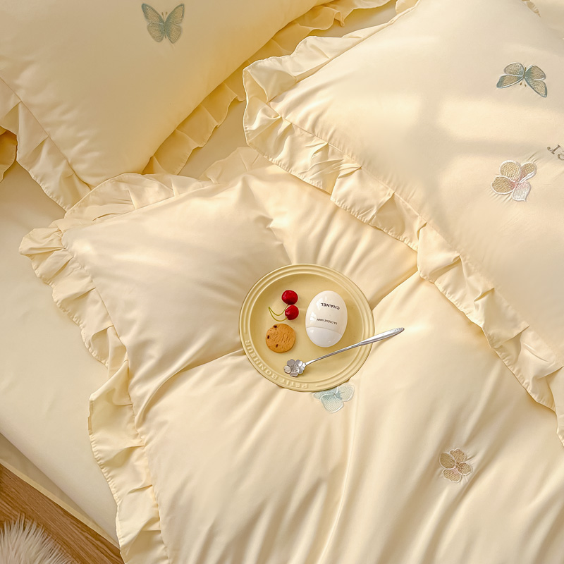 商品名称:恋之语 2025新款水洗棉刺绣花边四件套-蝶羽 蝶羽-黄