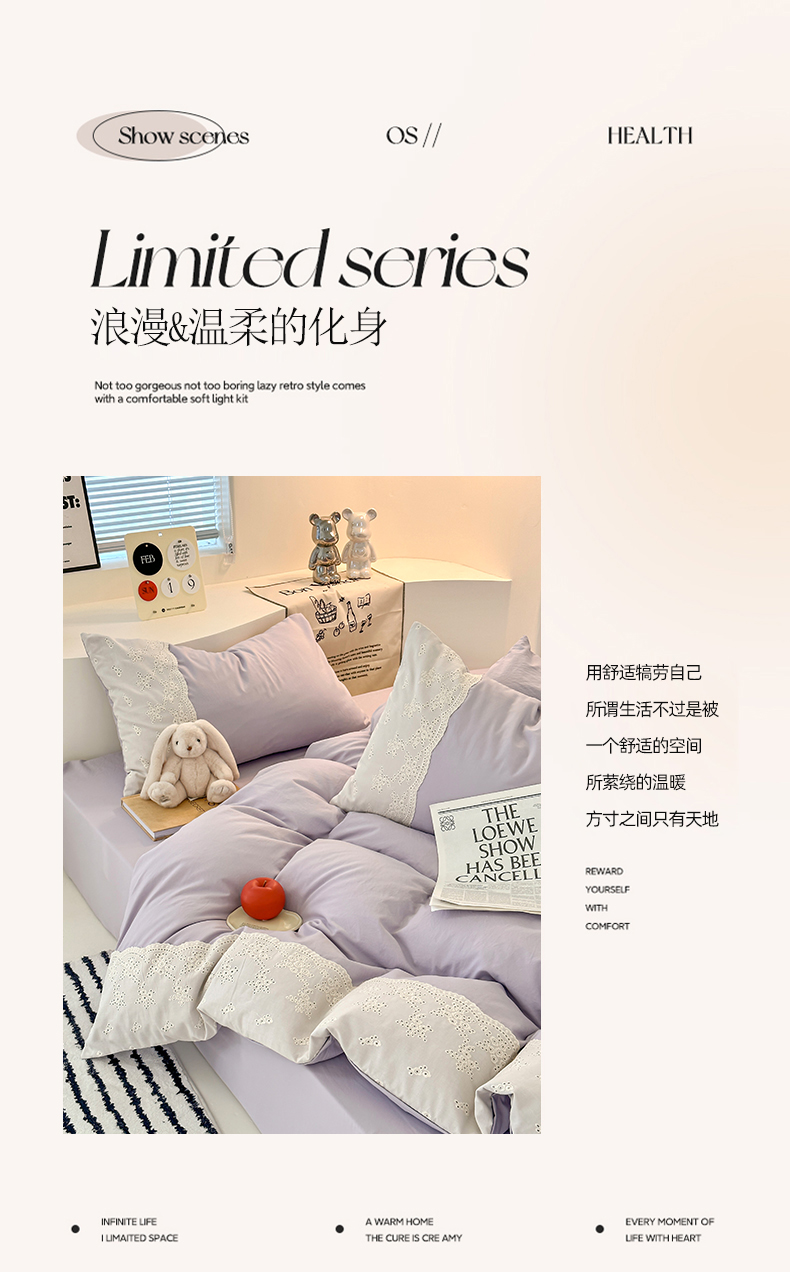 商品名称:凯洛奇 2025新款1法式小清新蕾丝花边水洗棉四件套-风格一【提供买家秀】 蕾丝花边-薰衣草紫