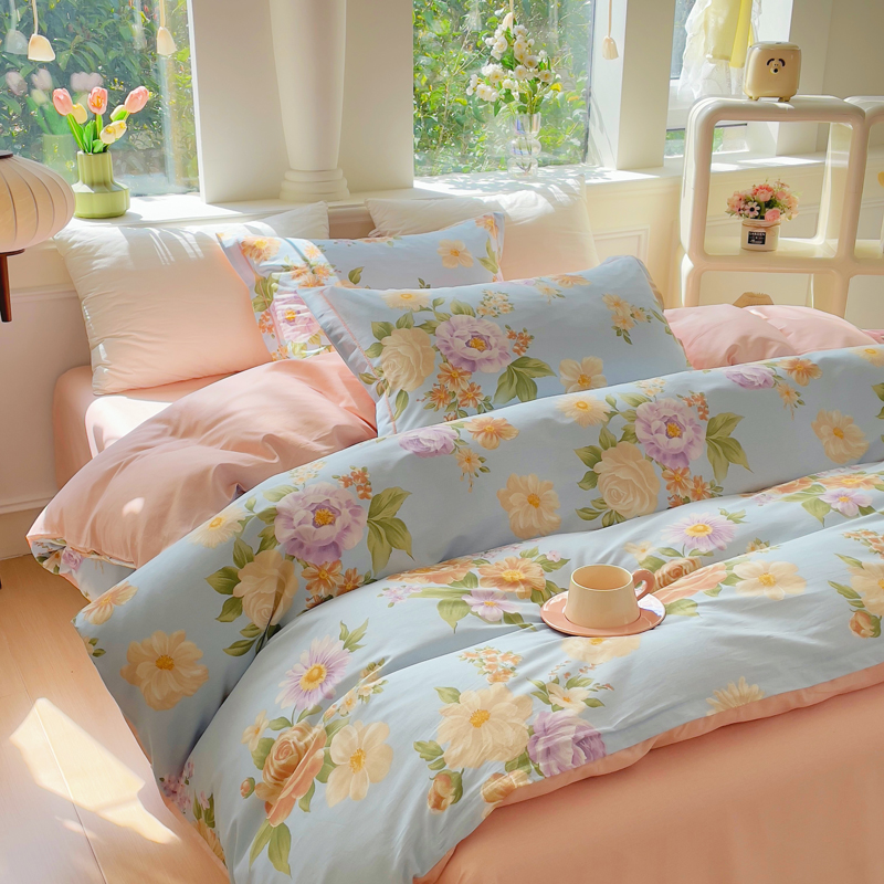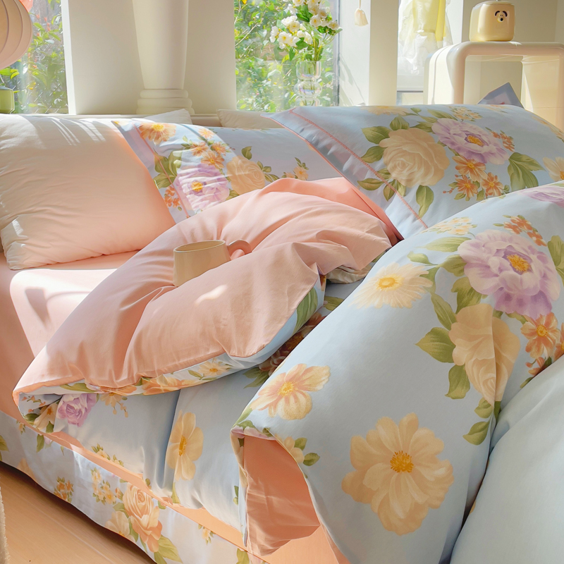 铭博家纺 新款直播爆款网红全棉四件套13070印花吊边一字绣纯棉被套工艺款 花语呢喃,花语呢喃