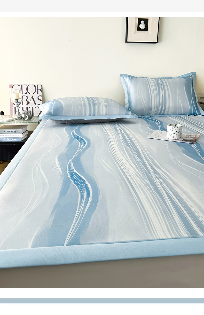 商品名称:倾慕 2025新款A类简约风冰爽牛奶丝凉席三件套 曲线幻影蓝