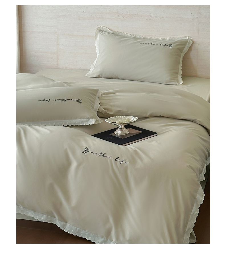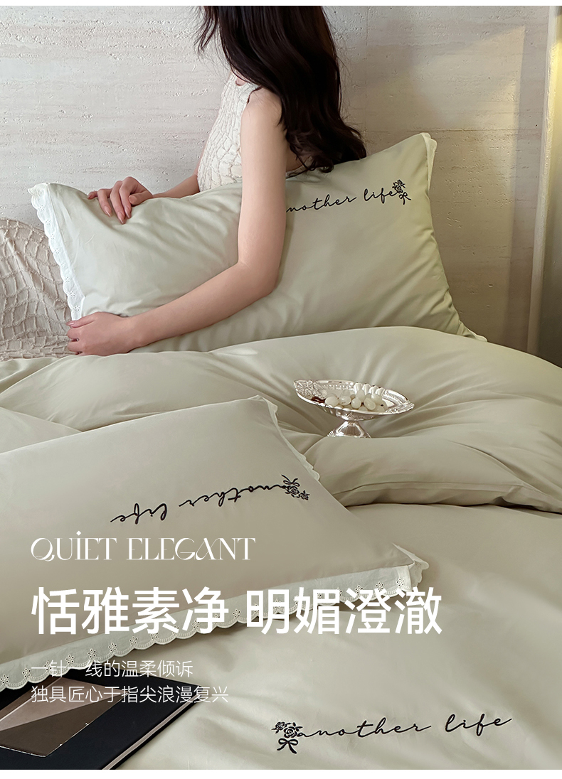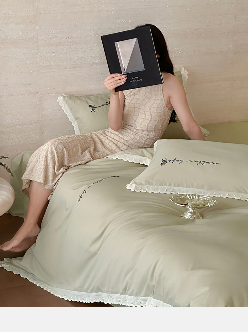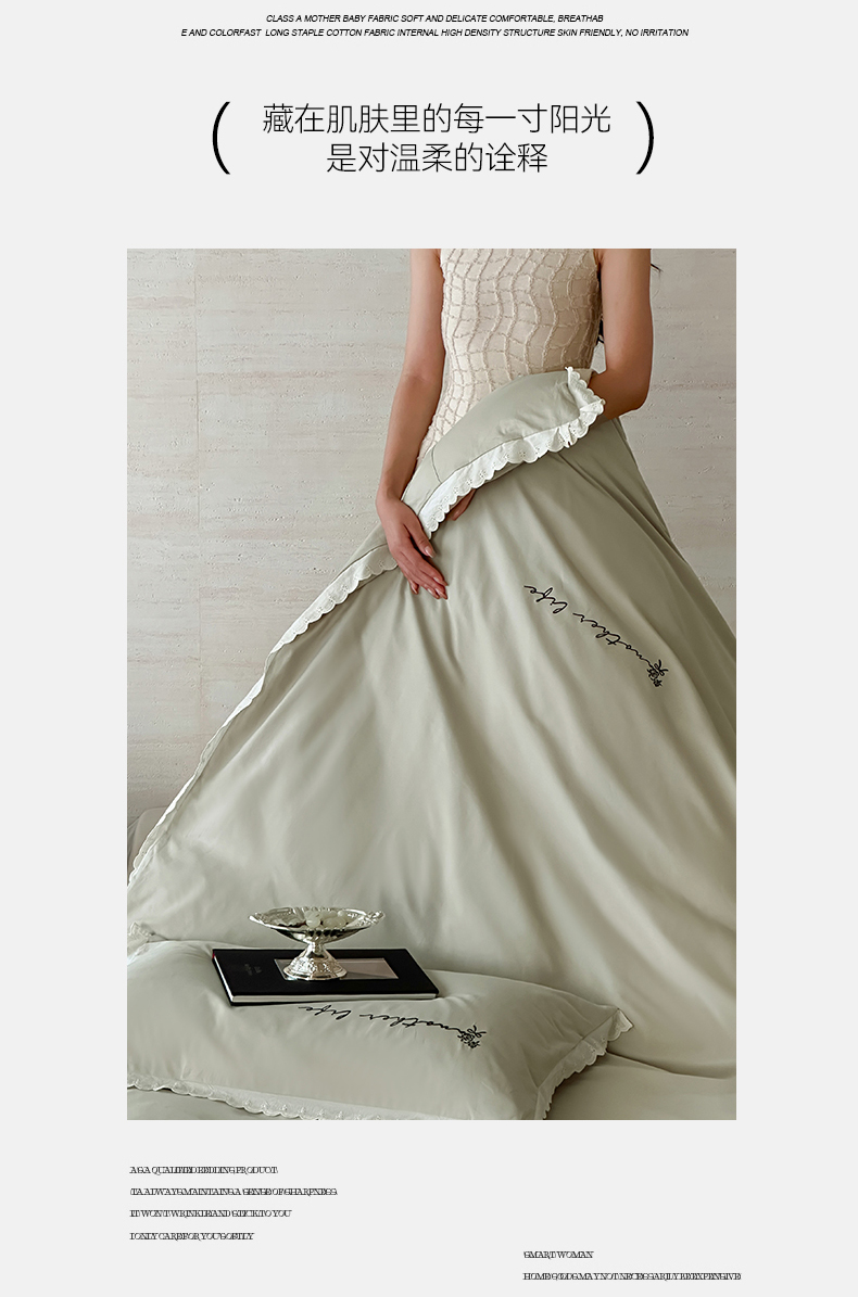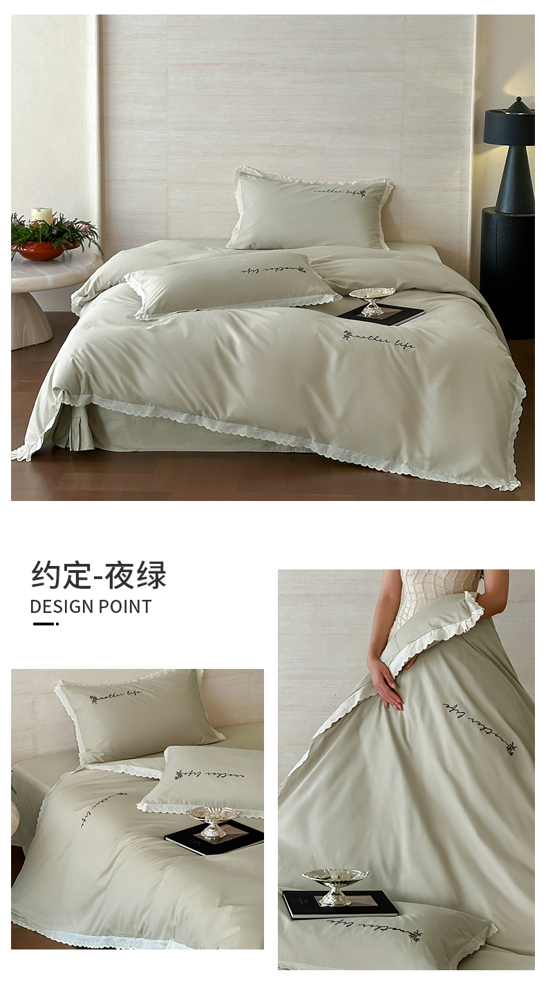 商品名称:名品优仓 2025新款纯棉水洗棉双层纱提花韩版花边四件套-约定 约定-夜绿
