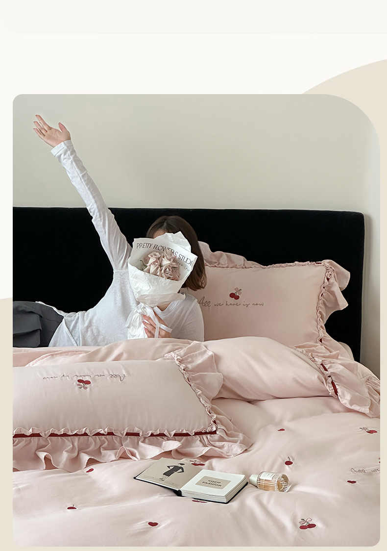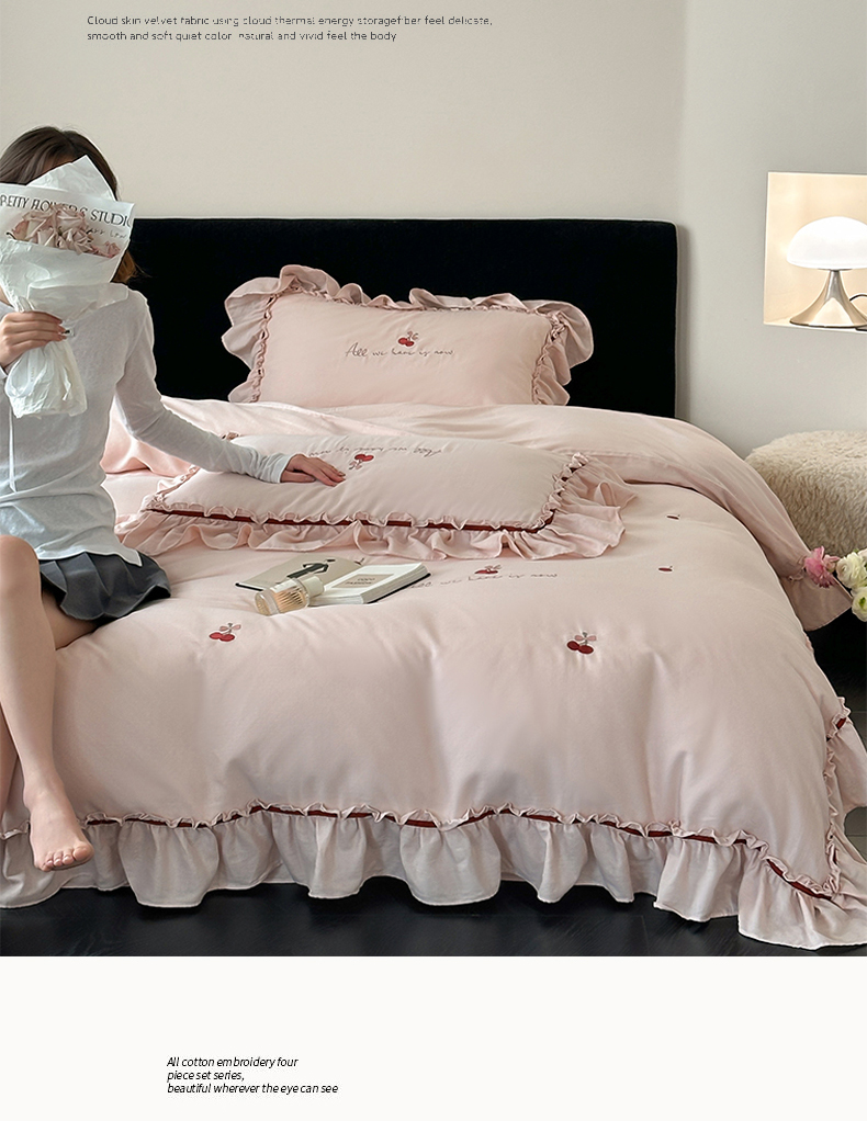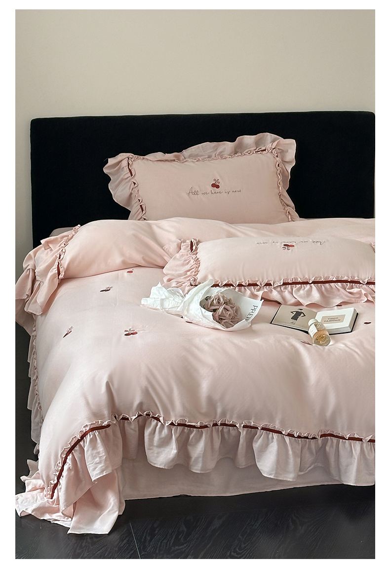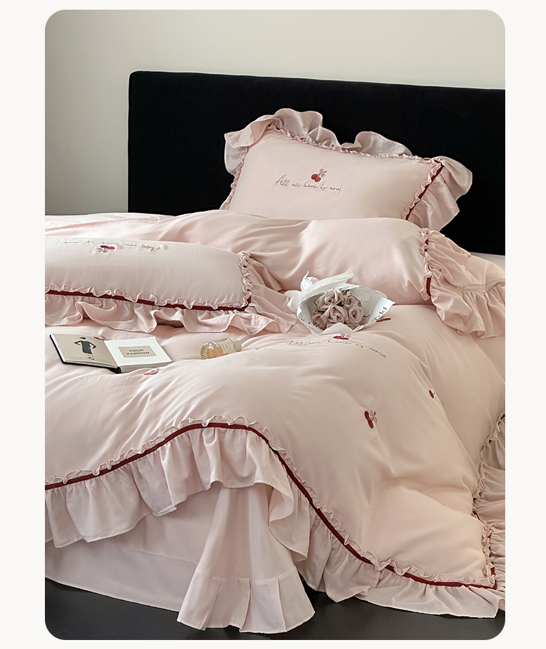 名品优仓 2025新款纯棉水洗棉双层纱提花韩版花边四件套-颜可 颜可一爱坦粉